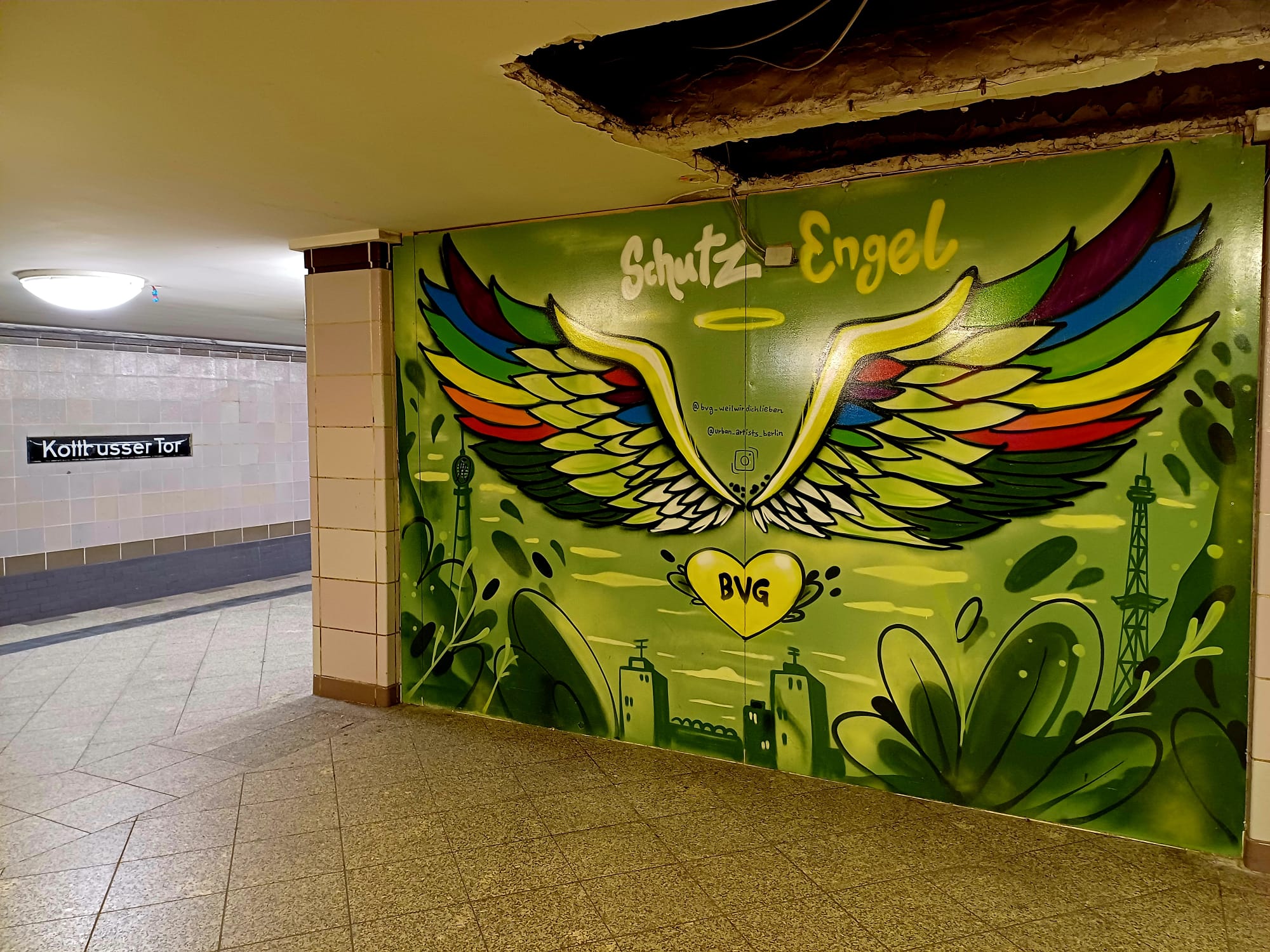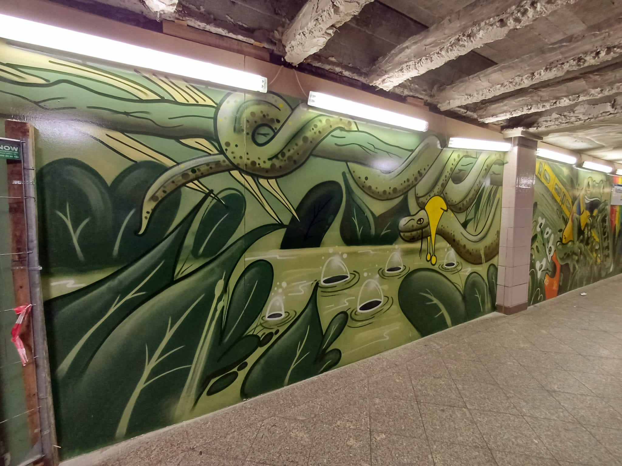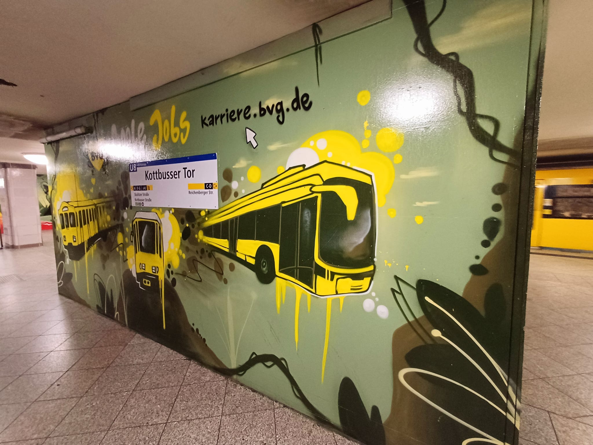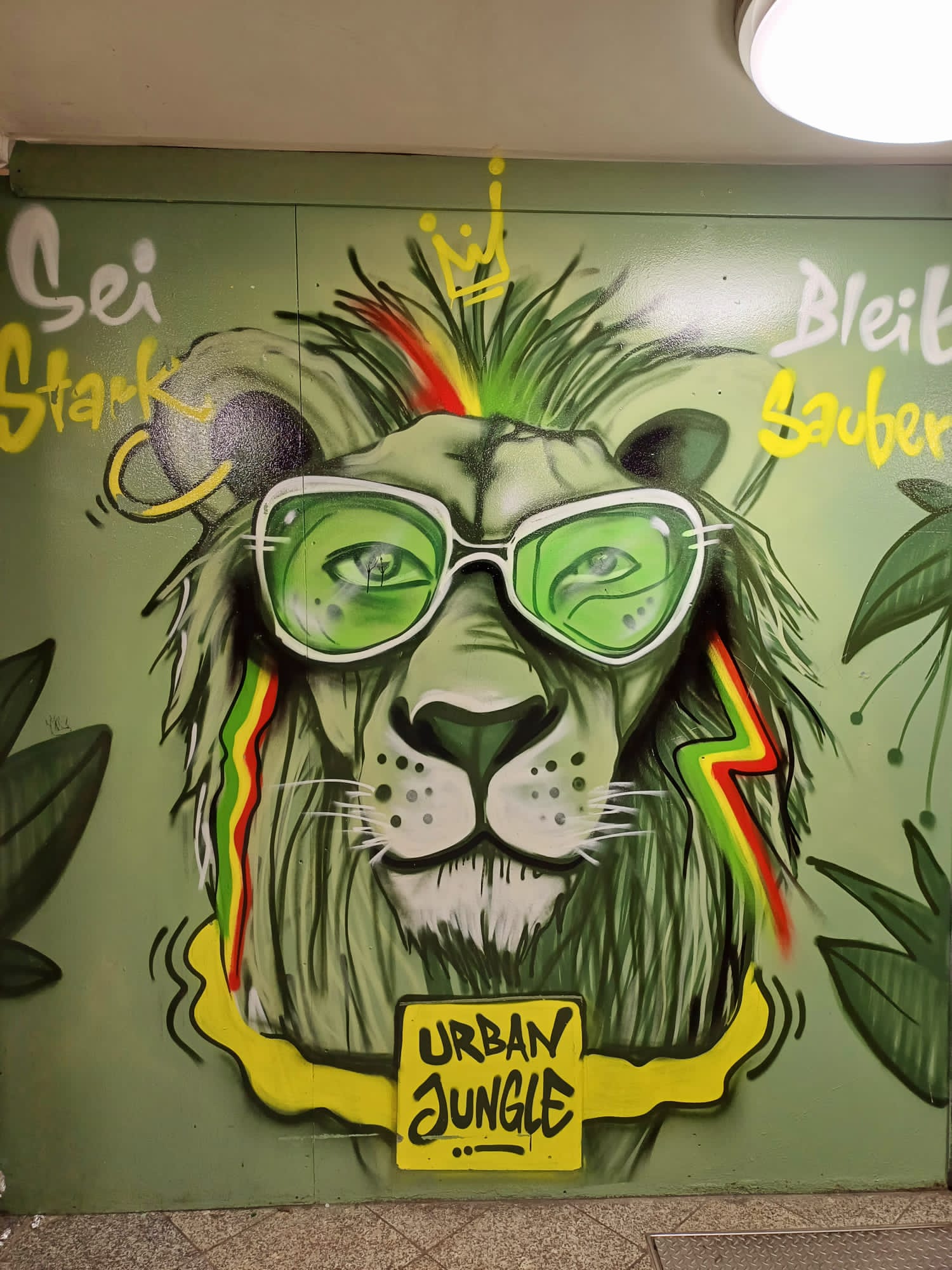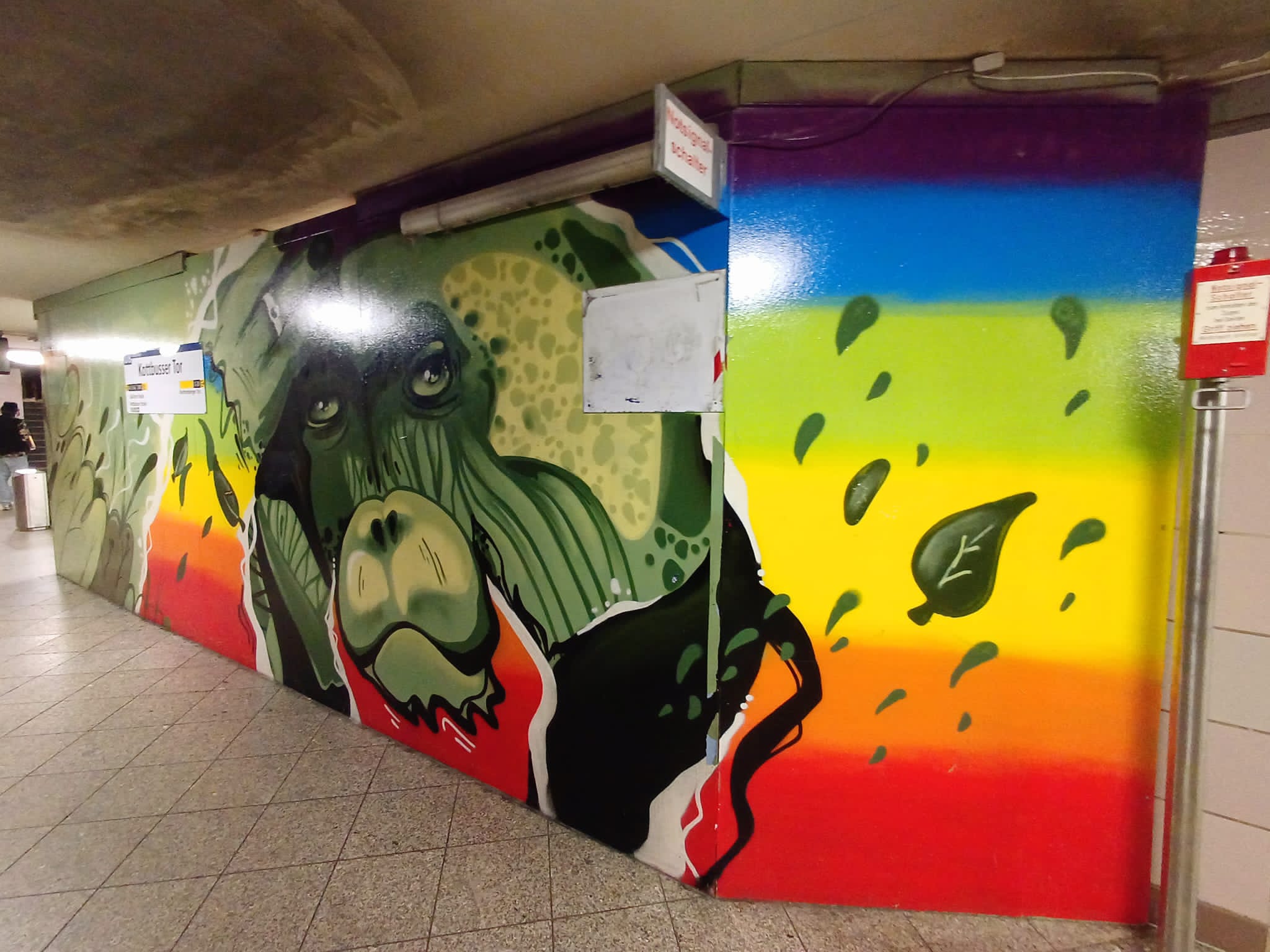 The Kottbusser Tor train station consists of several levels and floors, which were colorfully designed by the artist collective URBAN ARTISTS BERLIN for the Berliner Verkehrsbetriebe (BVG), which is the local public transport department. There are several large-scale concept walls in various locations throughout the underground section which are themed and named „Urban Jungle“.