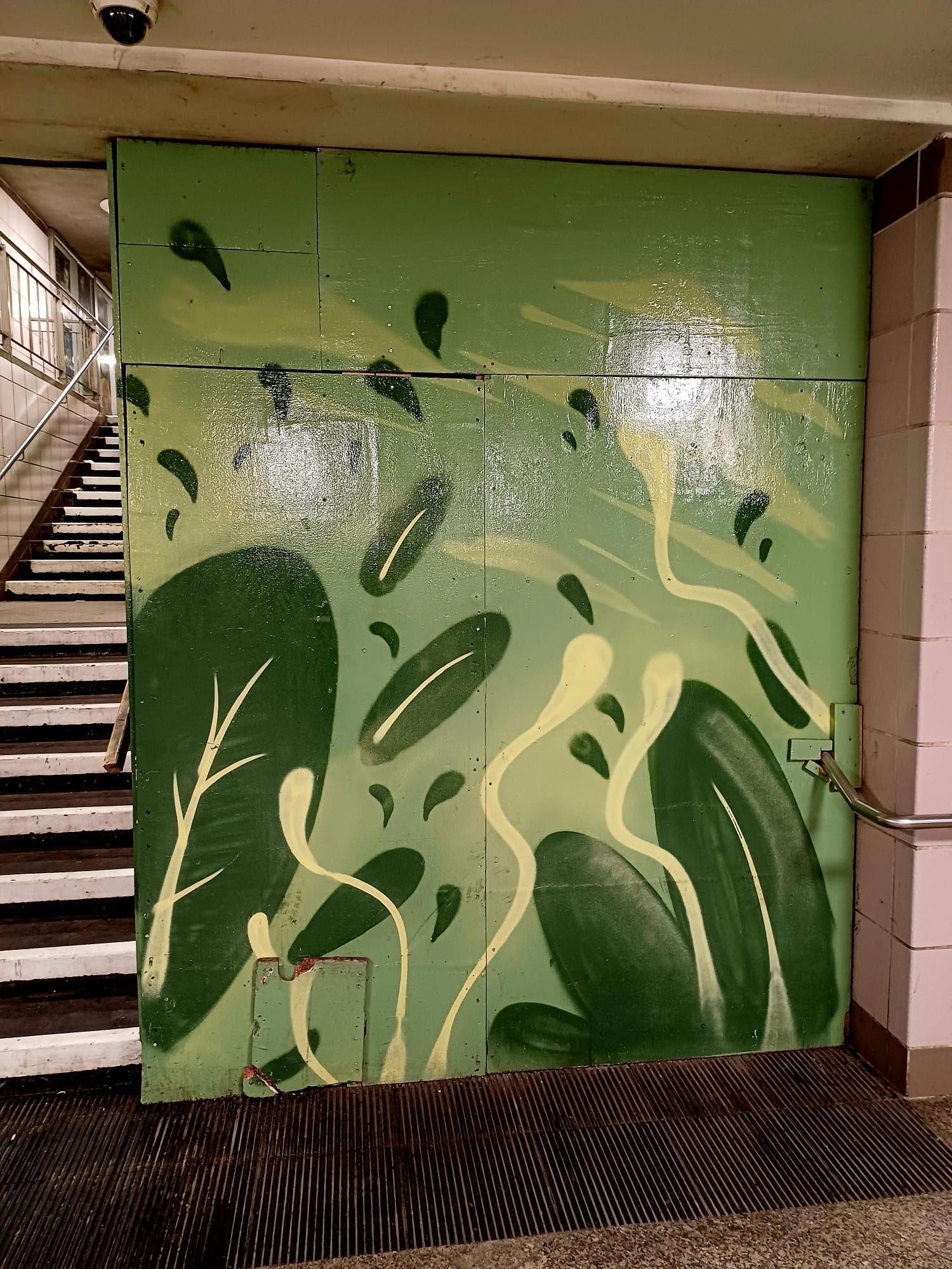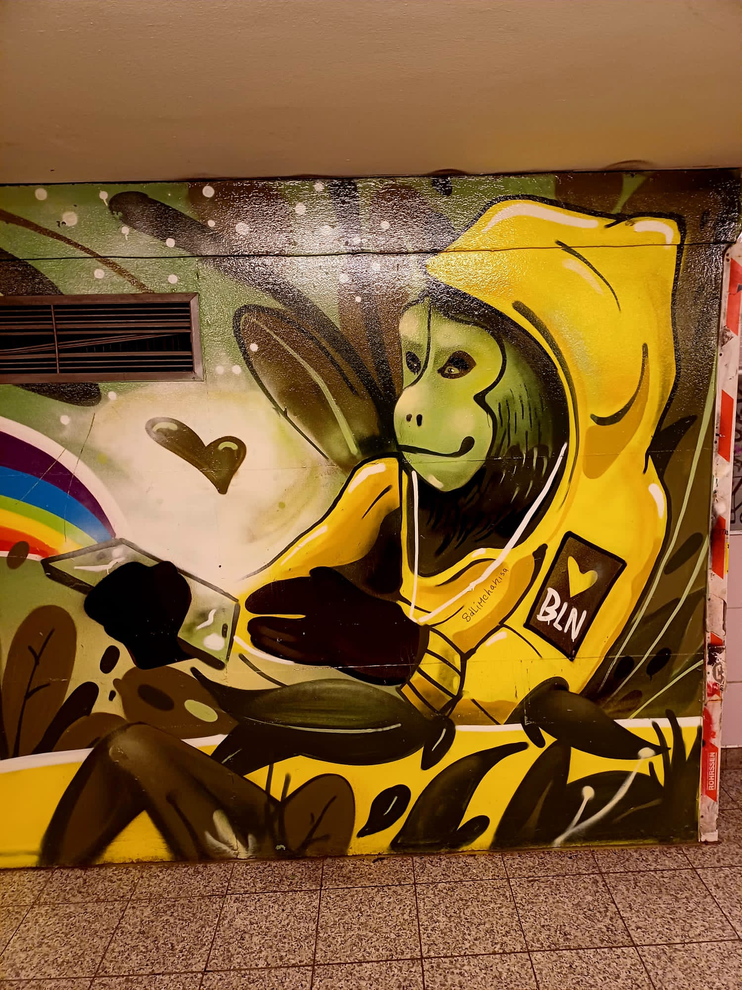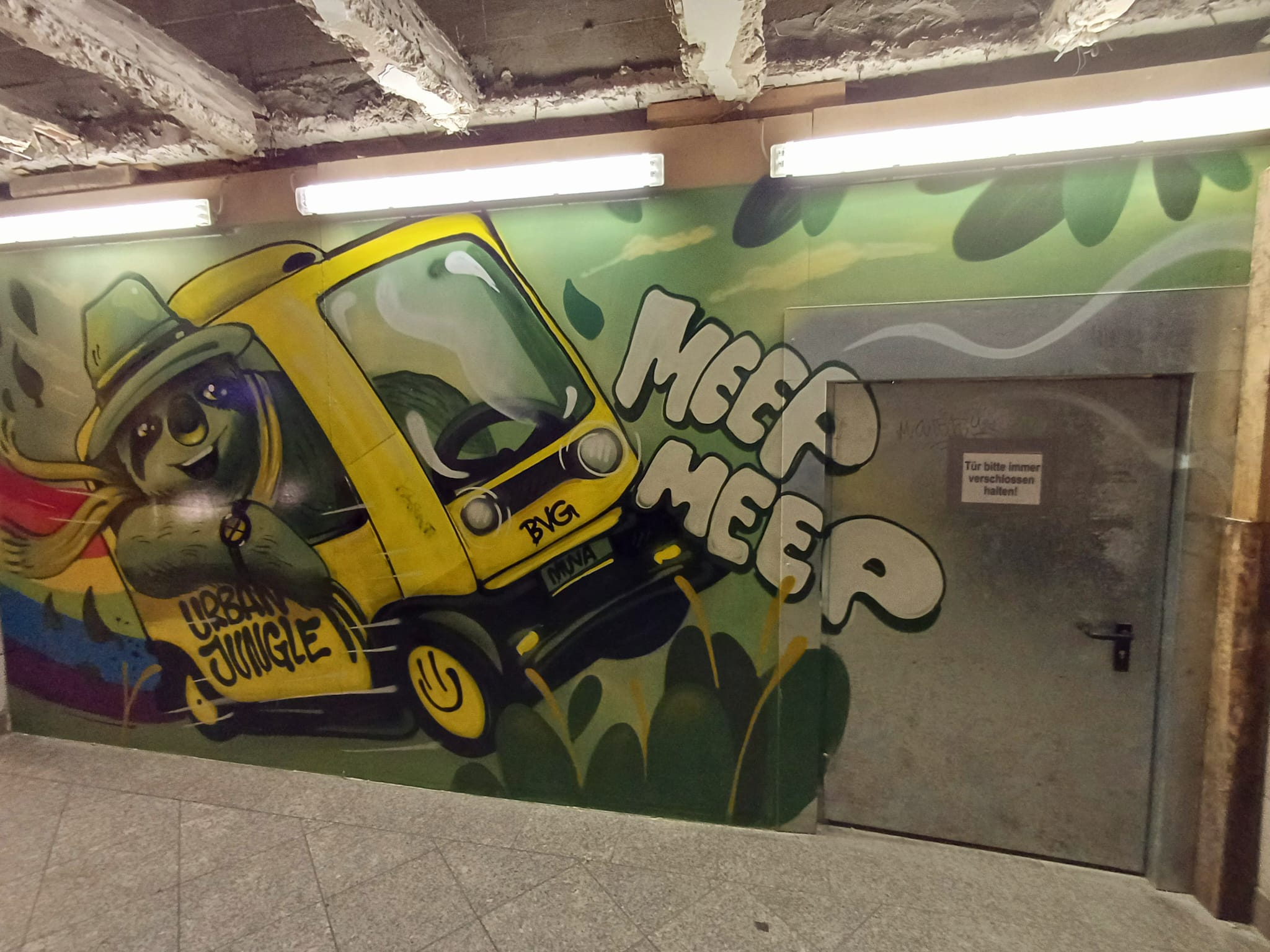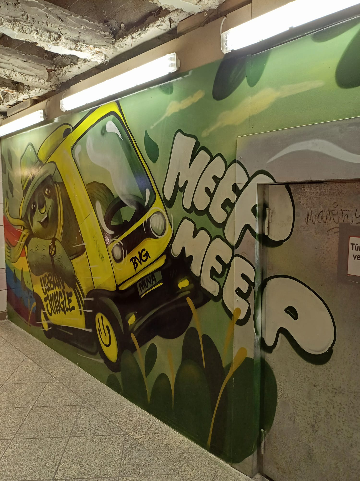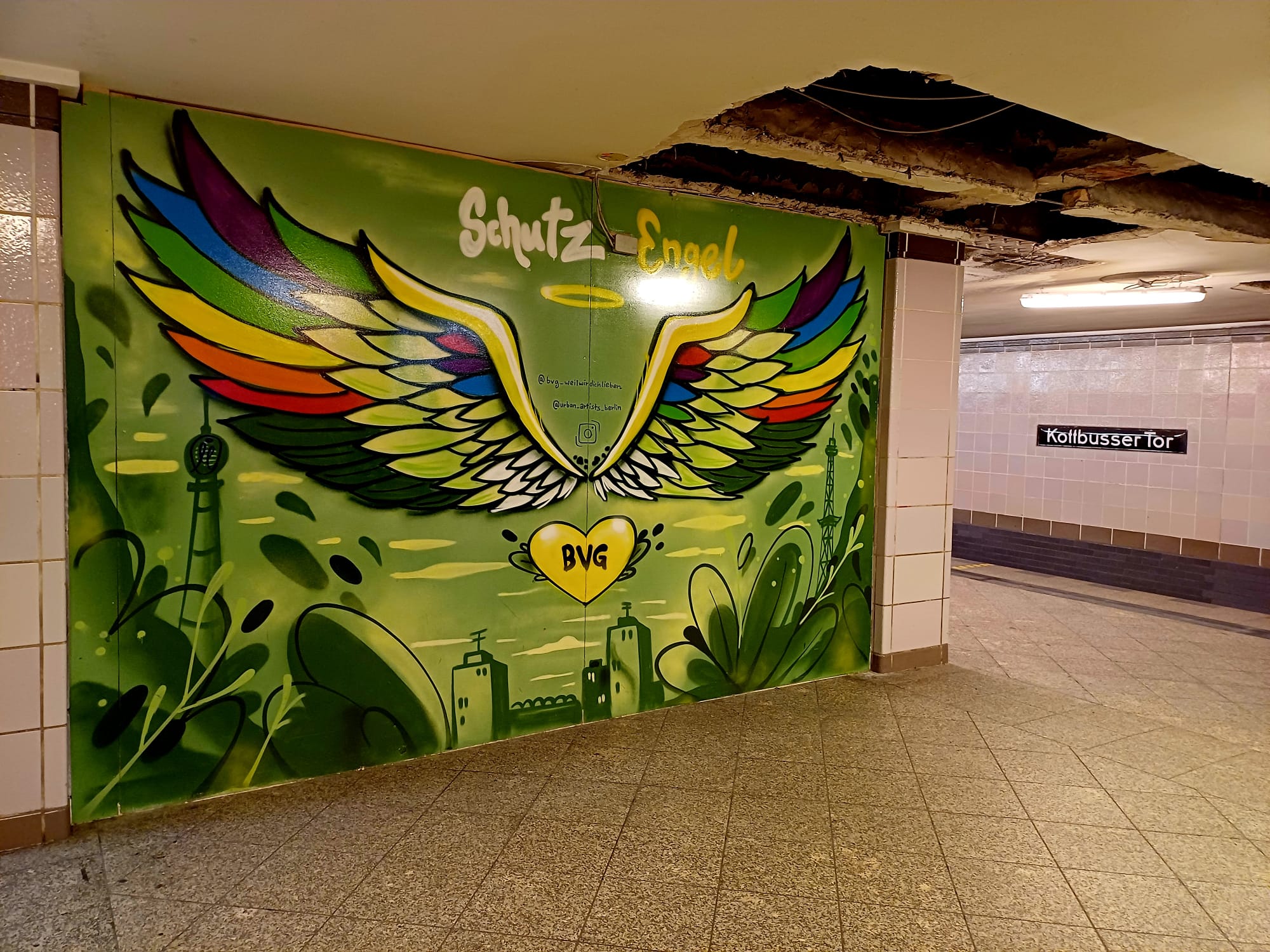 The Kottbusser Tor train station consists of several levels and floors, which were colorfully designed by the artist collective URBAN ARTISTS BERLIN for the Berliner Verkehrsbetriebe (BVG), which is the local public transport department. There are several large-scale concept walls in various locations throughout the underground section which are themed and named „Urban Jungle“.