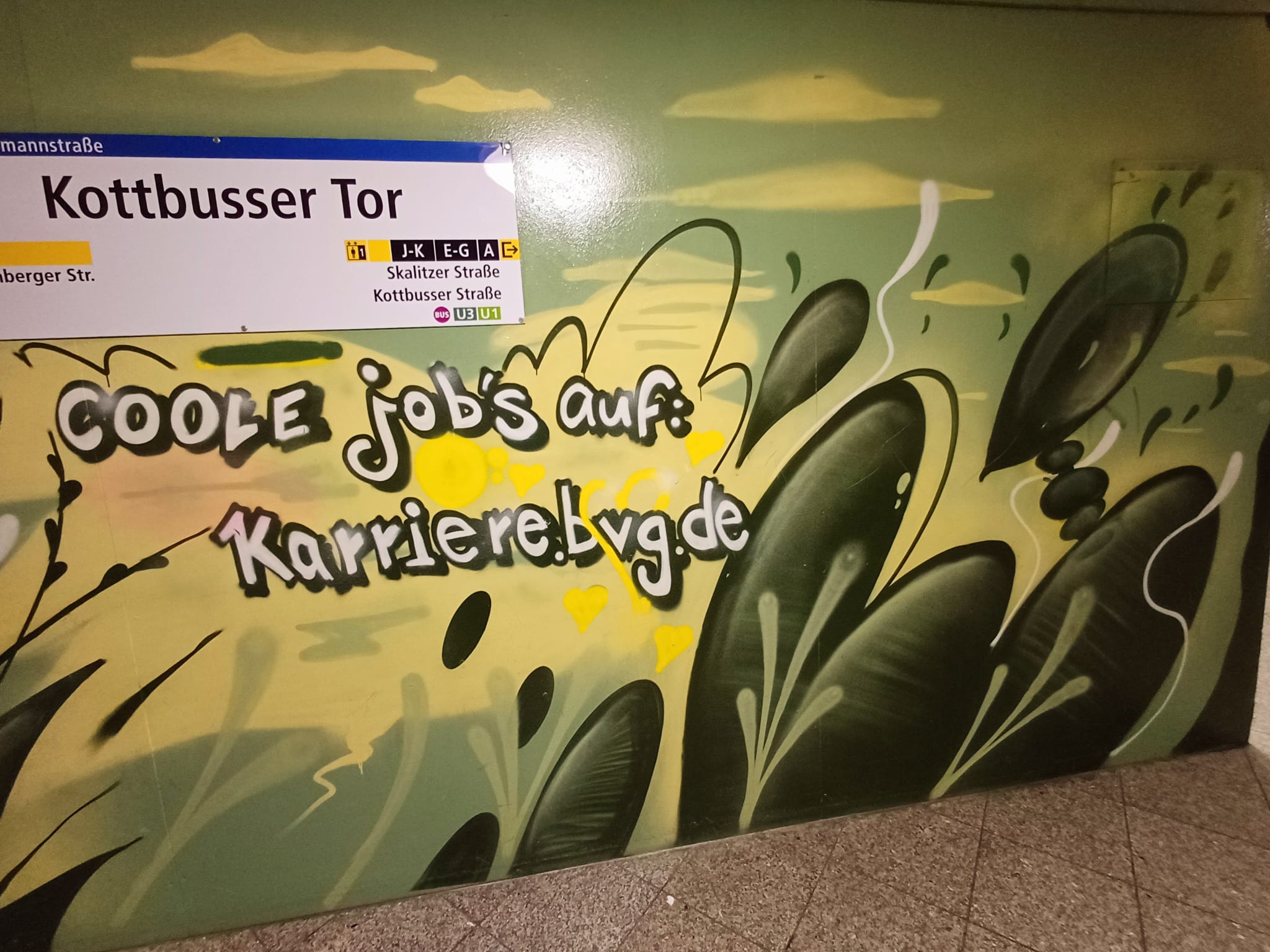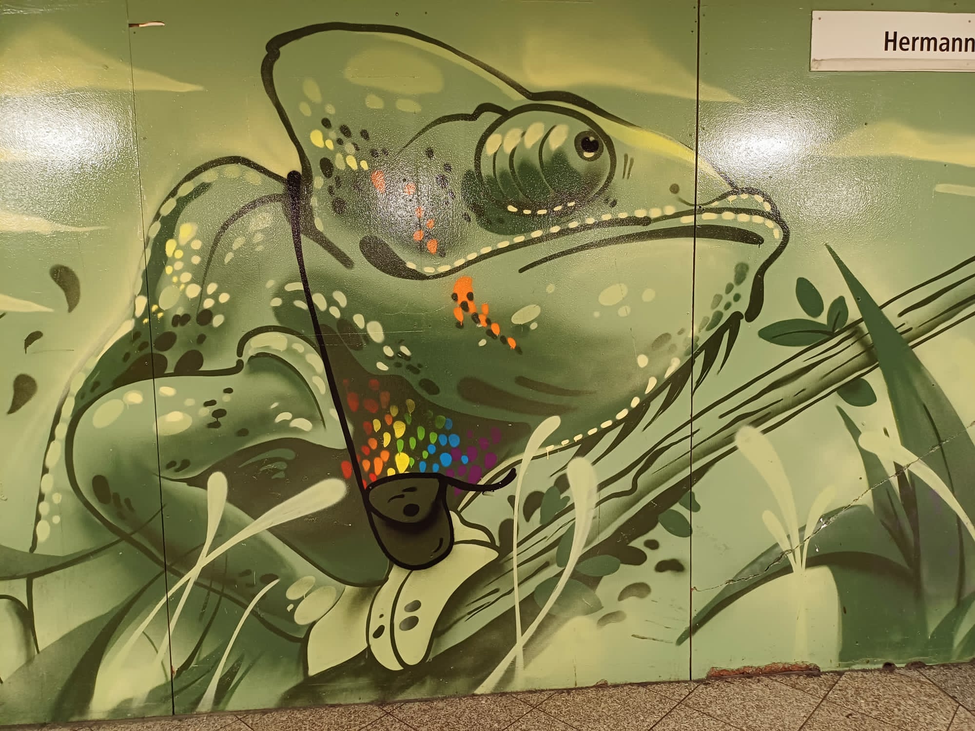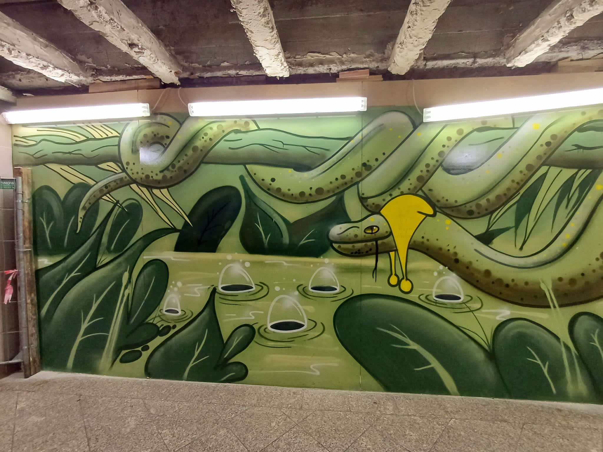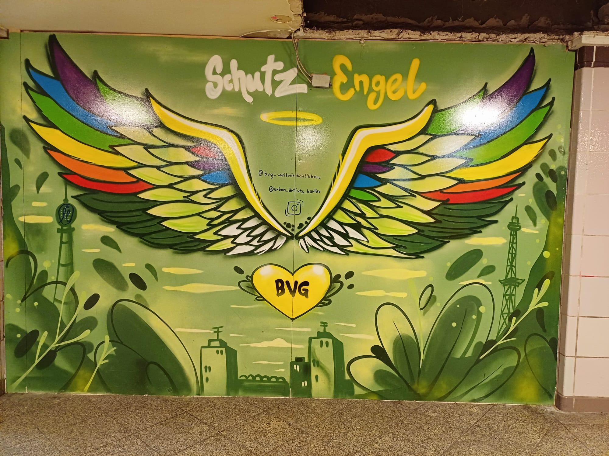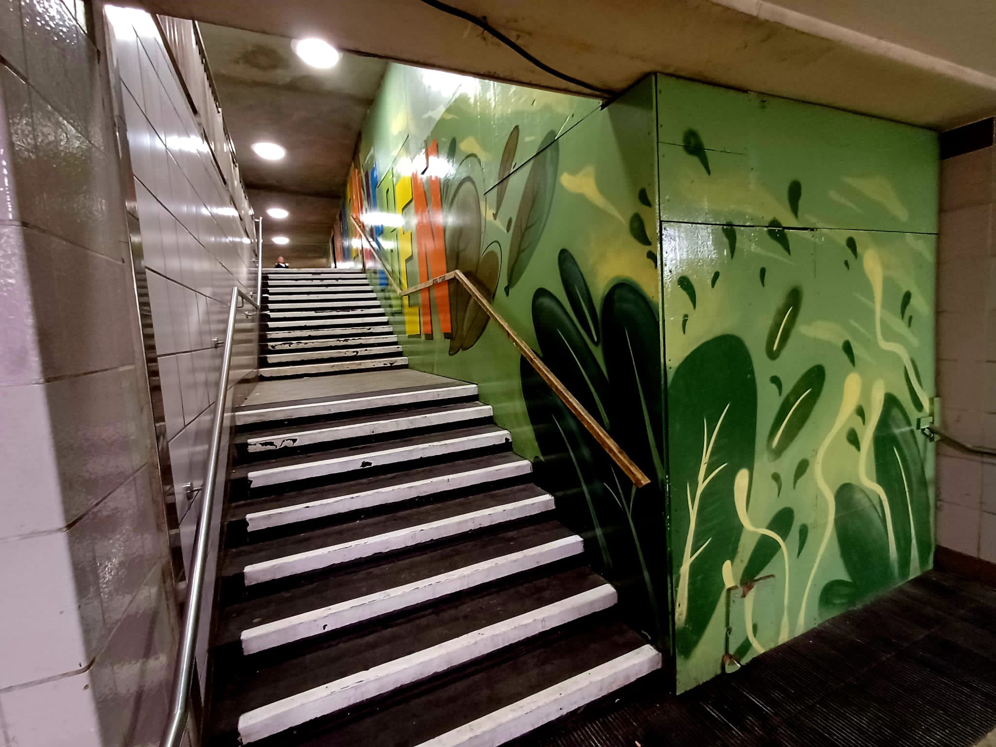 The Kottbusser Tor train station consists of several levels and floors, which were colorfully designed by the artist collective URBAN ARTISTS BERLIN for the Berliner Verkehrsbetriebe (BVG), which is the local public transport department. There are several large-scale concept walls in various locations throughout the underground section which are themed and named „Urban Jungle“.
