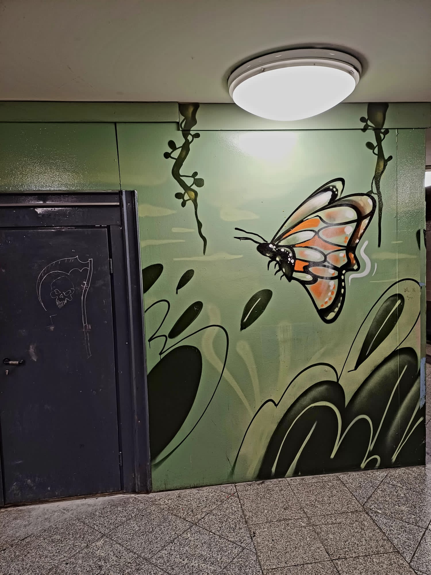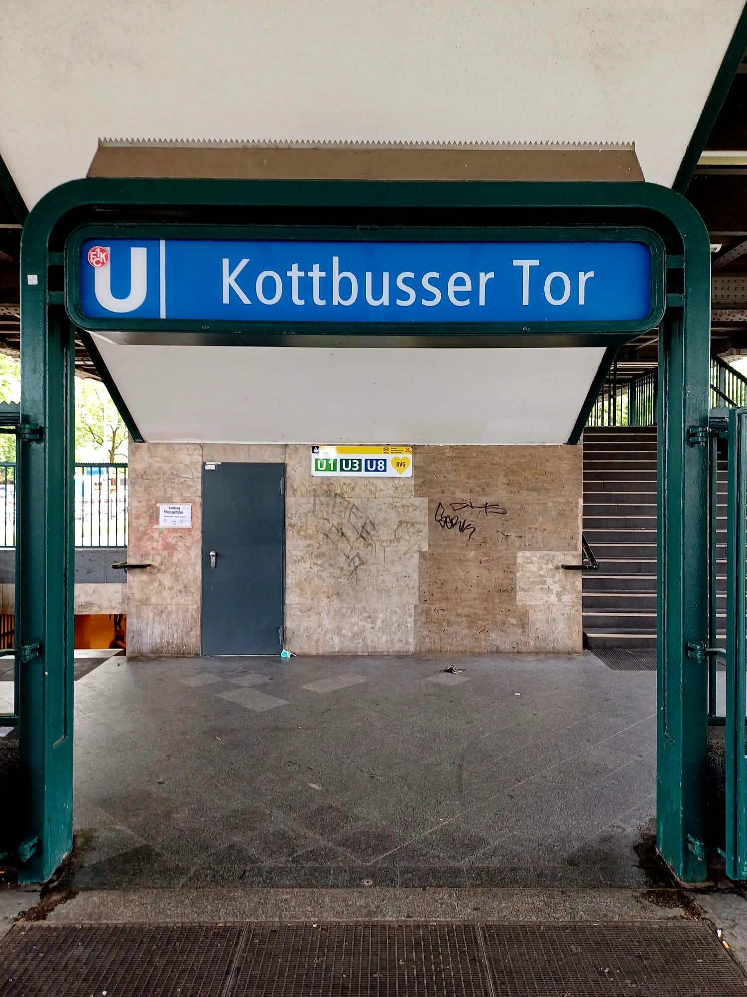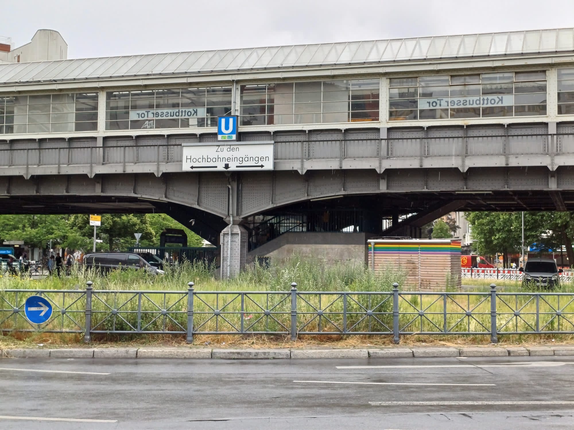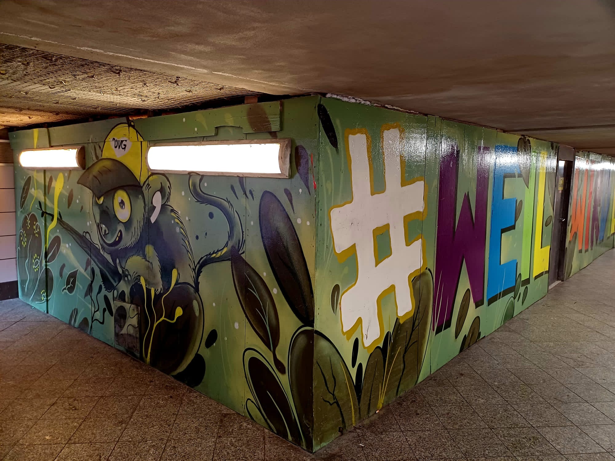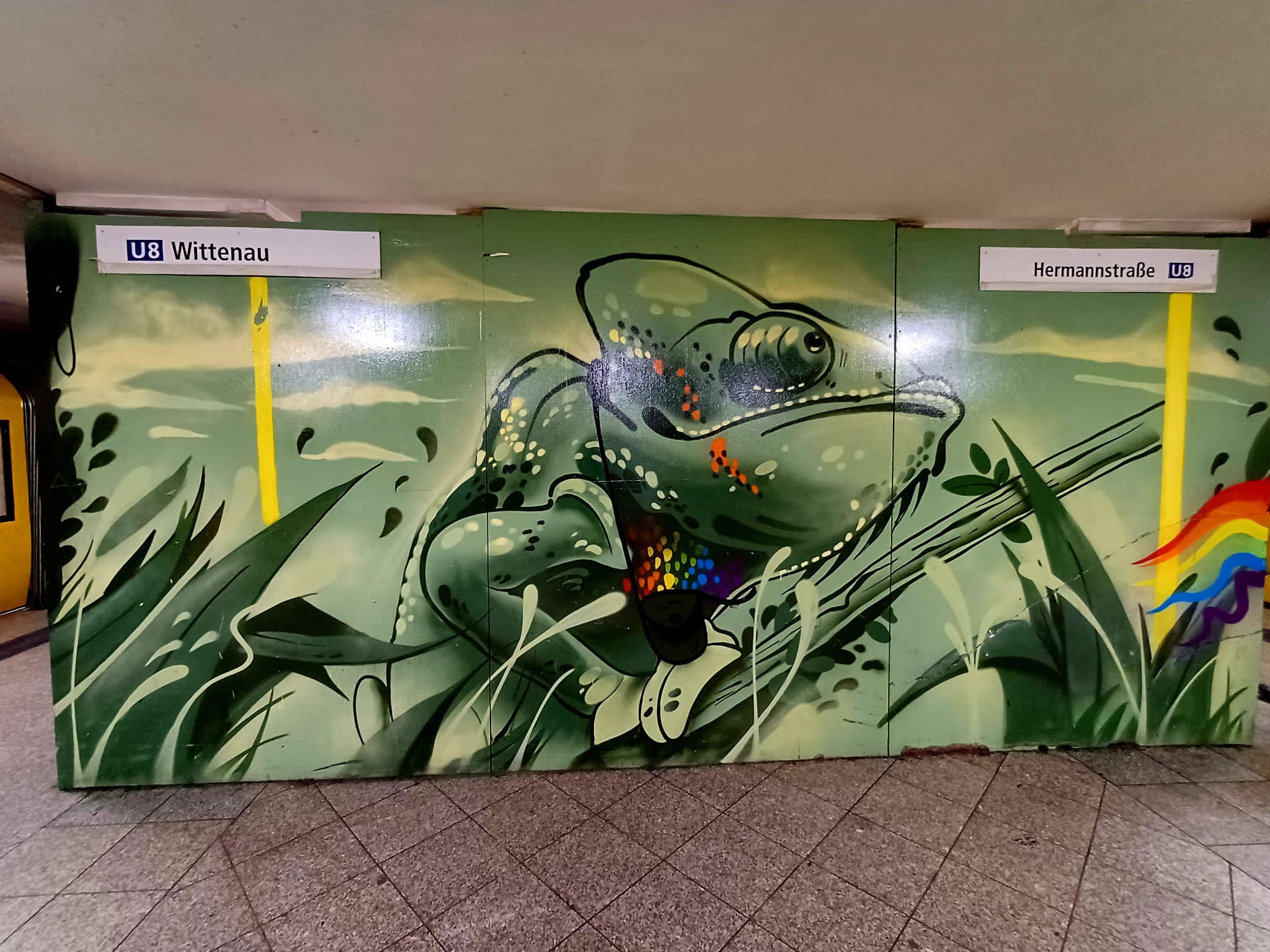 The Kottbusser Tor train station consists of several levels and floors, which were colorfully designed by the artist collective URBAN ARTISTS BERLIN for the Berliner Verkehrsbetriebe (BVG), which is the local public transport department. There are several large-scale concept walls in various locations throughout the underground section which are themed and named „Urban Jungle“.