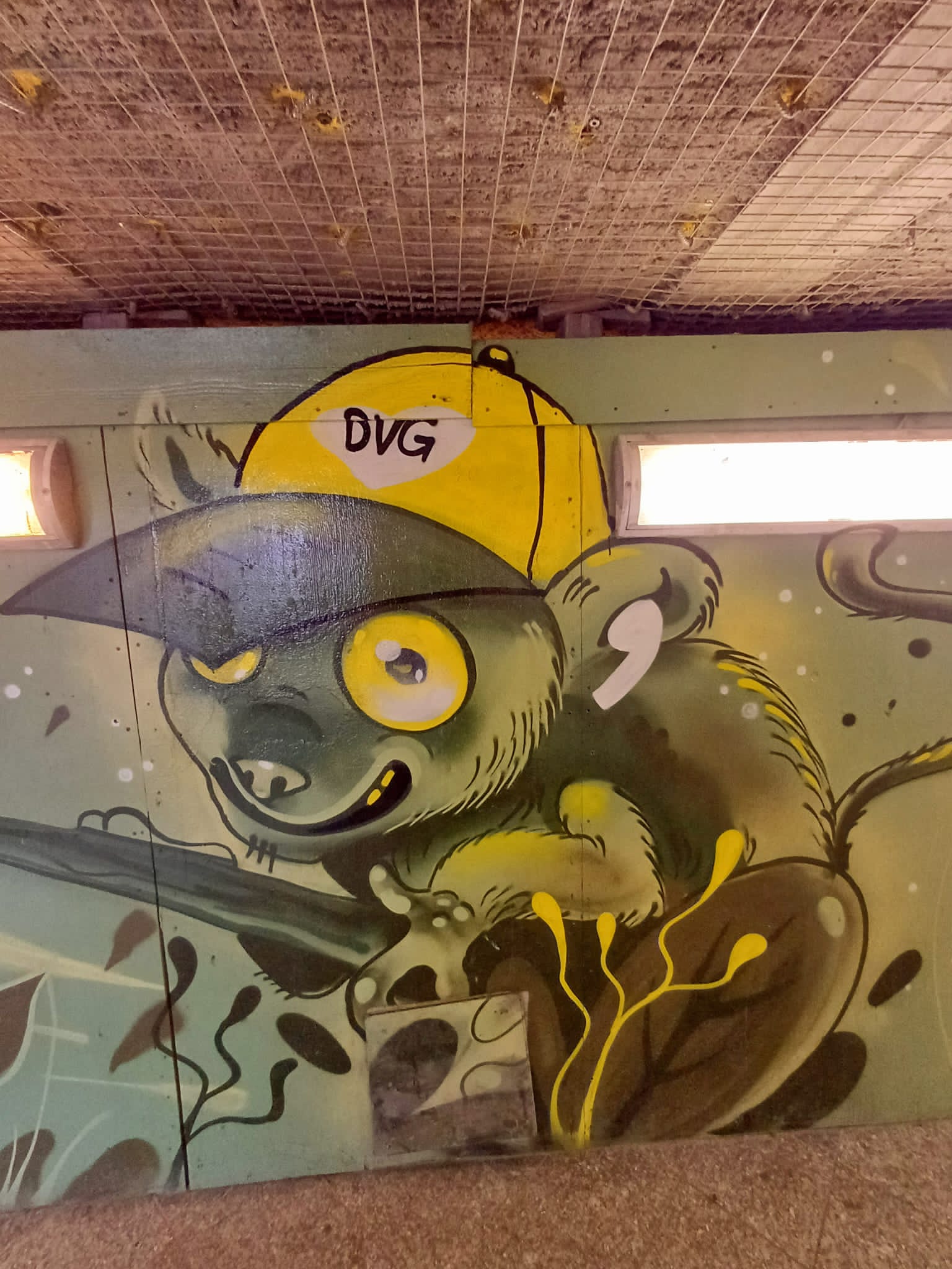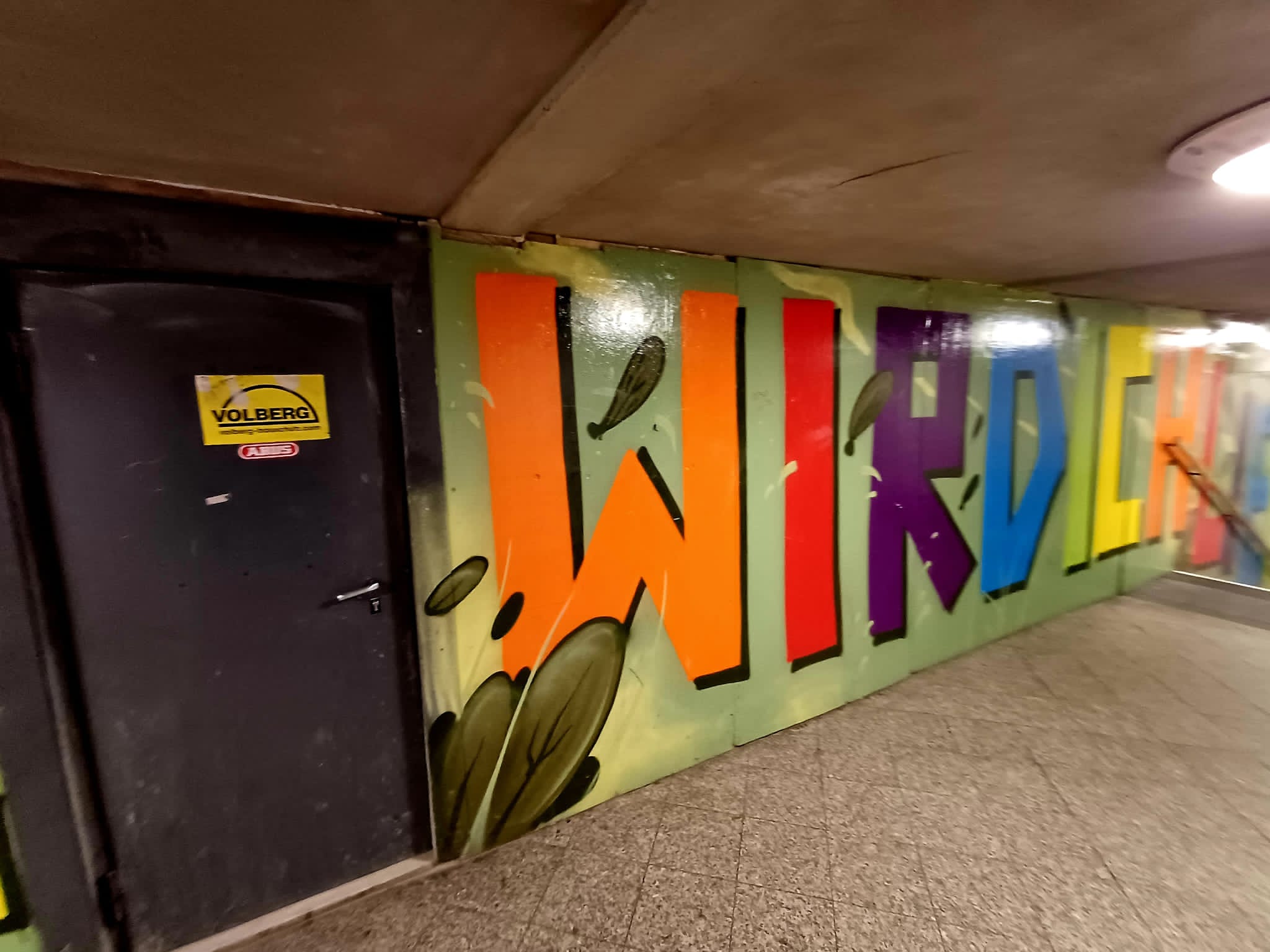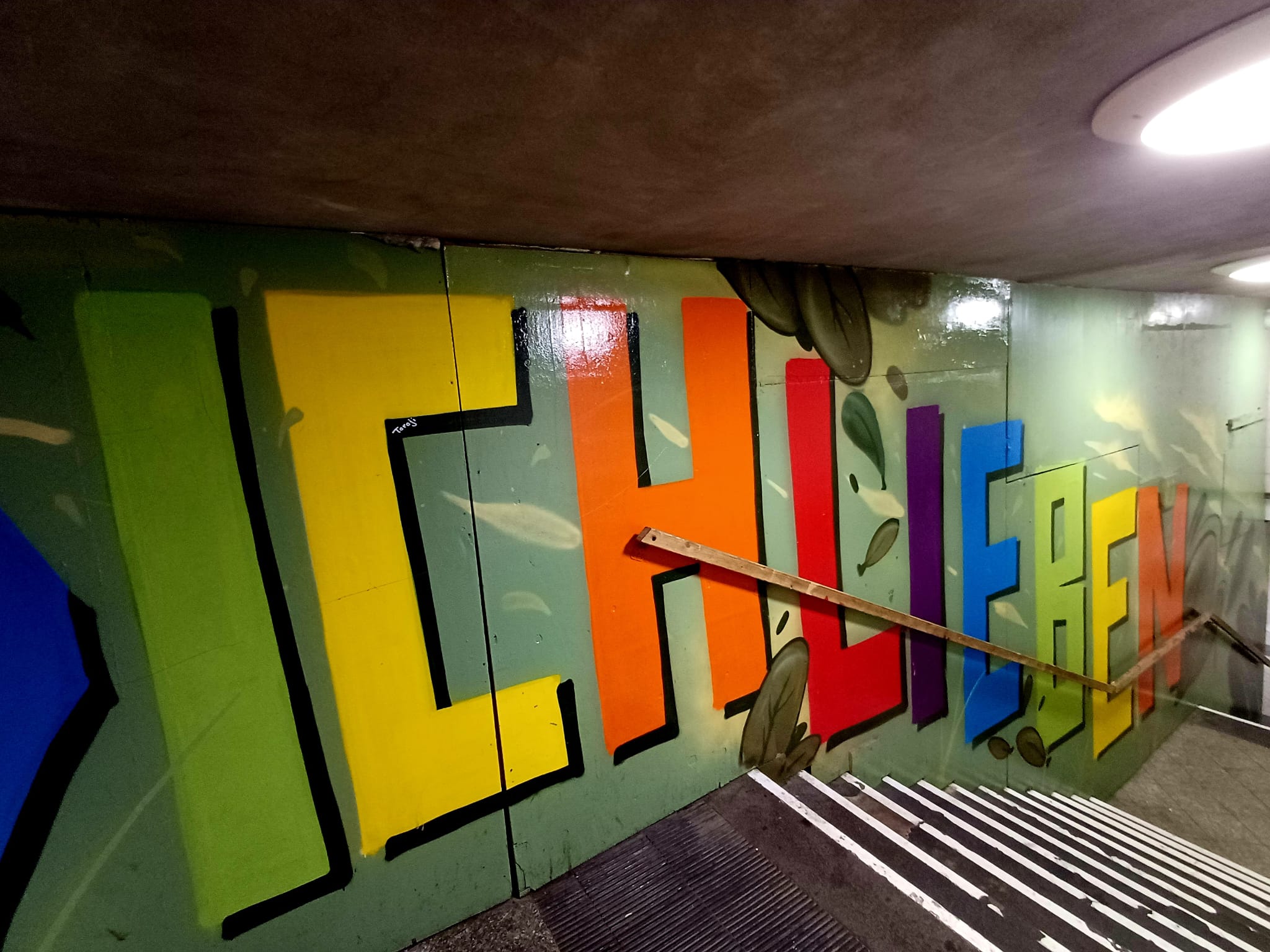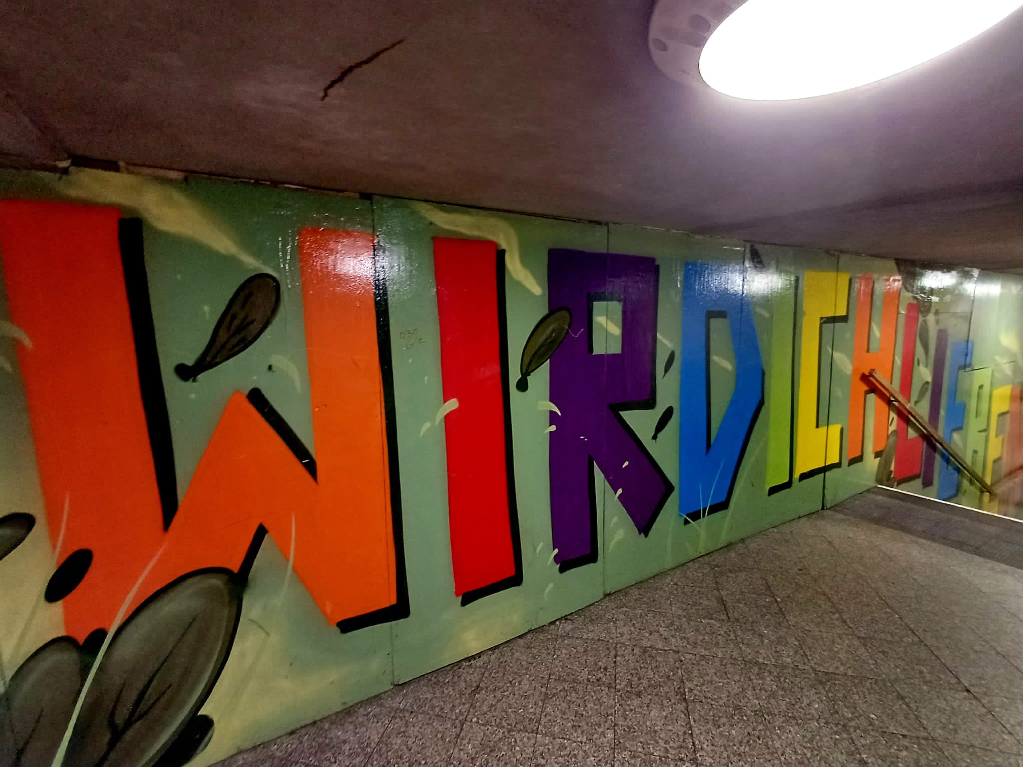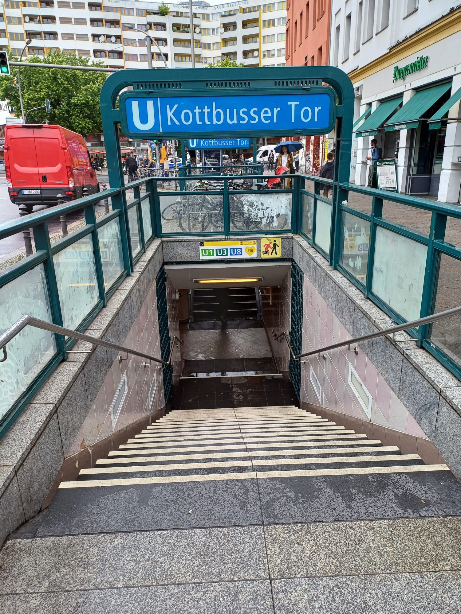 The Kottbusser Tor train station consists of several levels and floors, which were colorfully designed by the artist collective URBAN ARTISTS BERLIN for the Berliner Verkehrsbetriebe (BVG), which is the local public transport department. There are several large-scale concept walls in various locations throughout the underground section which are themed and named „Urban Jungle“.