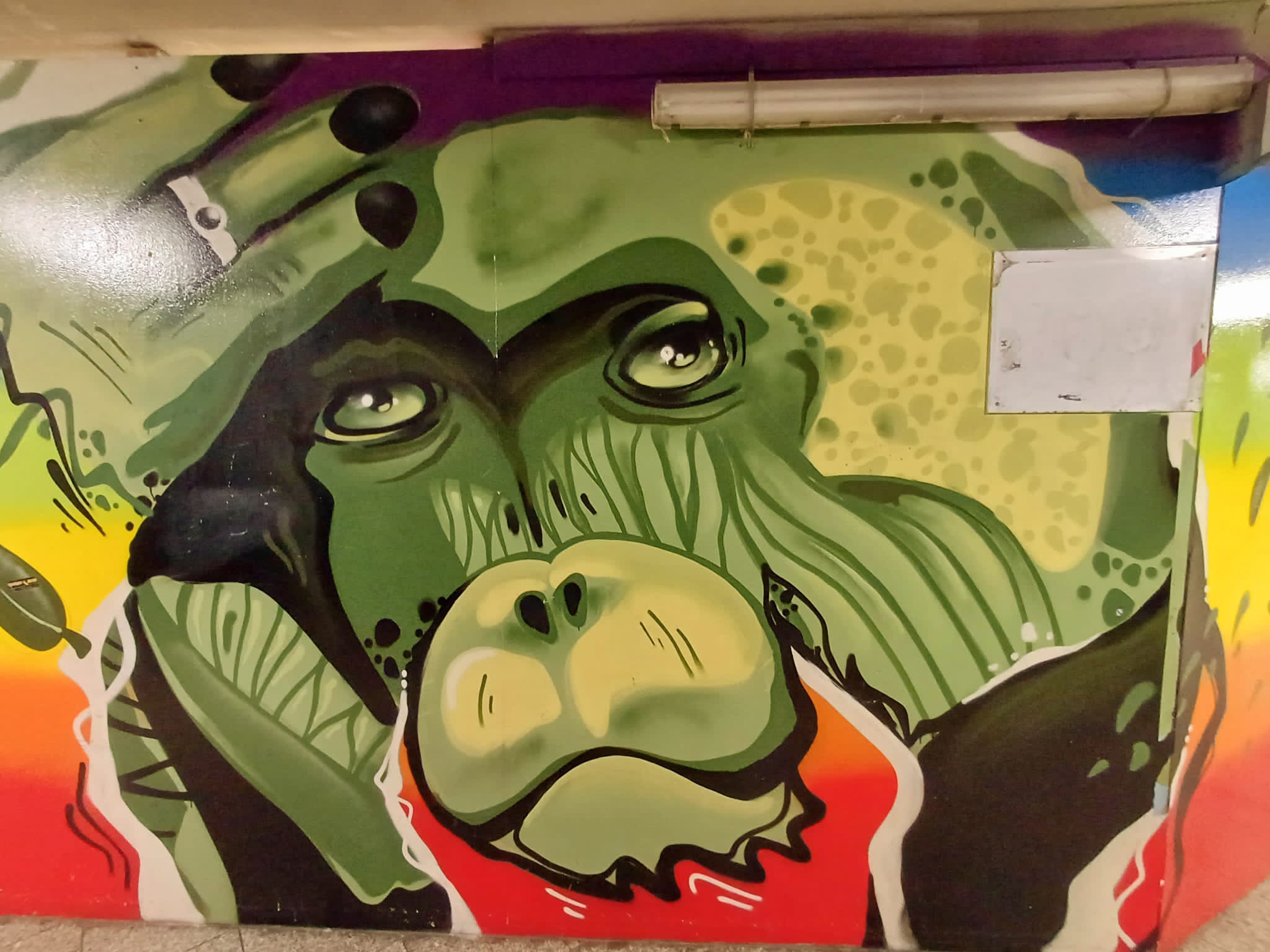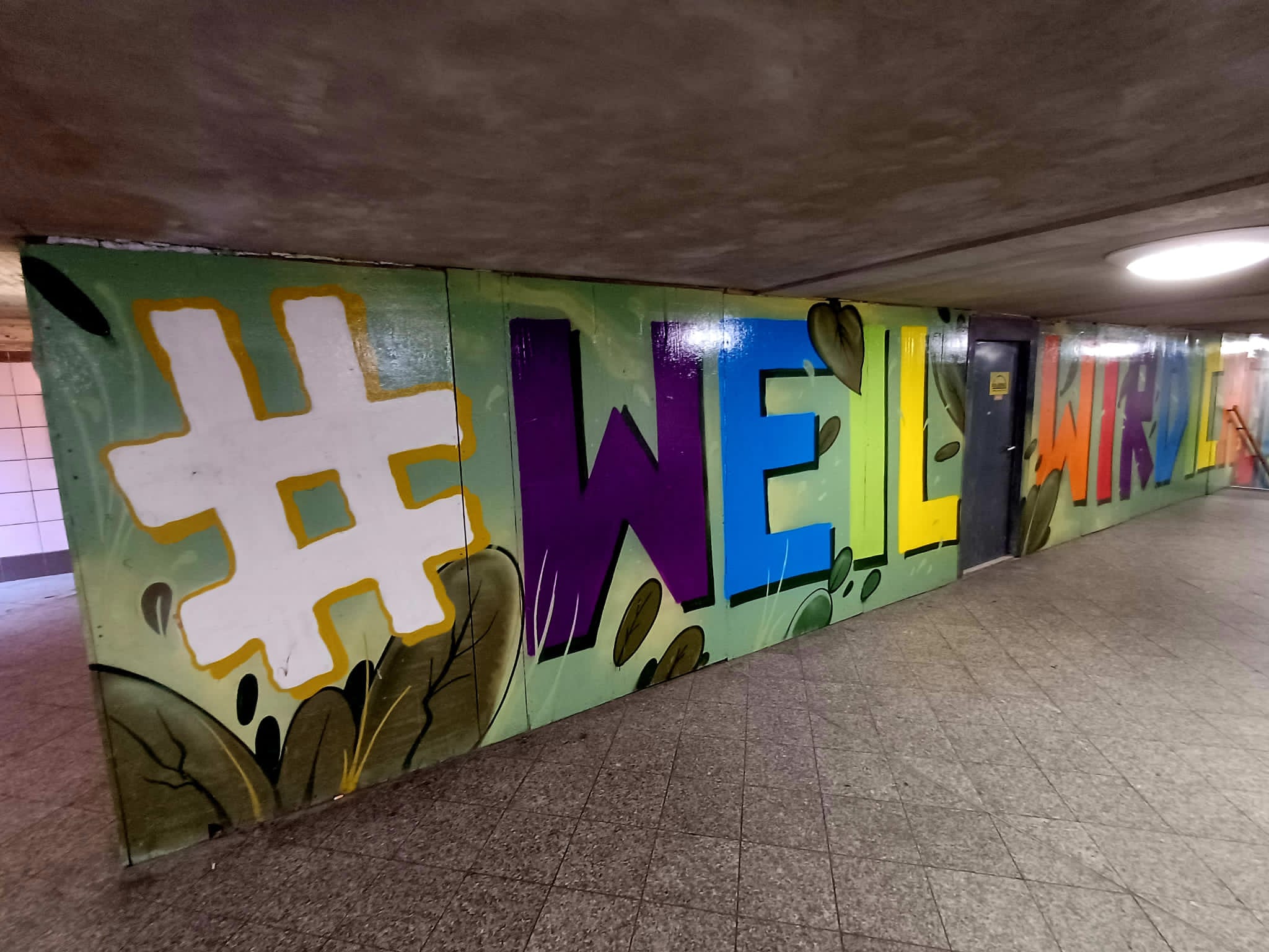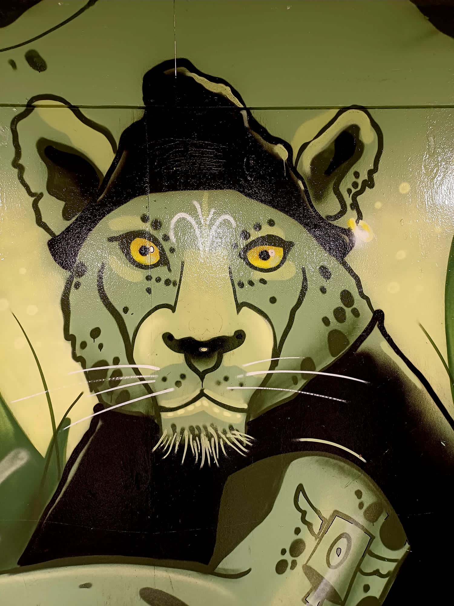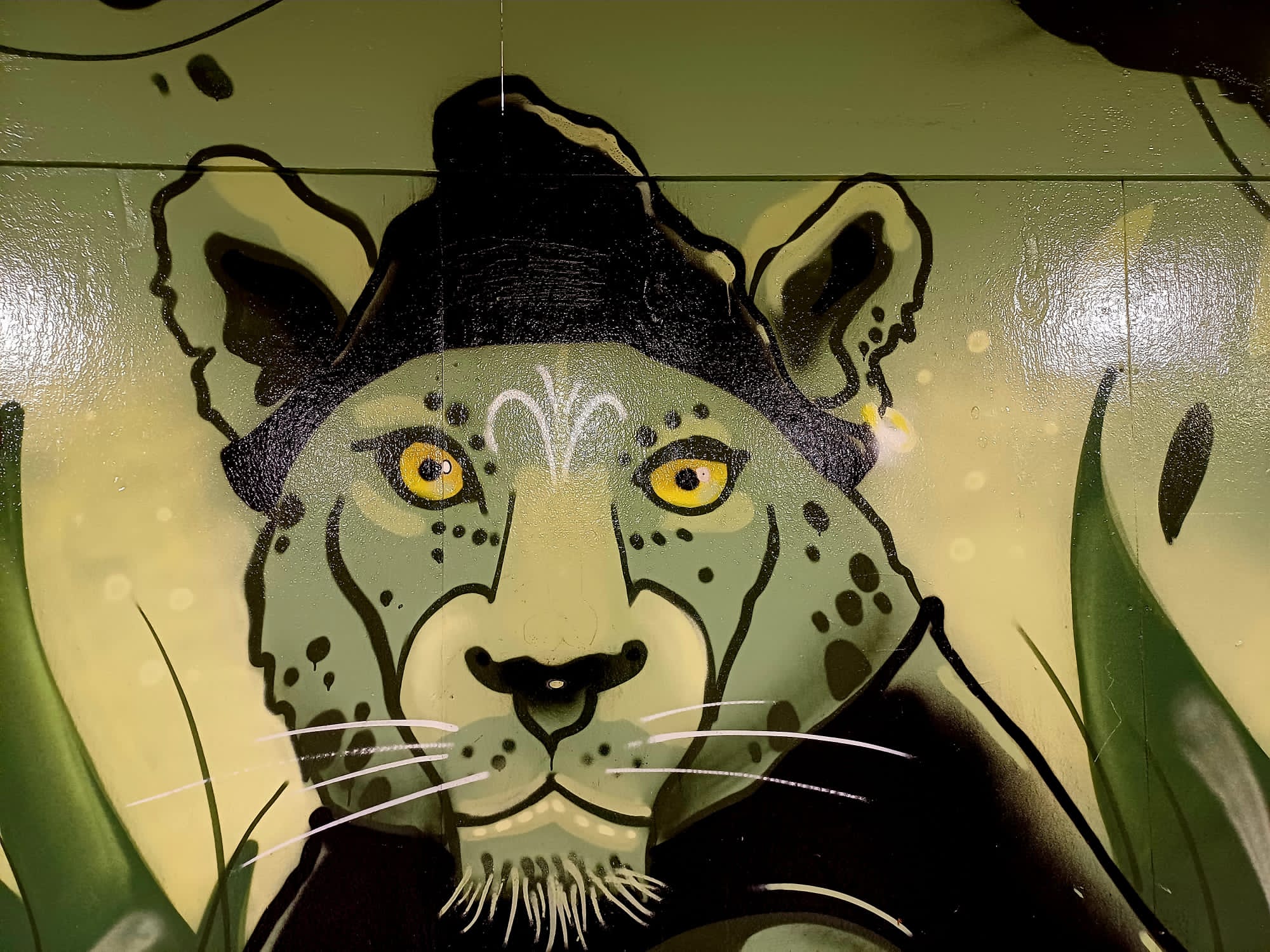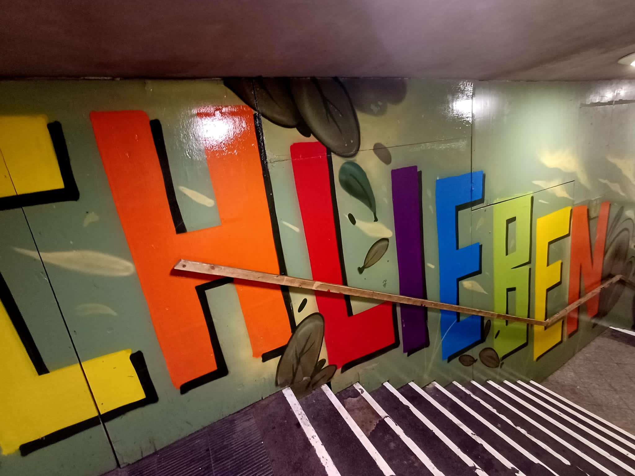 The Kottbusser Tor train station consists of several levels and floors, which were colorfully designed by the artist collective URBAN ARTISTS BERLIN for the Berliner Verkehrsbetriebe (BVG), which is the local public transport department. There are several large-scale concept walls in various locations throughout the underground section which are themed and named „Urban Jungle“.