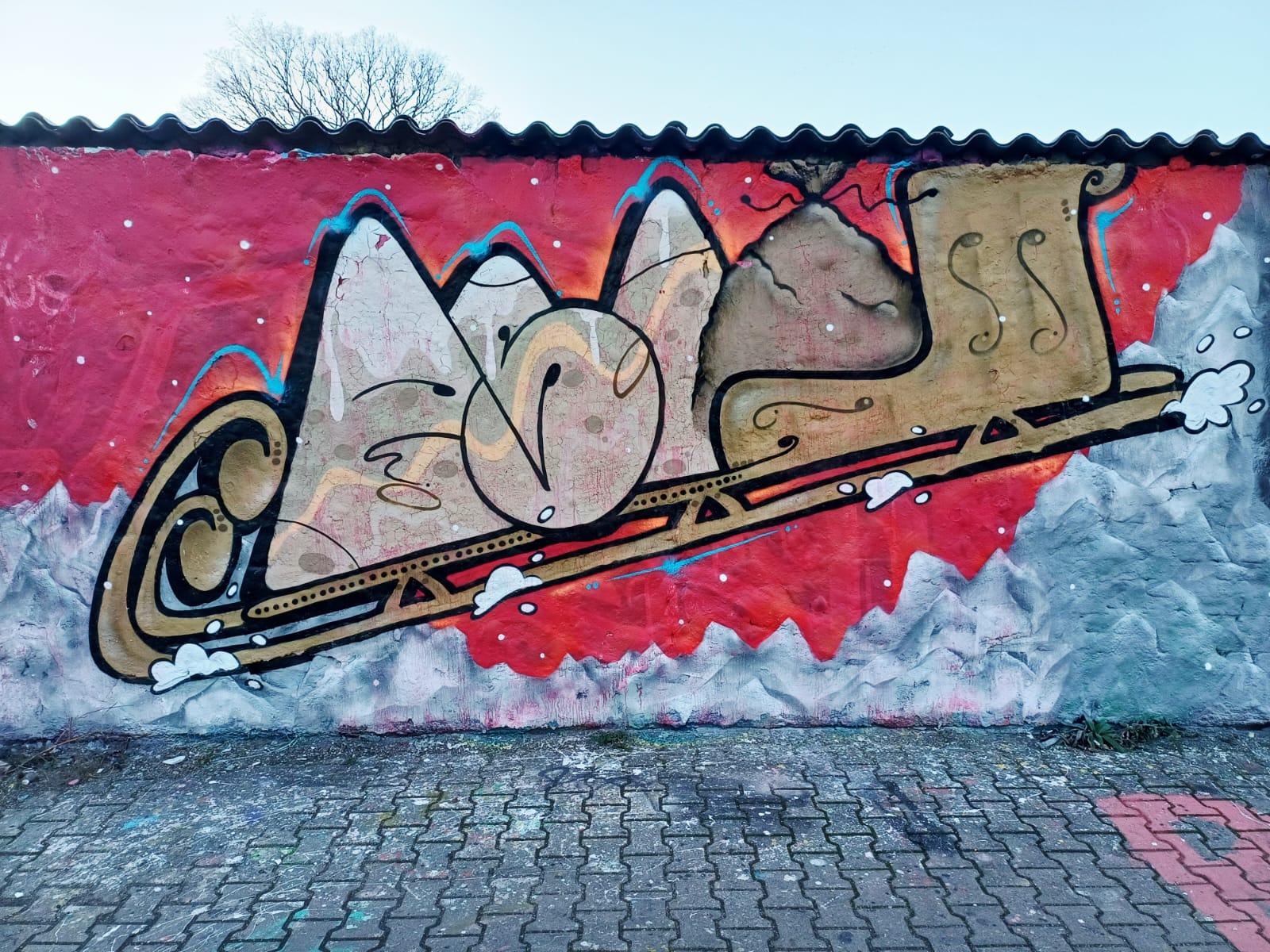 This great Christmas wall was made from left to right by ESTO, HOOMS, ACKO and AMPER. The wall was initially started on 23rd of December in 2023, by the time the artists wanted to continue on 26th of December, two artworks have been already over painted by other graffiti. So ESTO and HOOMS made completely new artworks on the left part. The artworks from ACKO and AMPER were still there, but they made some coloful upgrades during the second session.