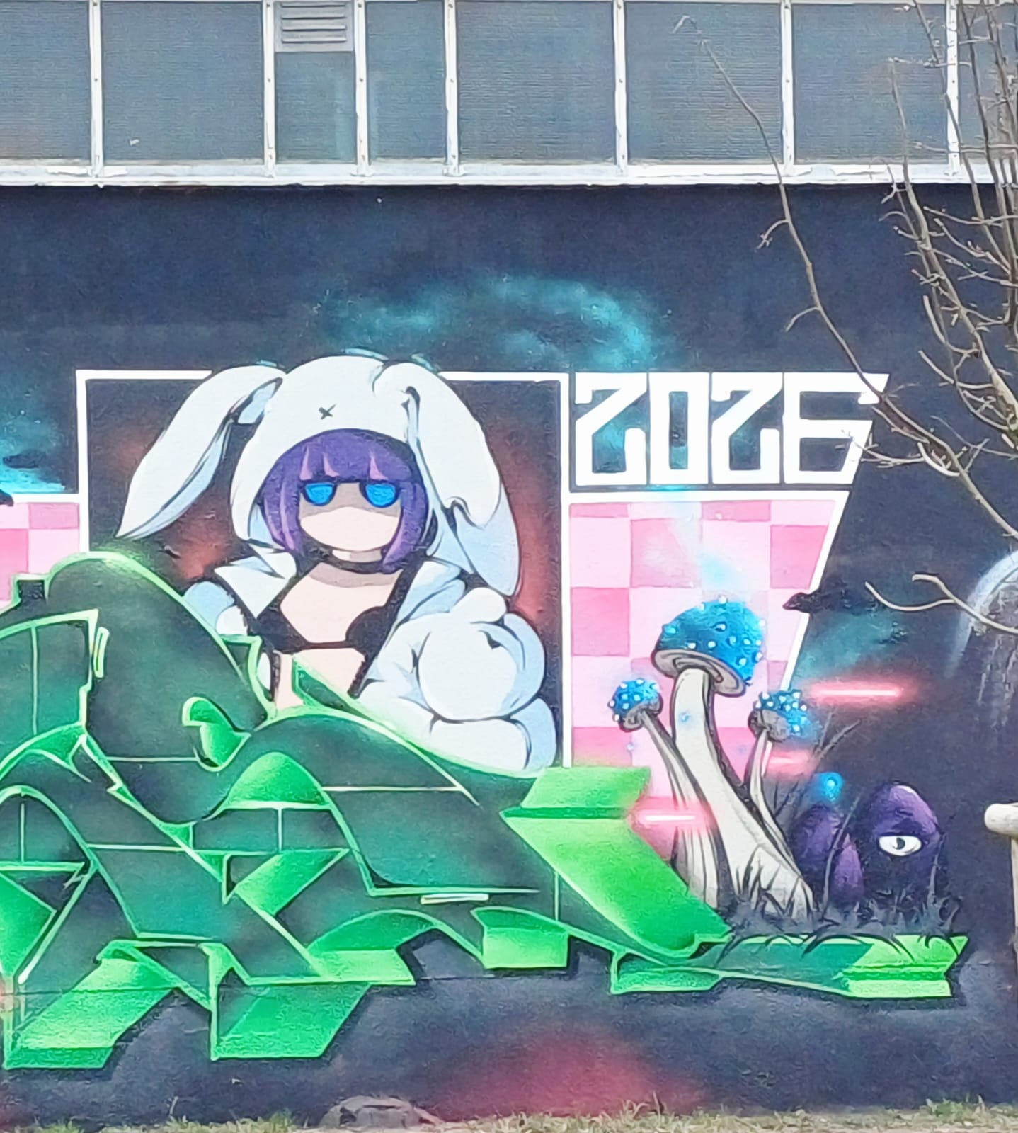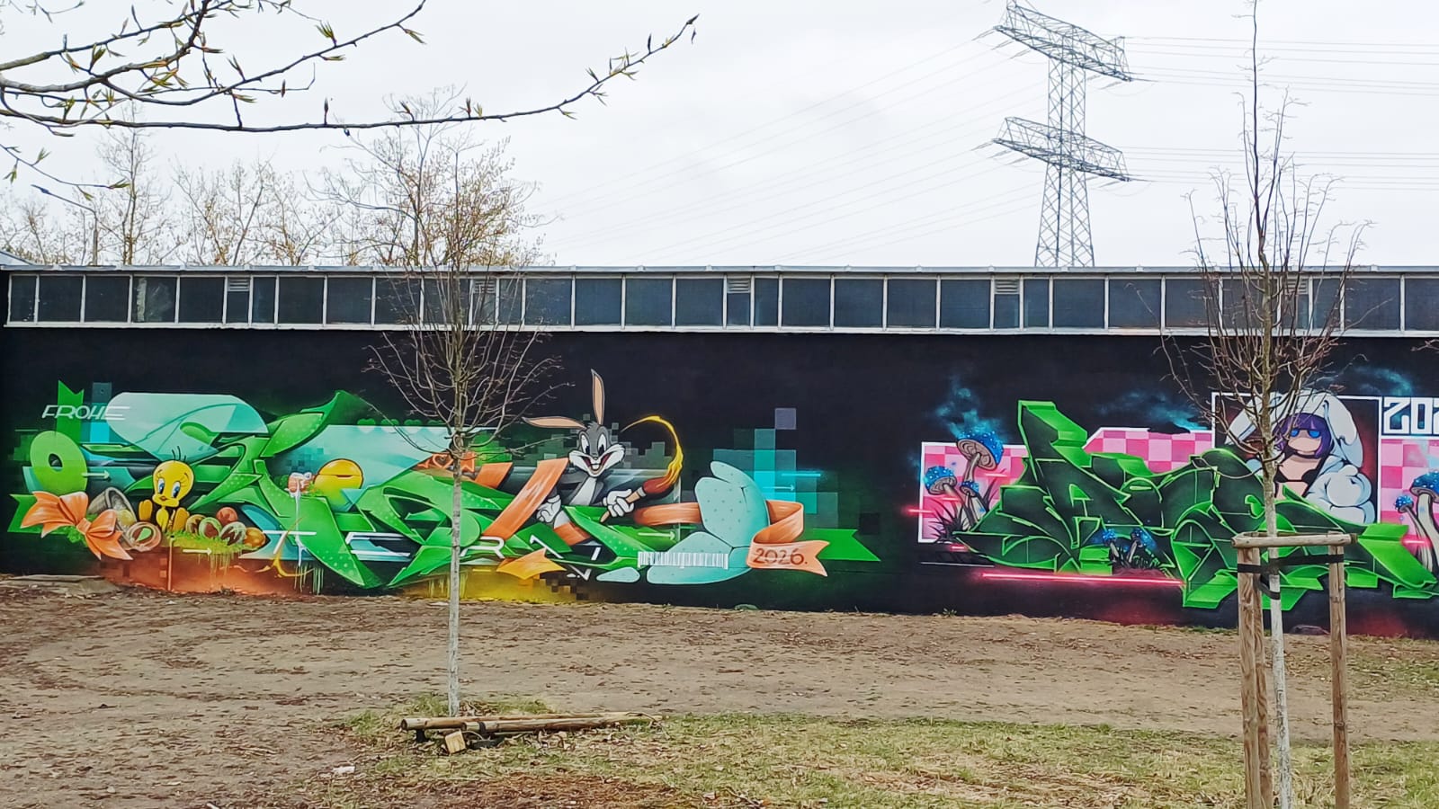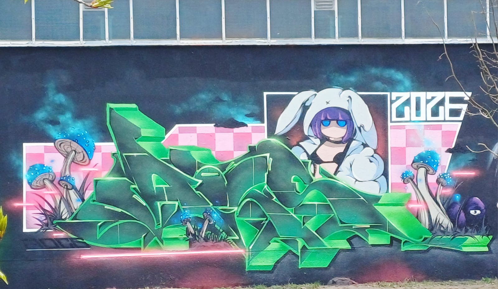 The graffiti on the far left are from SPOARE and ENOK, and the graffiti on the far right were made by ERIZO and NEKTR