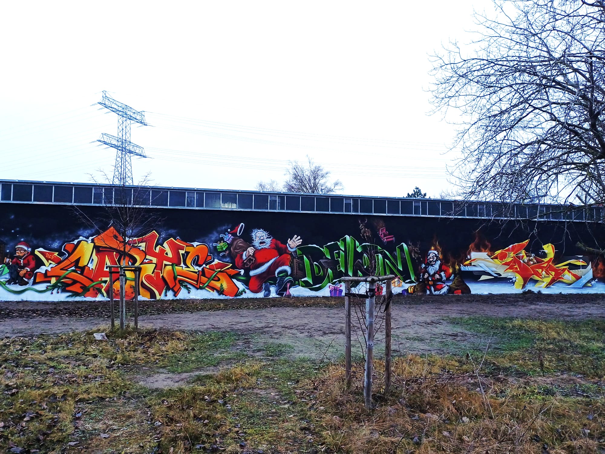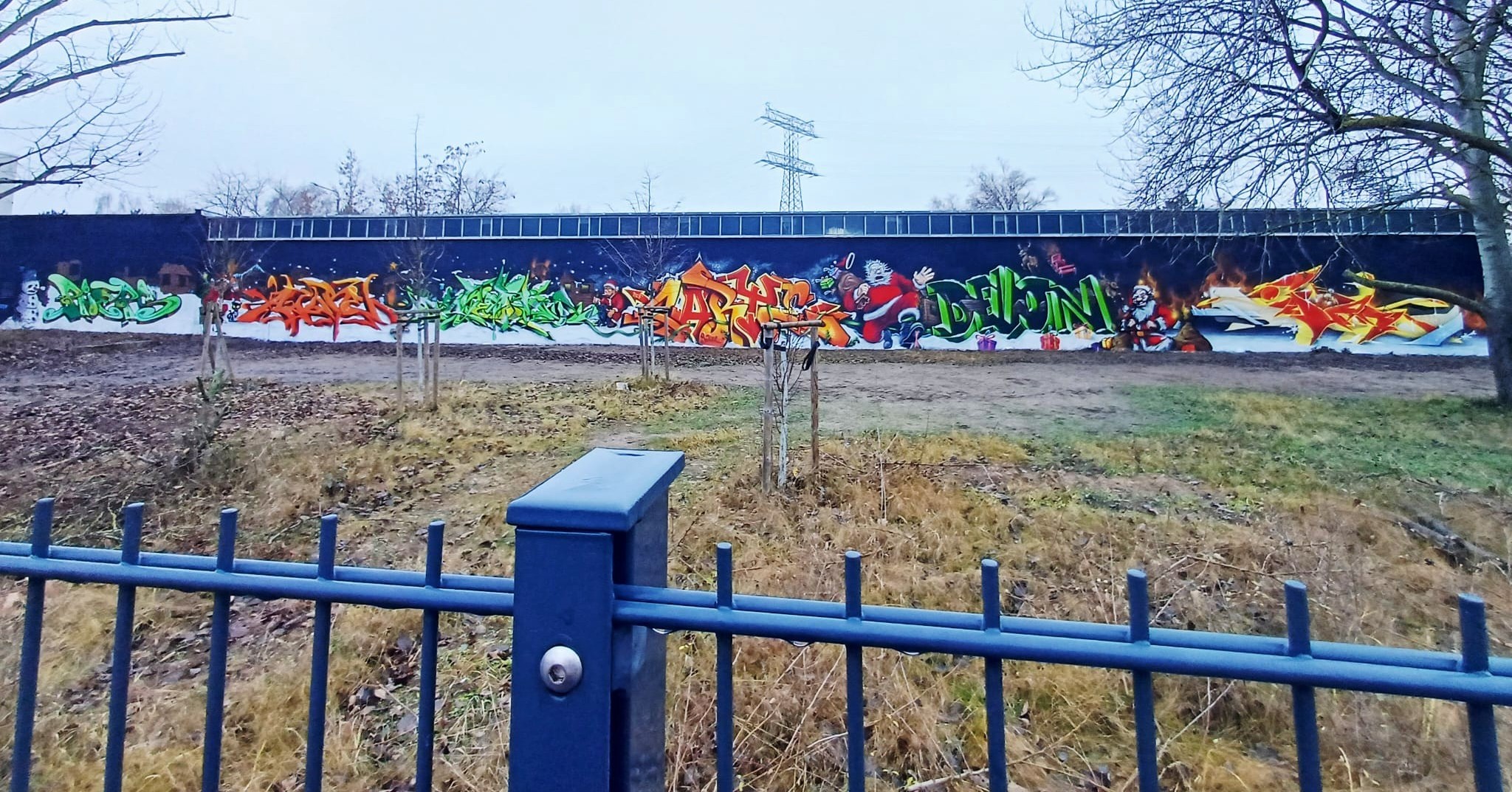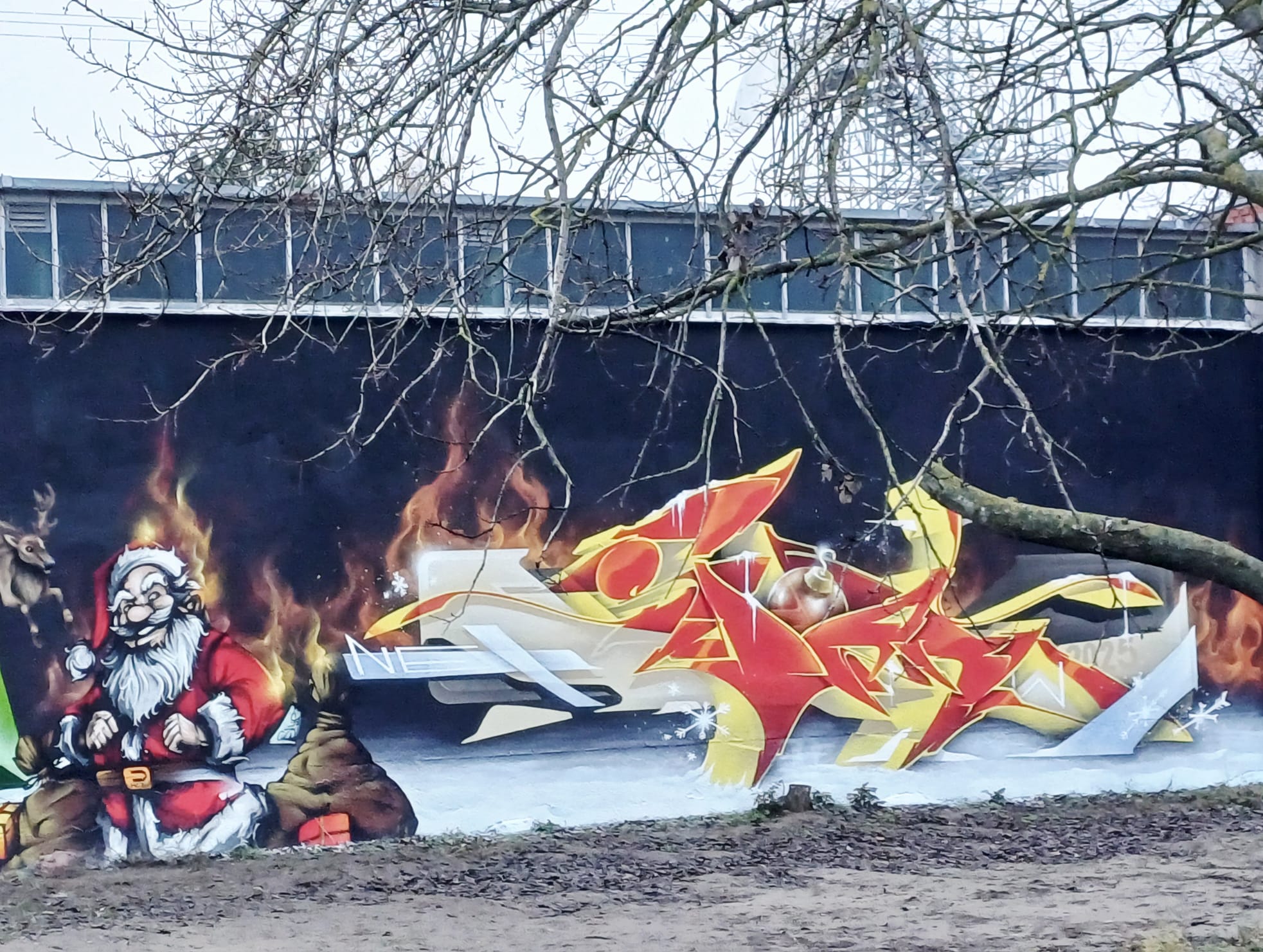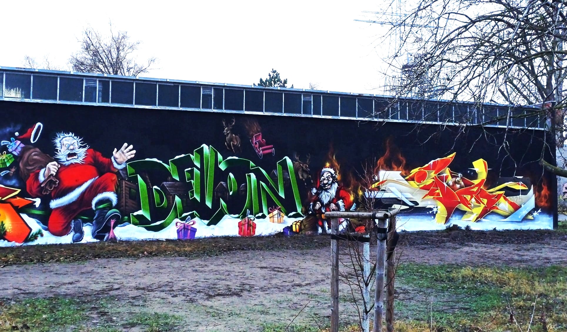 The graffiti on the far left were made by PHEPS, AZURE and KESOM, and several of the Santa characters inbetween are from SHIE