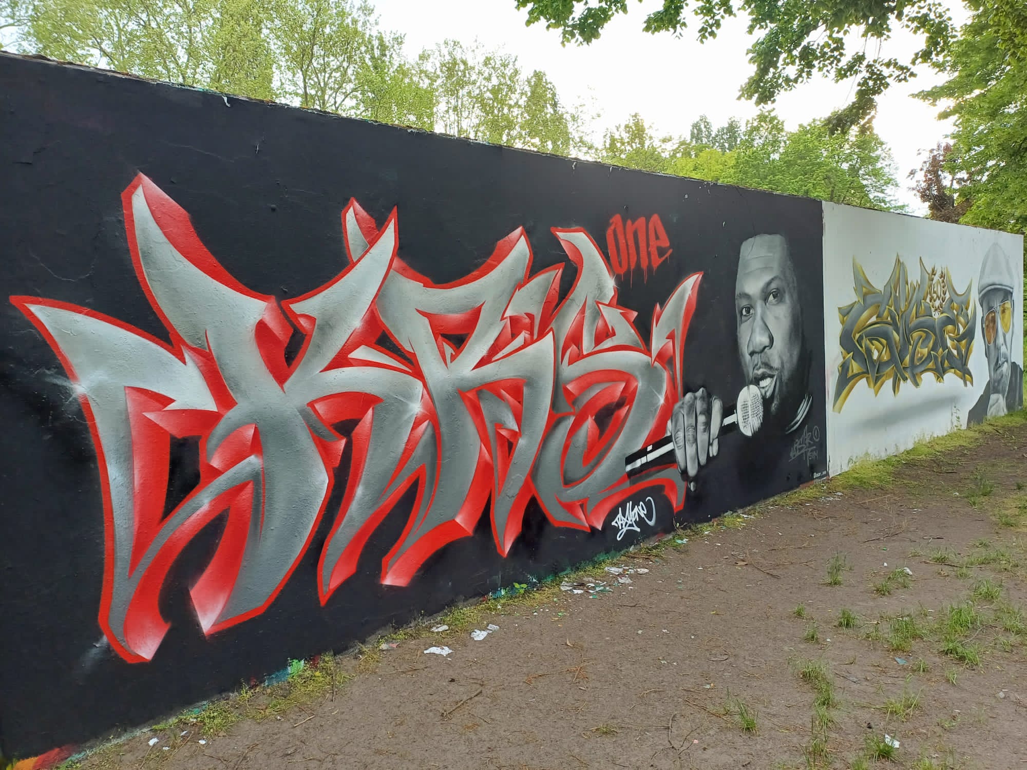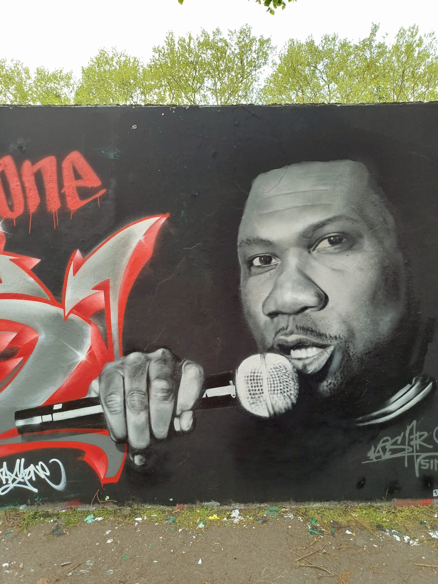 The portrait of Ice Cube on the left is from KOSAR and the graffiti on the left are from THOE and DSYER