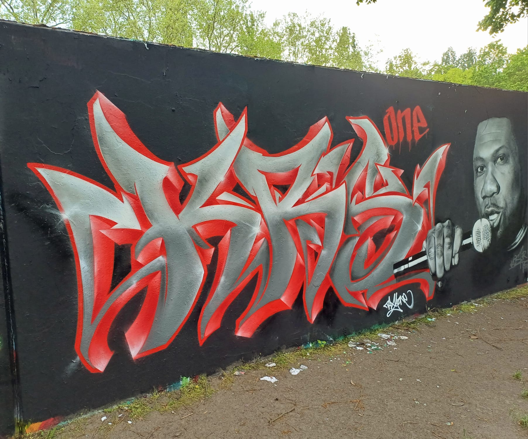 TOOMAJ SALEHI is an Iranian hip-hop artist best known for his critical protest lyrics about Iran’s social problems and criticism of the policies of the government of the Islamic Republic of Iran. When he called for support for the mass protests following the death of MASHA JINA AMINI in September 2022, he was arrested. He is threatened with the death penalty. This artwork is a tribute to this great and brave musician. The portrait was made by KOSAR and the graffiti is from TAXY and BASSTARD. – #freetoomajsalehi