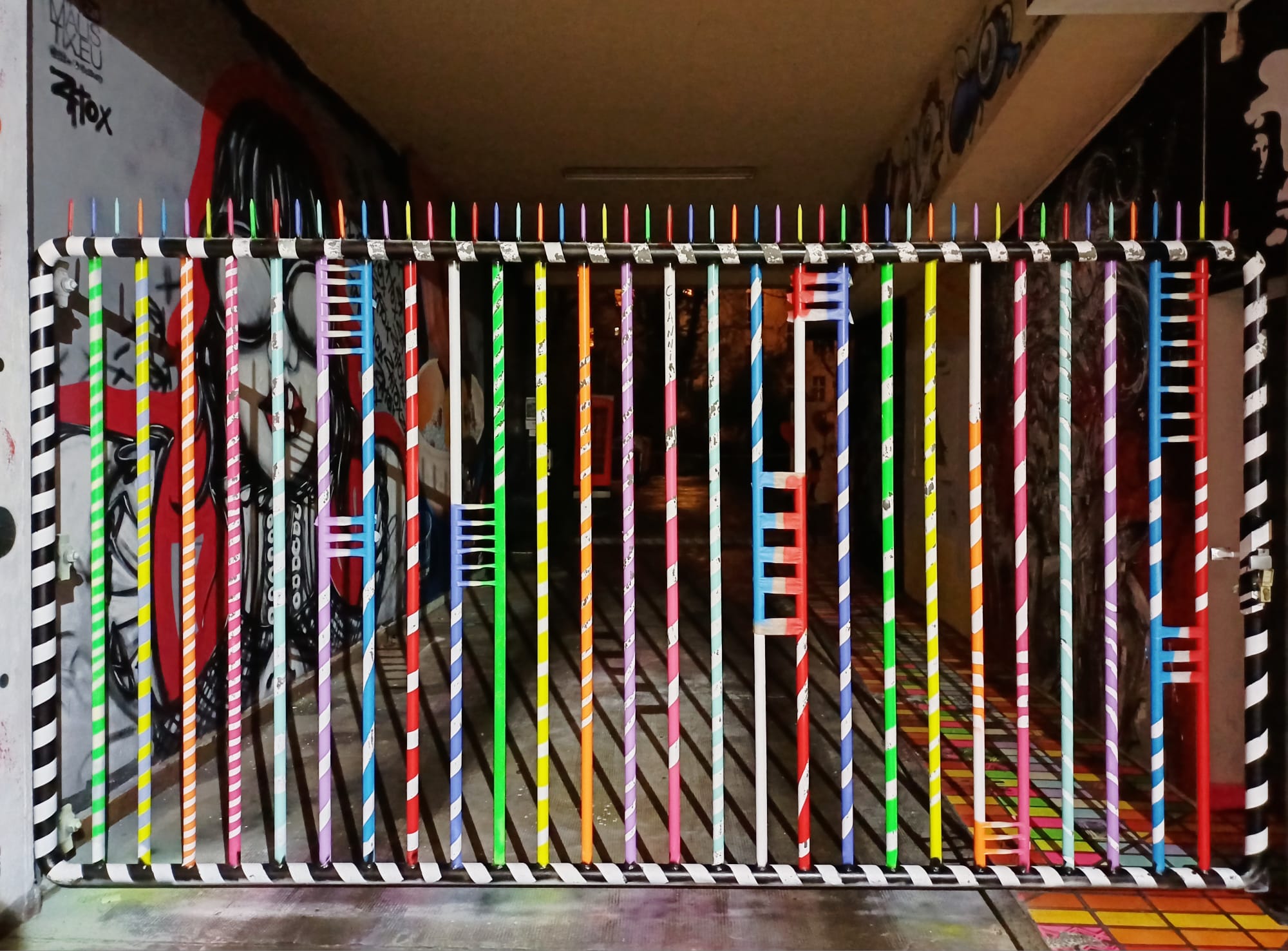 Next to the gallery there is a tunnel with a wall which is regualarly painted by different artists. The blue character is from HARALD HASSI, the red graffiti in the middle was made by RENZO and the charecters above are from GOMEZ.