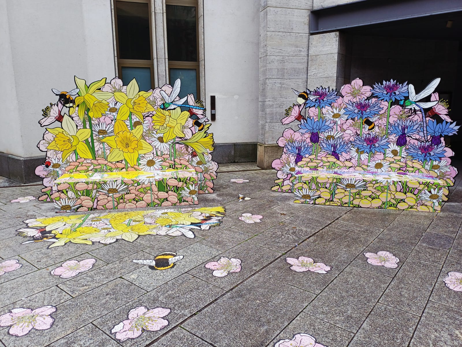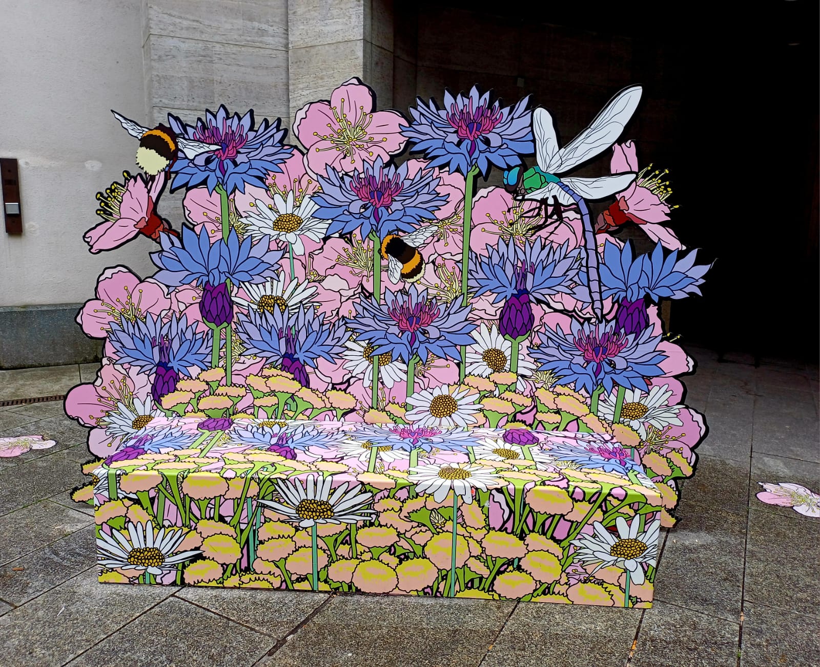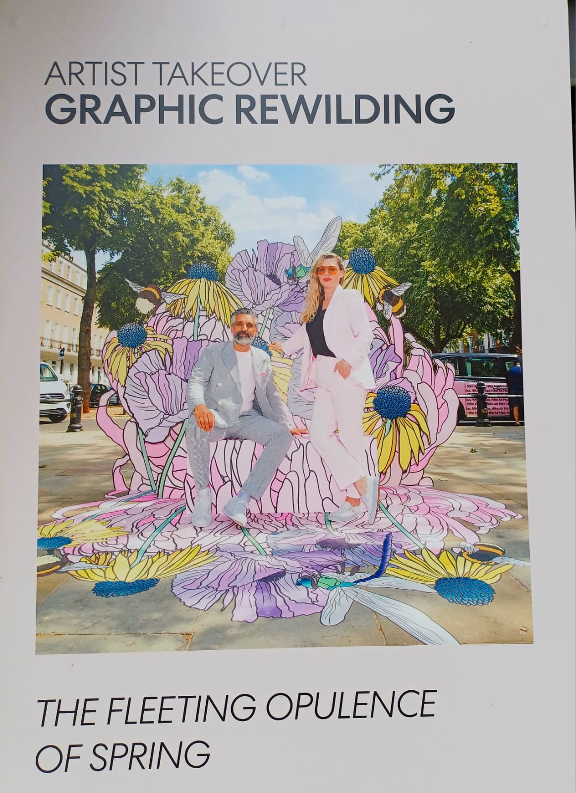 GRAPHIC REWILDING is an artist duo from Brighton, England, consisting of CATHERINE BOROWSKI and LEE BAKER. Their large-scale, flower-inspired installations create a connection between urban spaces and nature. Inspired by Japanese sumi-e painting and the aesthetics of PATRICK CAULFIELD (1936-2005), their powerful, immersive art brings joy and reflection to unexpected places—from castle ruins to shopping malls. With vibrant colors and rhythmic repetition, they transform gray urban landscapes into moments of beauty, tranquility, and playful energy.