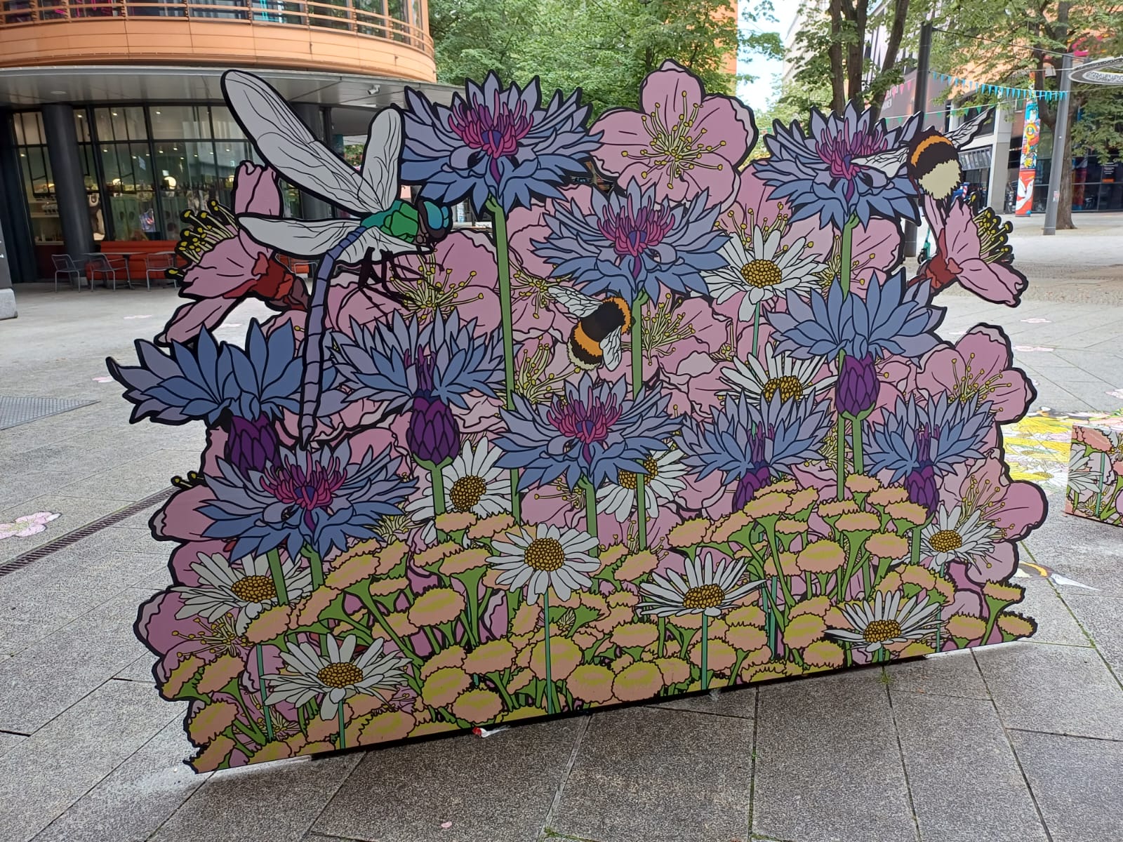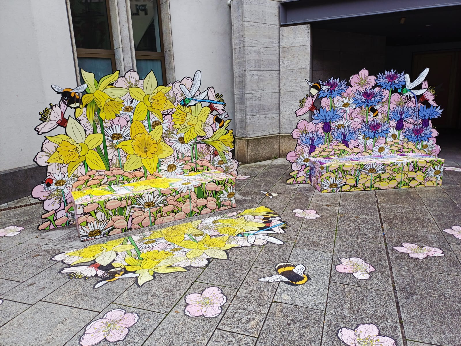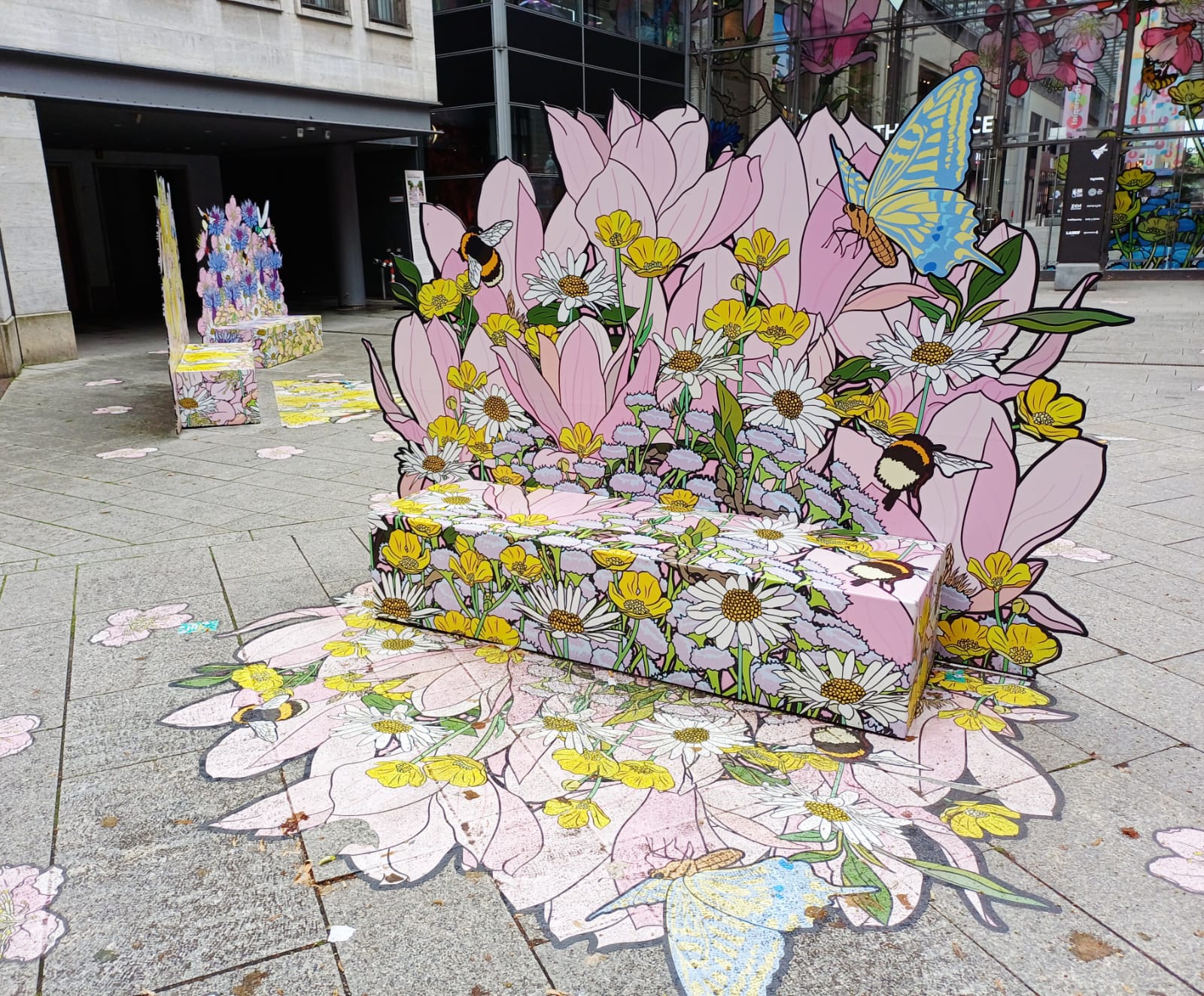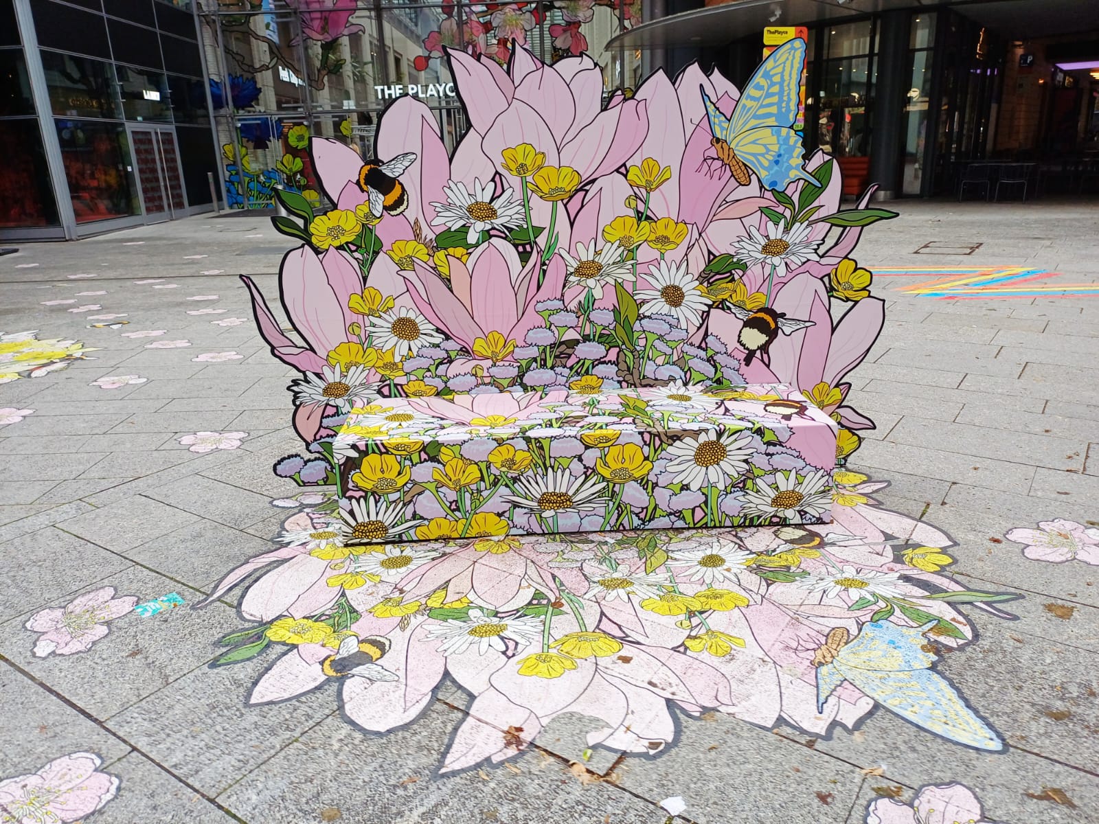 GRAPHIC REWILDING is an artist duo from Brighton, England, consisting of CATHERINE BOROWSKI and LEE BAKER. Their large-scale, flower-inspired installations create a connection between urban spaces and nature. Inspired by Japanese sumi-e painting and the aesthetics of PATRICK CAULFIELD (1936-2005), their powerful, immersive art brings joy and reflection to unexpected places—from castle ruins to shopping malls. With vibrant colors and rhythmic repetition, they transform gray urban landscapes into moments of beauty, tranquility, and playful energy.