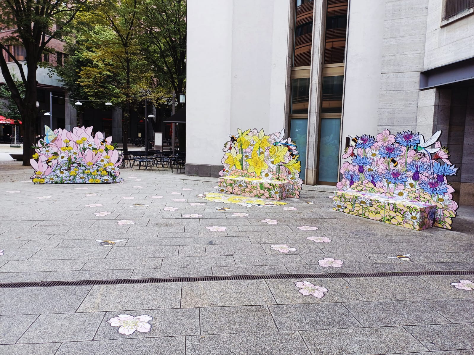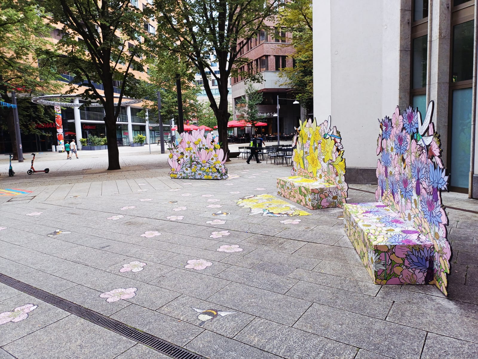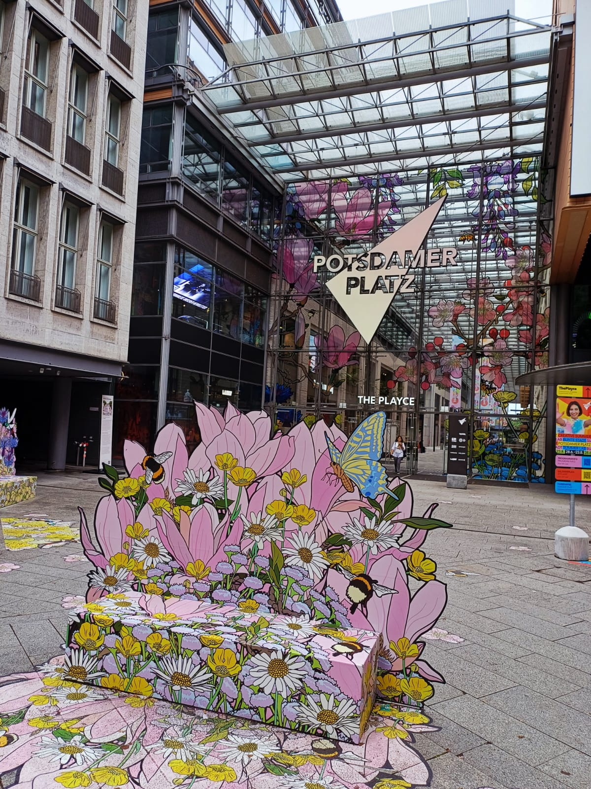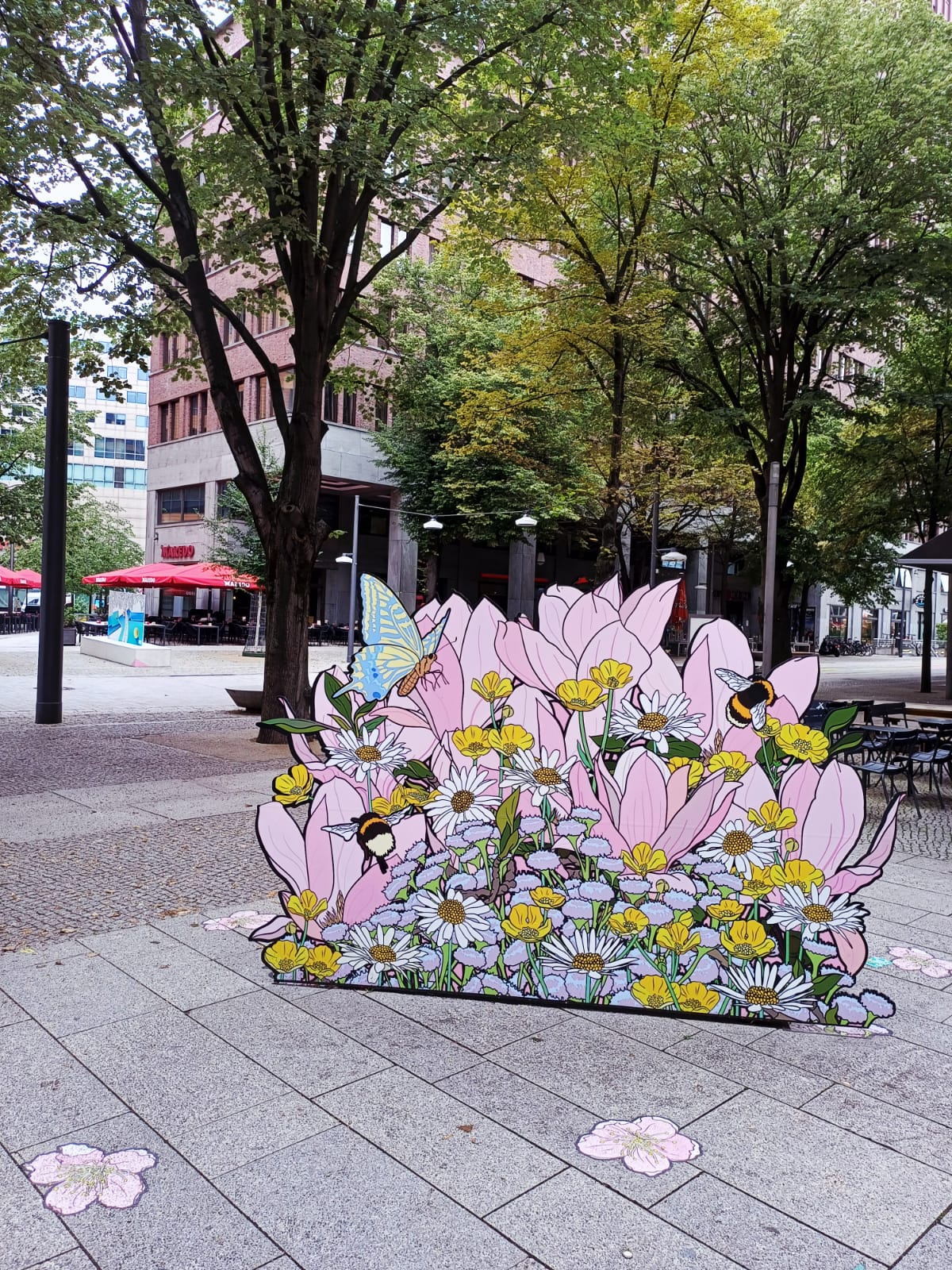 At Potsdamer Platz, GRAPHIC REWILDING presents a floral homage to Germany’s native wildflowers: magnolia, cornflower, cherry blossom, buttercup, daisy, and tansy. The „Fleeting Opulence of Spring“ transforms the glass facades of The Playce into a radiant, cathedral-like space. Five colorful flower clouds invite visitors to pause and enjoy a moment of tranquility. This installation captures the vibrant, fleeting beauty of spring and creates a colorful, nature-filled refuge in the heart of the city.