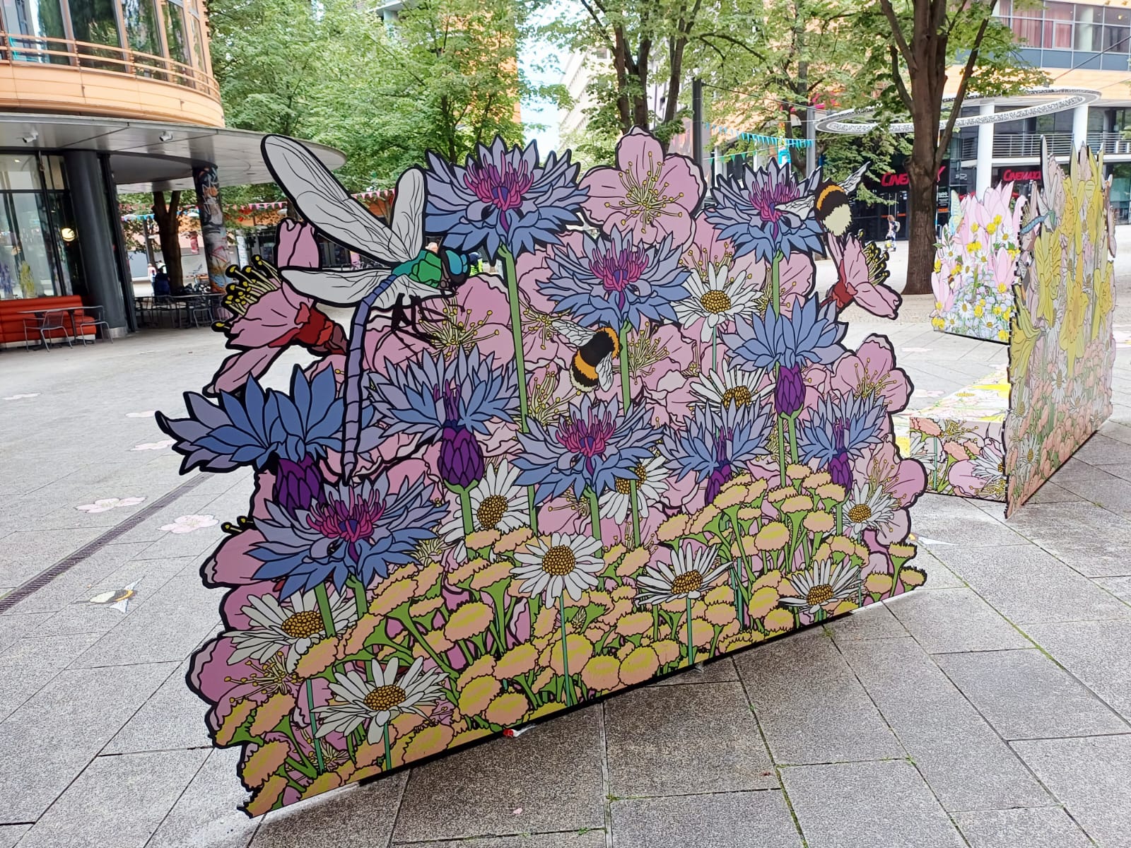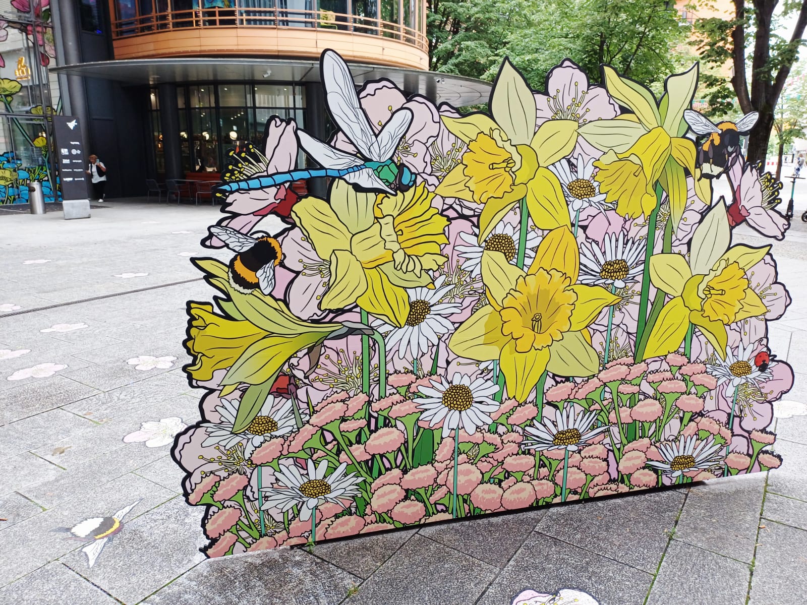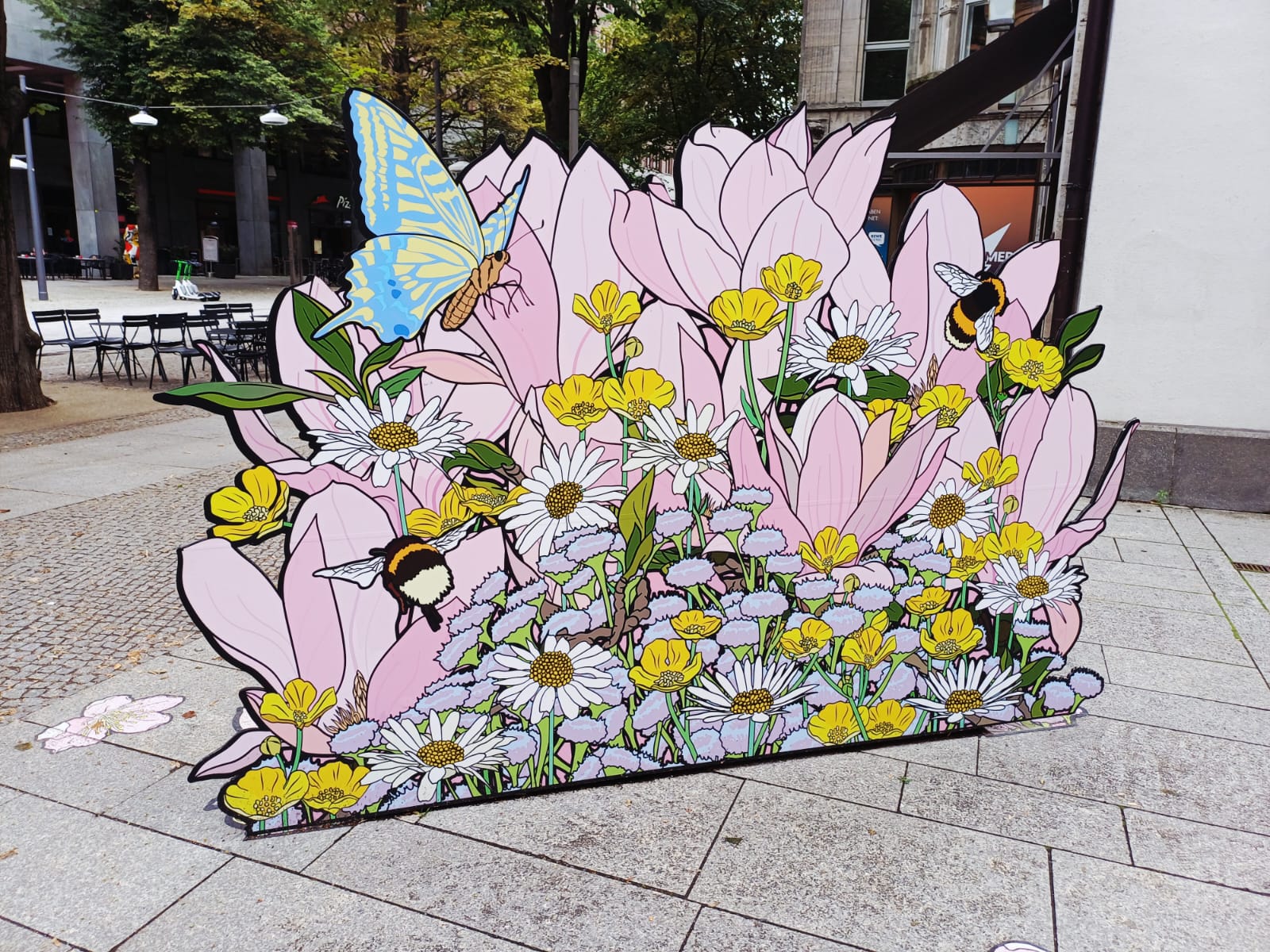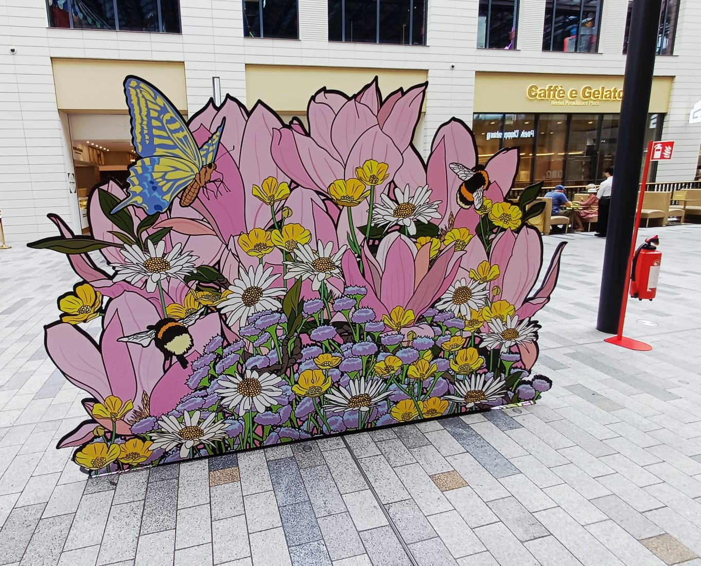 At Potsdamer Platz, GRAPHIC REWILDING presents a floral homage to Germany’s native wildflowers: magnolia, cornflower, cherry blossom, buttercup, daisy, and tansy. The „Fleeting Opulence of Spring“ transforms the glass facades of The Playce into a radiant, cathedral-like space. Five colorful flower clouds invite visitors to pause and enjoy a moment of tranquility. This installation captures the vibrant, fleeting beauty of spring and creates a colorful, nature-filled refuge in the heart of the city.