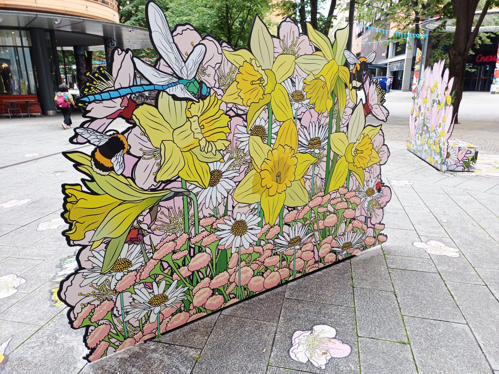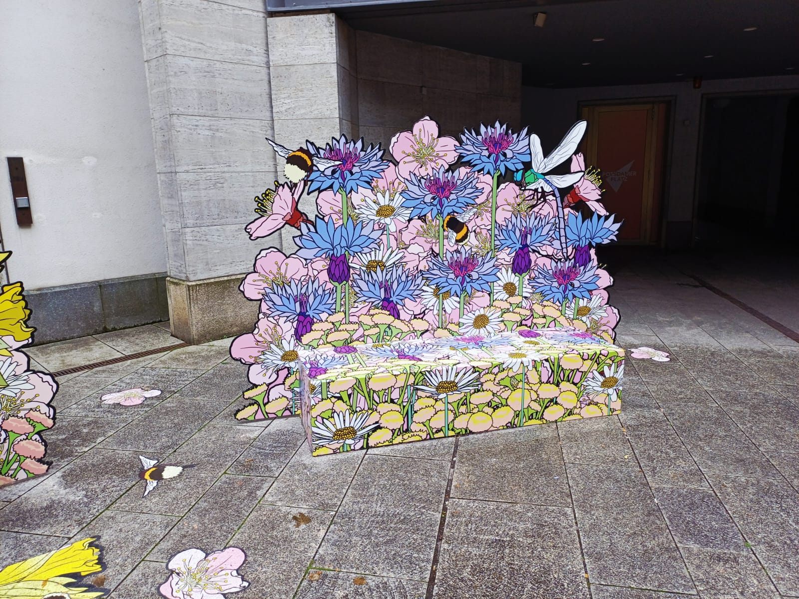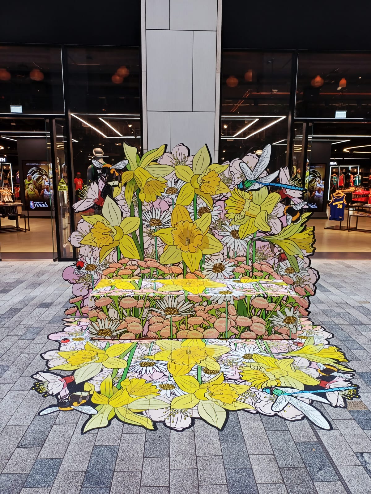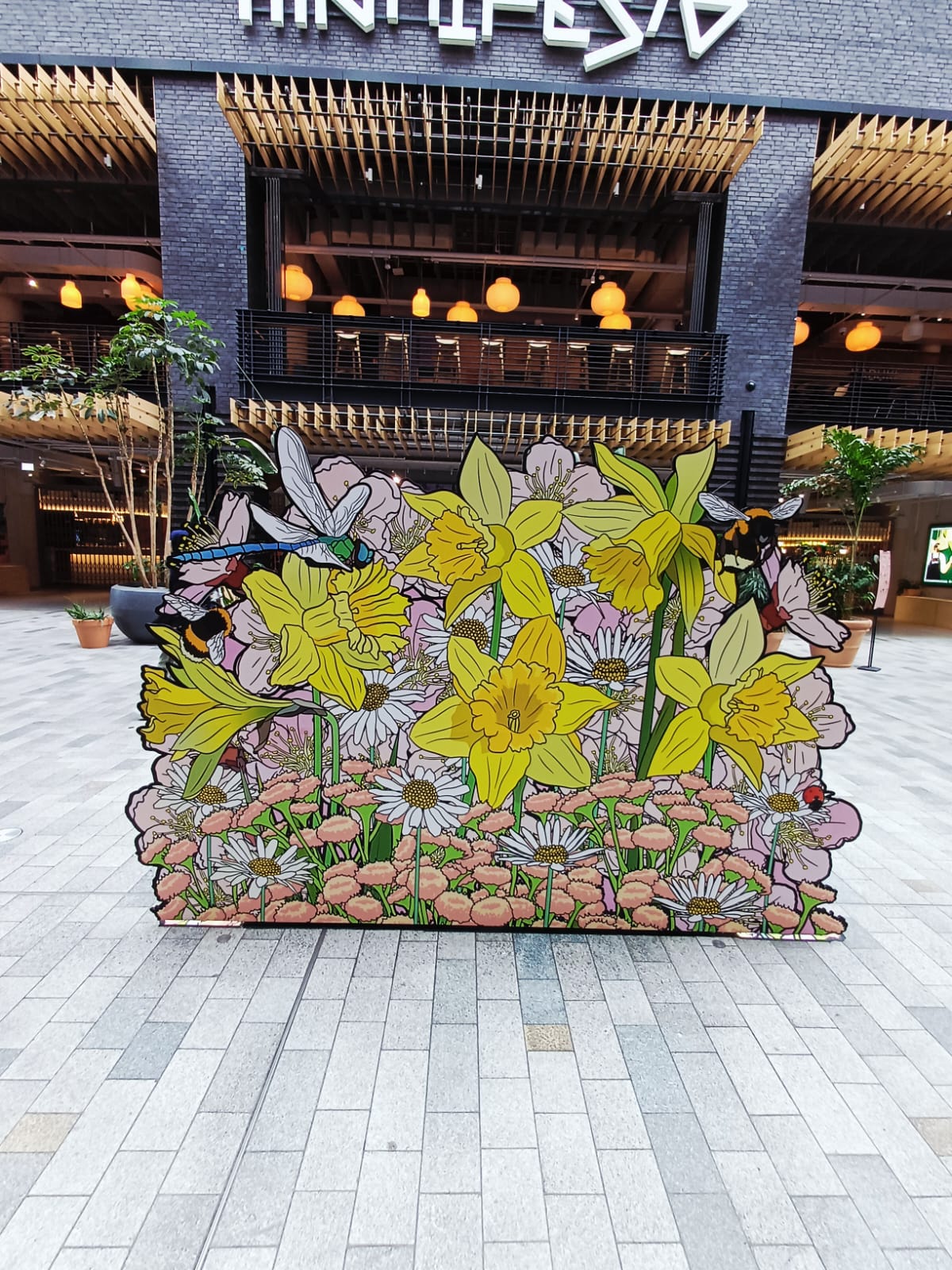 At Potsdamer Platz, GRAPHIC REWILDING presents a floral homage to Germany’s native wildflowers: magnolia, cornflower, cherry blossom, buttercup, daisy, and tansy. The „Fleeting Opulence of Spring“ transforms the glass facades of The Playce into a radiant, cathedral-like space. Five colorful flower clouds invite visitors to pause and enjoy a moment of tranquility. This installation captures the vibrant, fleeting beauty of spring and creates a colorful, nature-filled refuge in the heart of the city.