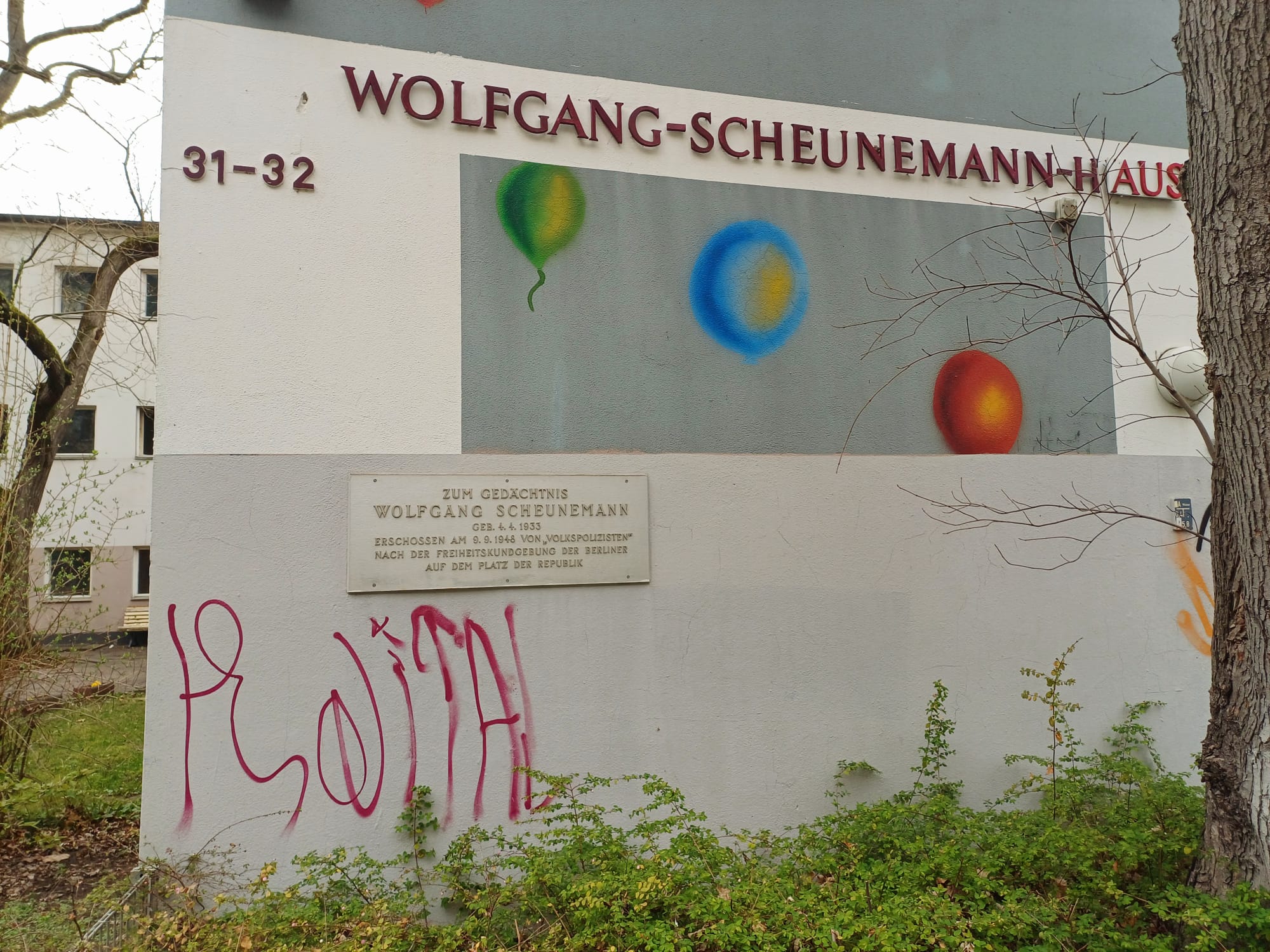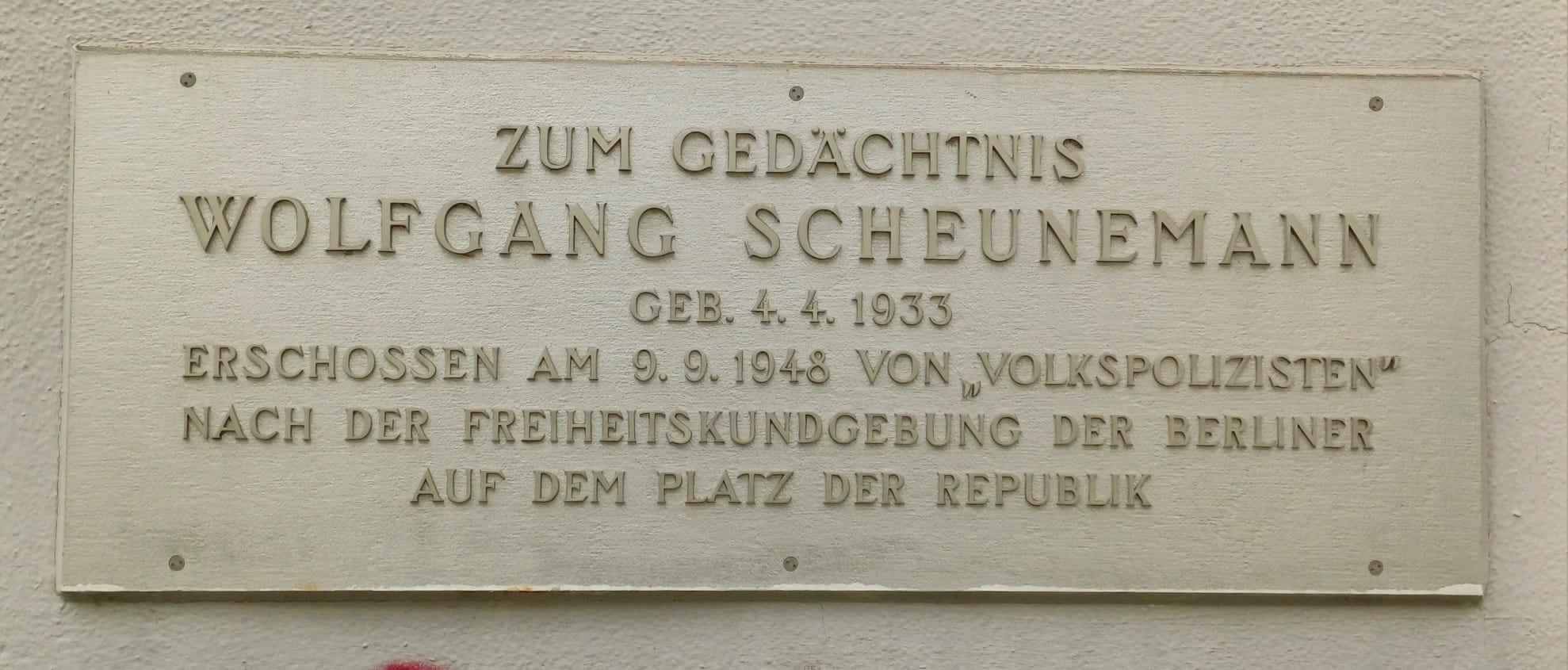 In memory of Wolfgang Scheunemann. Born on April 4, 1933, he was shot by „People’s Police“ on November 9th 1948, after the Berlin Freedom Rally on the Platz der Republik, the Republic’s Square.