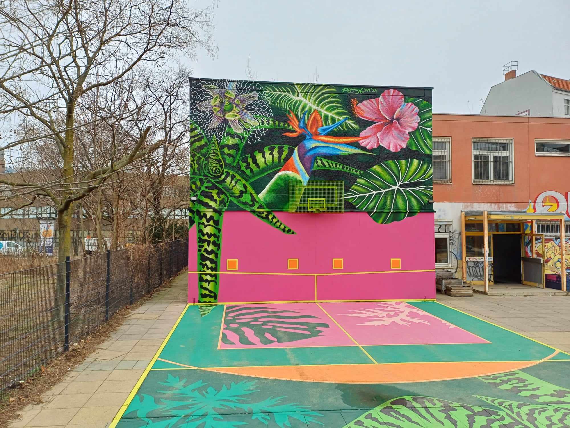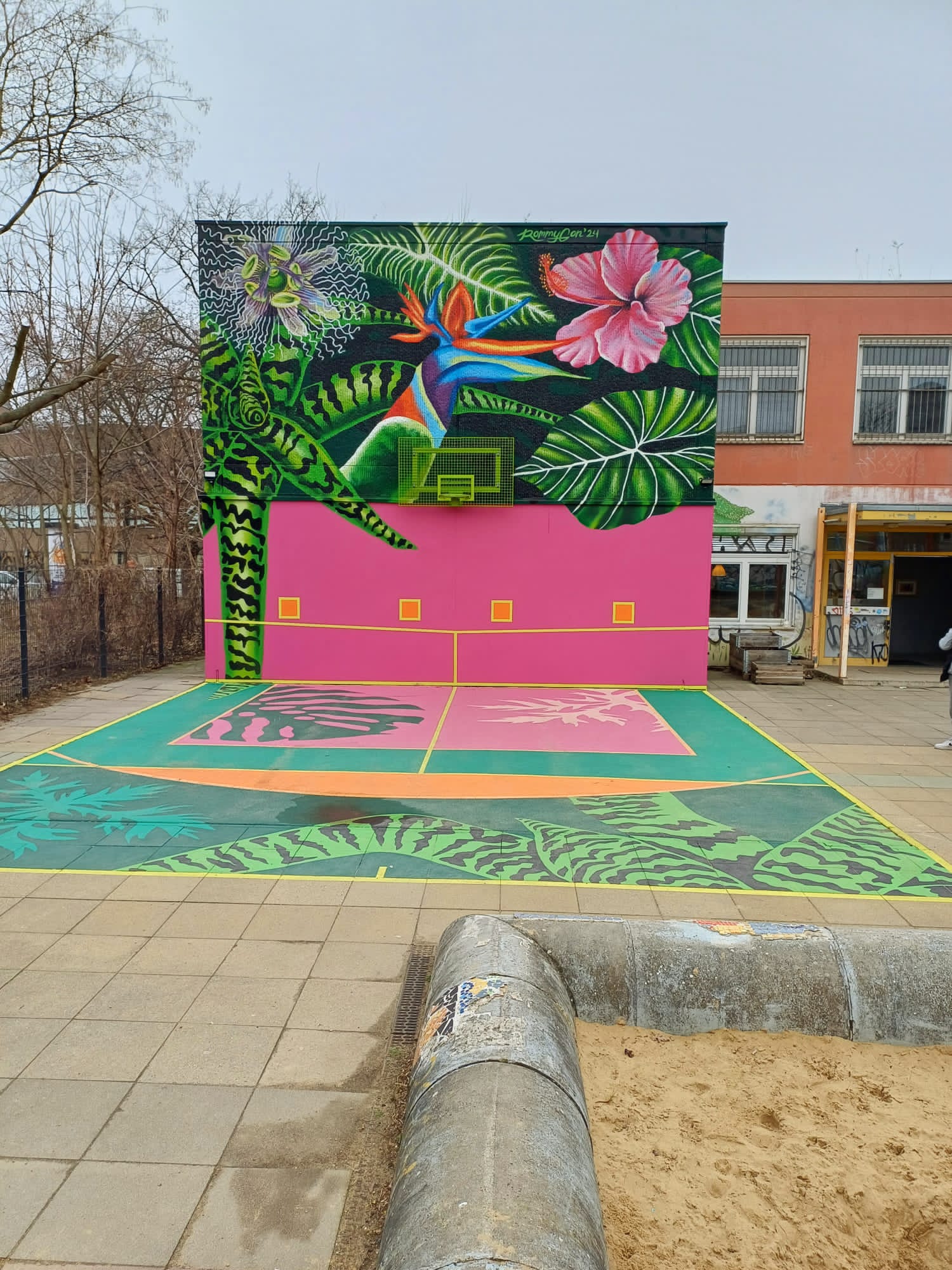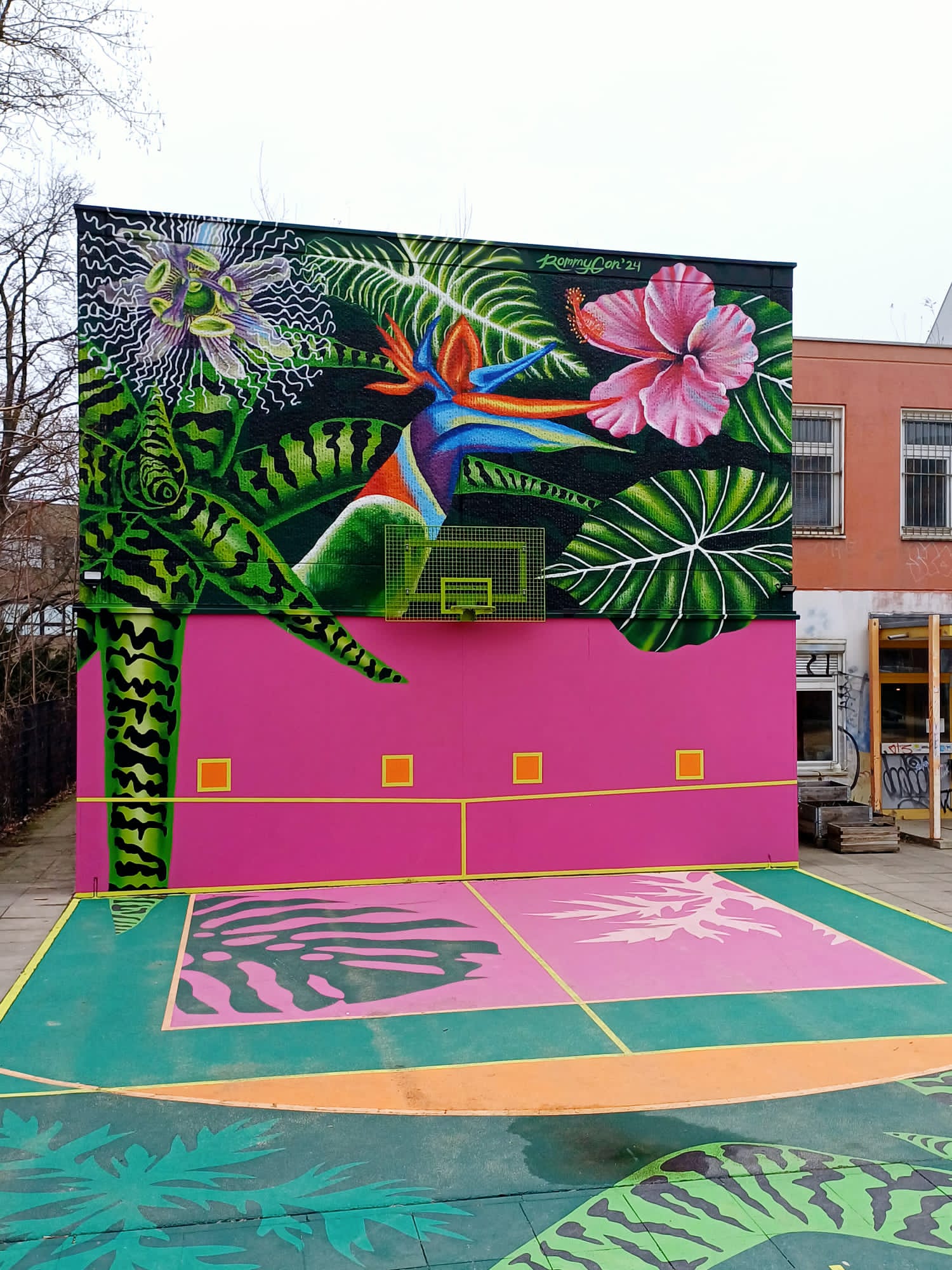 ROMMY GONZÁLEZ about the artwork: „I had the luck to participate in a dream project on a wall-tennis and basketball court located in Berlin, Moabit . This project is part of the “Neon Legacy” initiative by Roger Federer and Mercedes Benz, where sports areas are refurbished for the people. This court it’s located in public youth club Jugendklub Schlupfwinkel and open for everyone who wants to play wall tennis and basketball. Thank you so much to my golden assistant AUKITALO who helped me to make this possible. Special thanks also to the whole production team of CONCRETE CANDY and SCHANZBOY for your work and trust in me and Mercedes Benz for giving me the artistic freedom and believing in my work“ – Rommy González