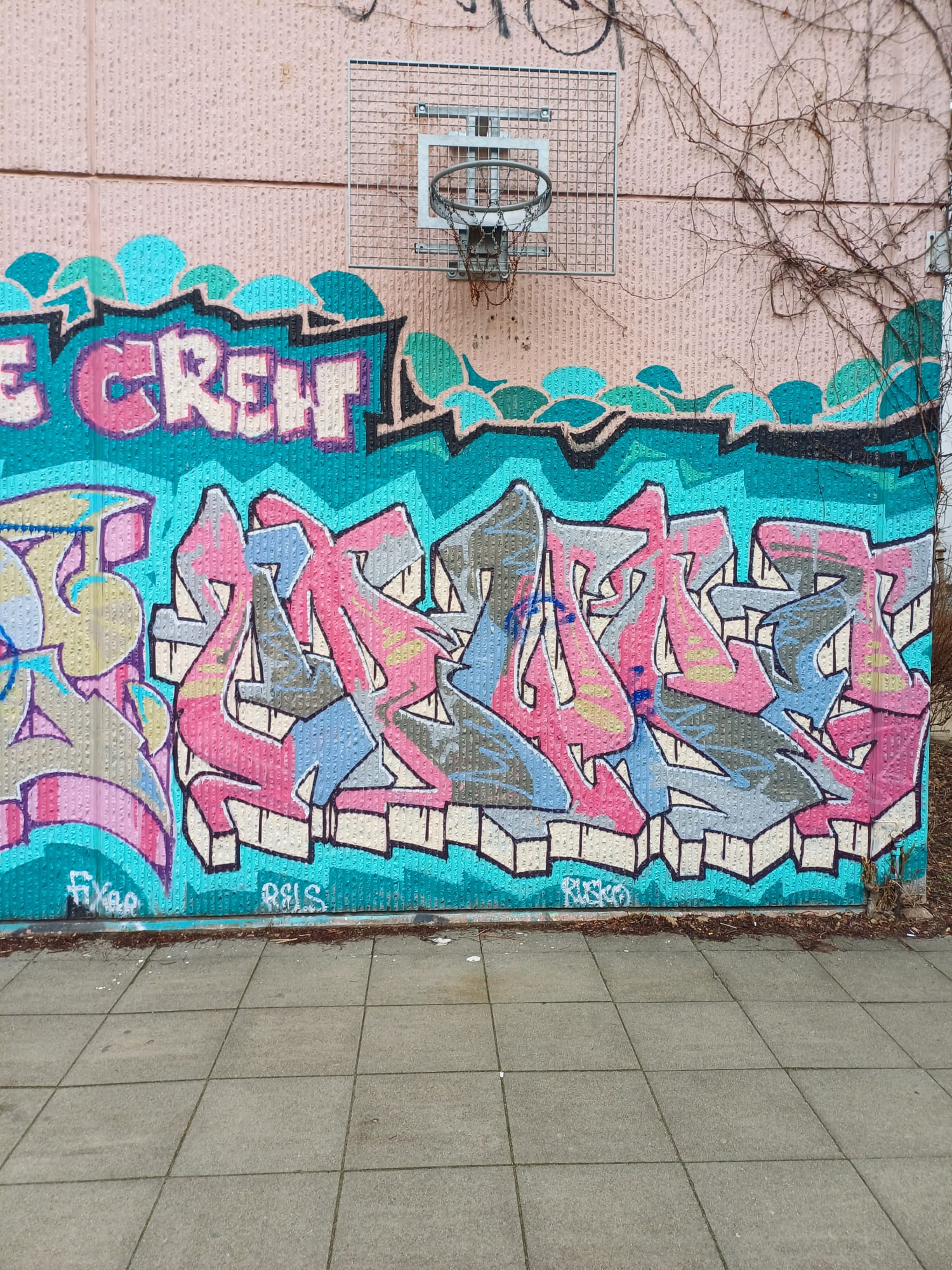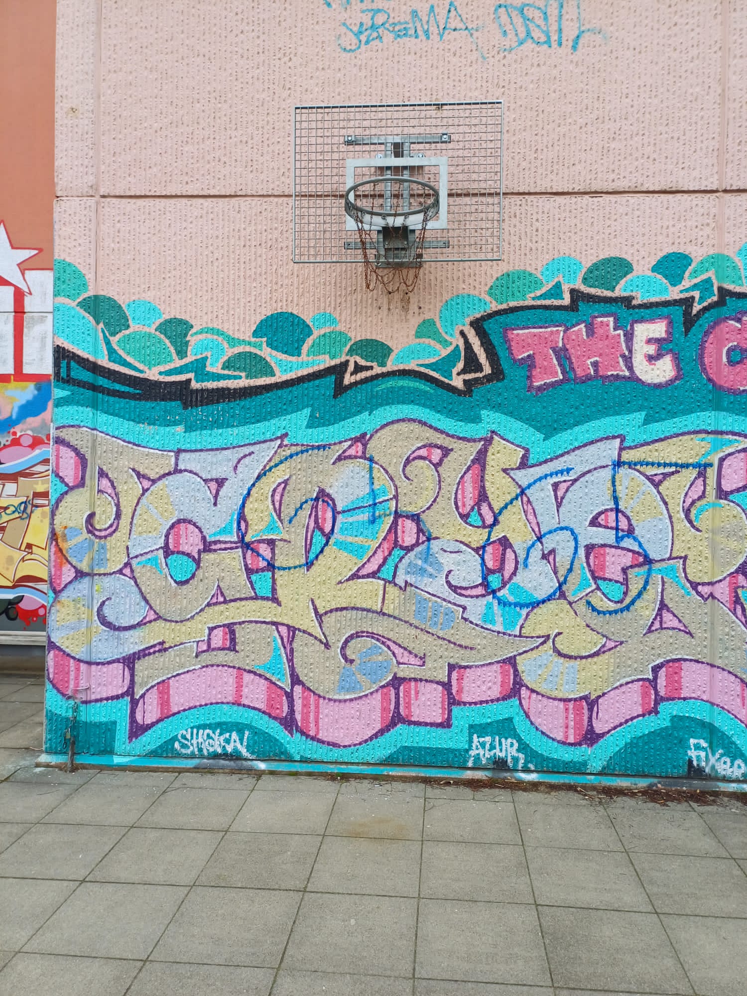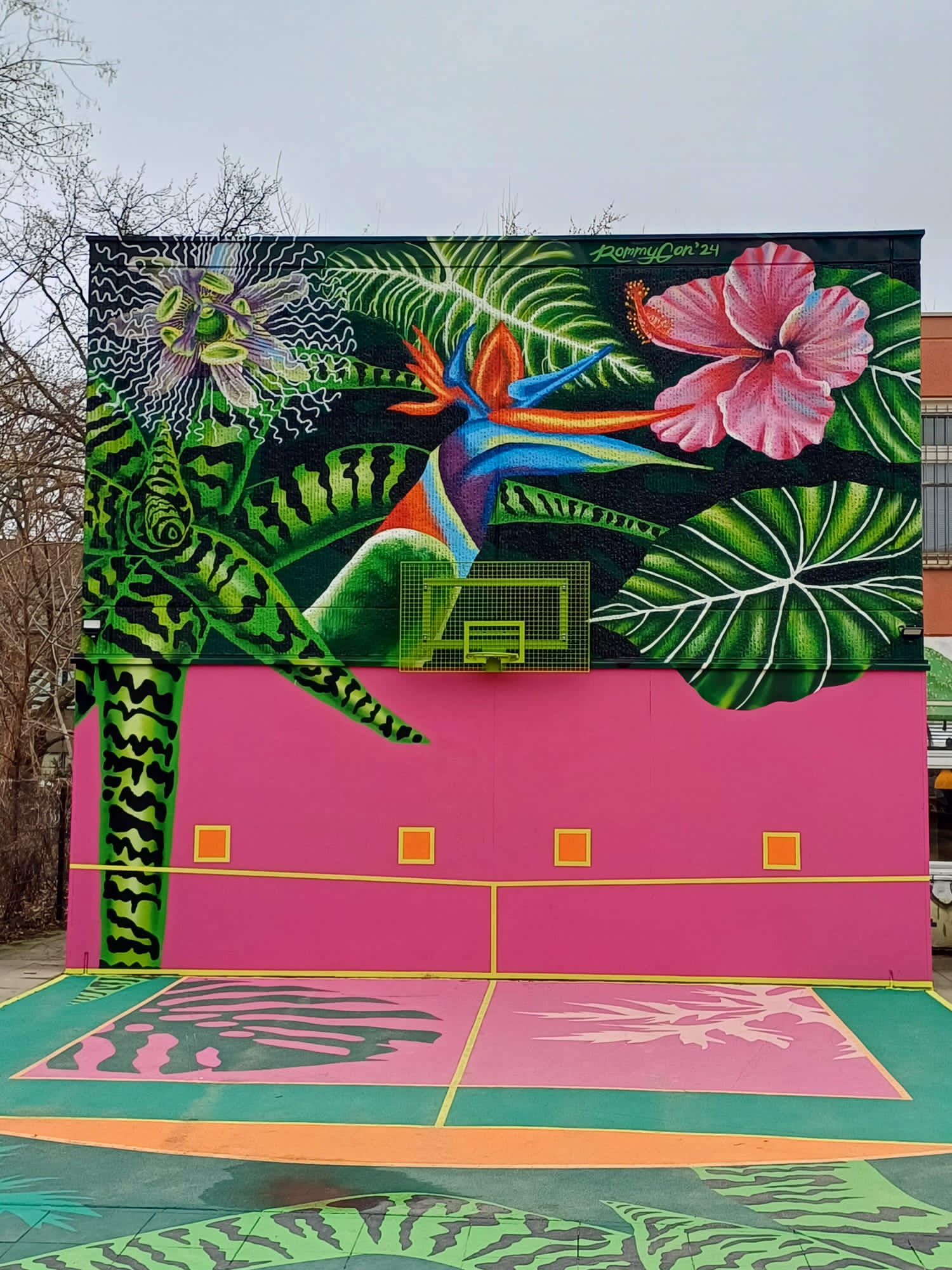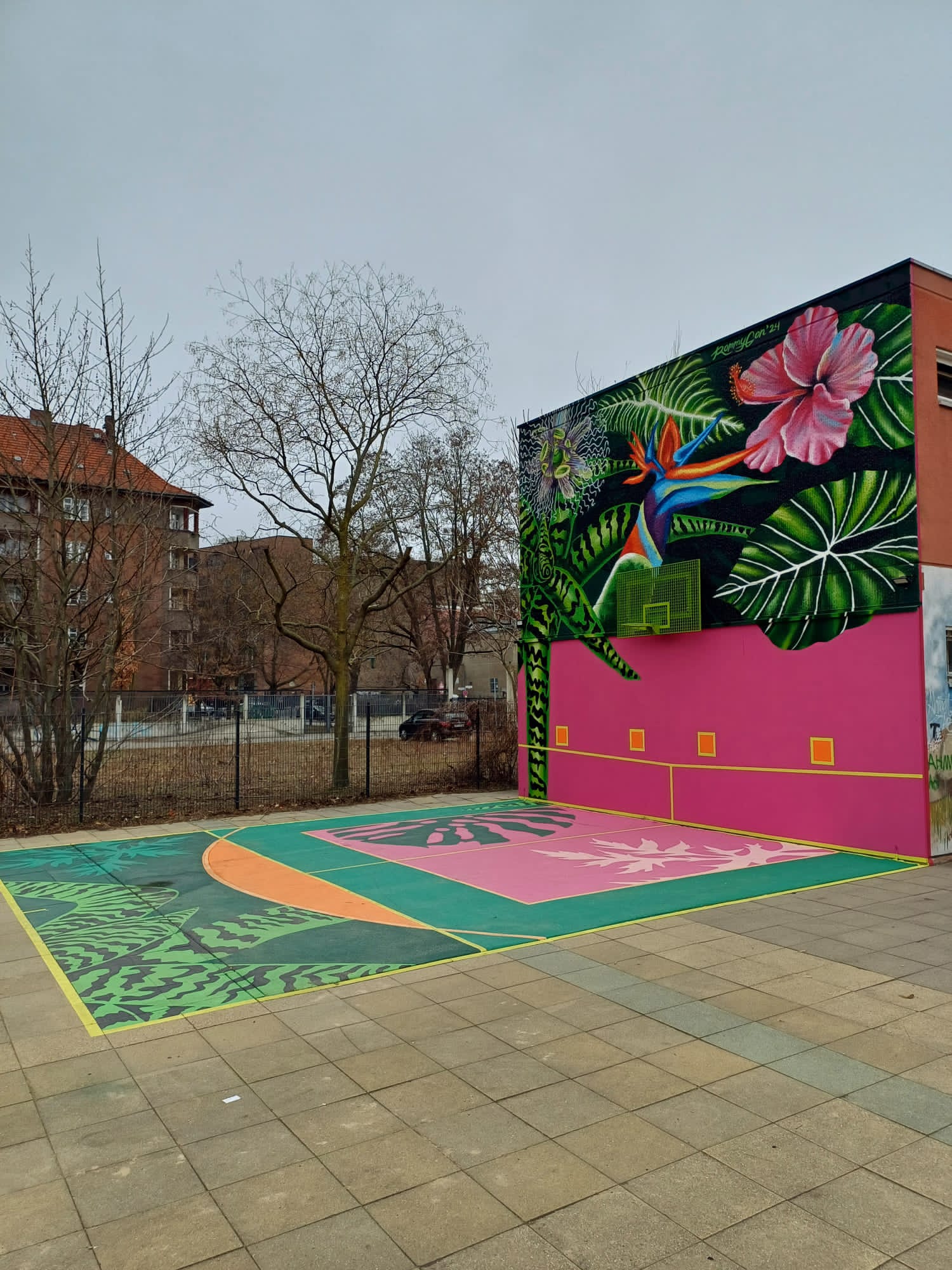 ROMMY GONZÁLEZ about the artwork: „I had the luck to participate in a dream project on a wall-tennis and basketball court located in Berlin, Moabit . This project is part of the “Neon Legacy” initiative by Roger Federer and Mercedes Benz, where sports areas are refurbished for the people. This court it’s located in public youth club Jugendklub Schlupfwinkel and open for everyone who wants to play wall tennis and basketball. Thank you so much to my golden assistant AUKITALO who helped me to make this possible. Special thanks also to the whole production team of CONCRETE CANDY and SCHANZBOY for your work and trust in me and Mercedes Benz for giving me the artistic freedom and believing in my work“ – Rommy González