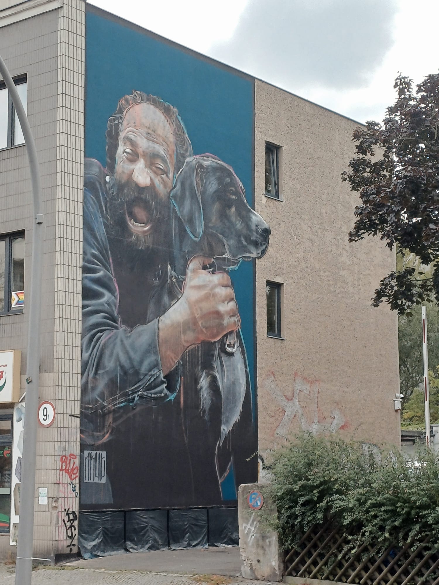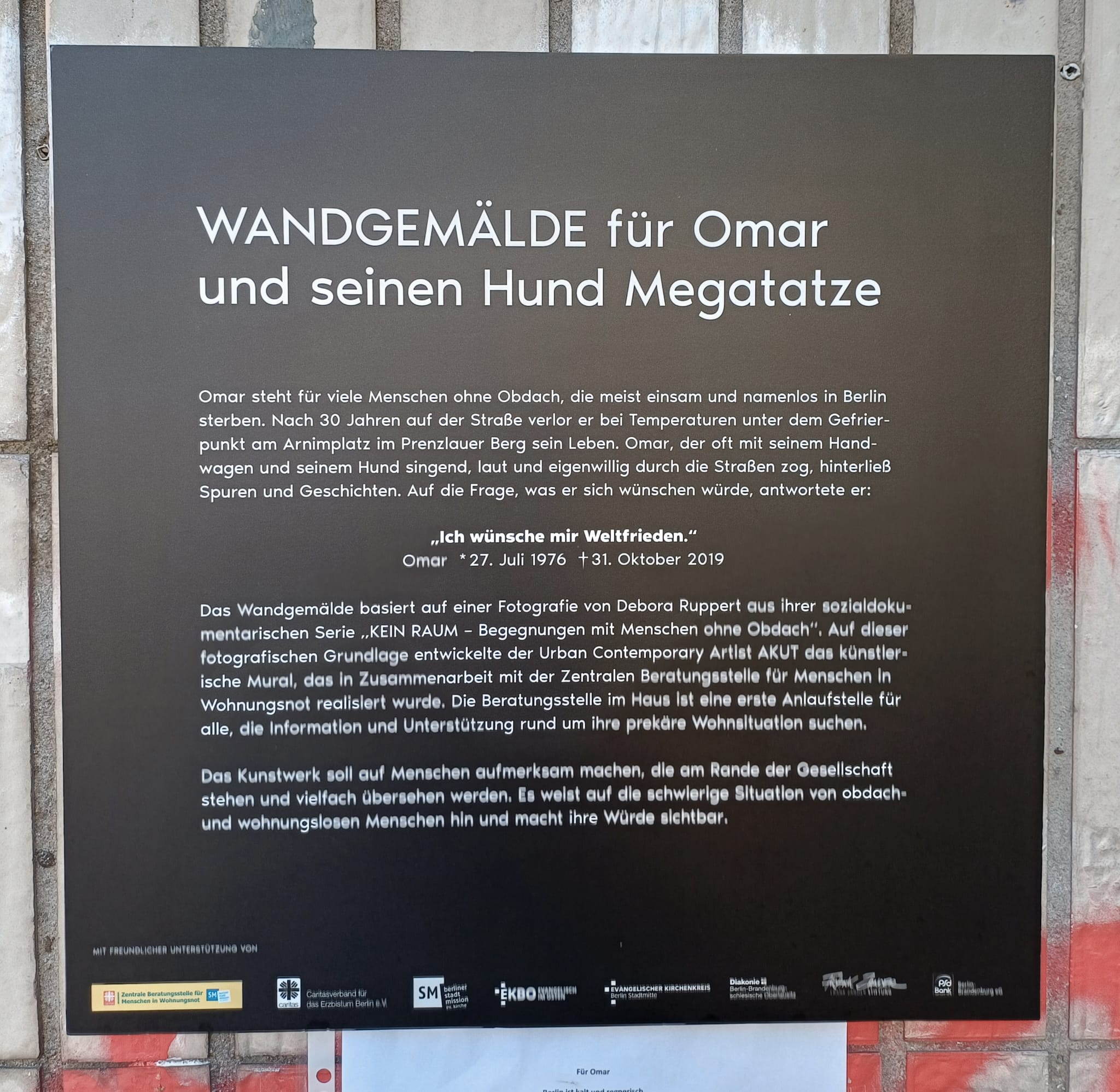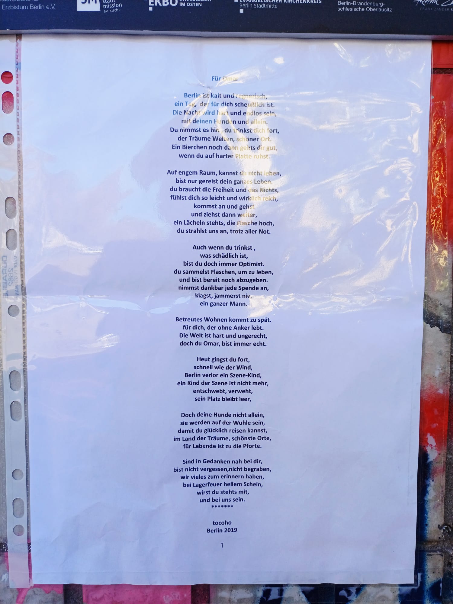 English: Berlin is cold and rainy, a day that is awful for you. The night will be hard and endless, with your dogs and alone. You accept it, you drink yourself away, the world of dreams, a beautiful place. One more beer and you’ll be fine when you rest on the hard slab. You can’t live in a small space, you’ve only traveled your whole life. You need freedom and nothingness, you feel so light and truly rich, you arrive and leave and then move on, always smiling, bottle raised, you beam at us, despite all the hardship. Even when you drink, which is harmful, you are always an optimist. You collect bottles to live and are willing to give them away. You gratefully accept every donation, never complain or whine, a real man. Assisted living comes too late. For you, who lives without an anchor. The world is hard and unfair, but you, Omar, are always genuine. Today you left, fast as the wind, Berlin lost a child of the scene, a child of the scene is no more, floated away, blown away, his place remains empty. But your dogs are not alone, they will be on the Wuhle so that you can travel happily in the land of dreams, the most beautiful places, for the living the gate is too. We are close to you in our thoughts, you are not forgotten, not buried, we have much to remember, by the bright light of the campfire, you will always be with us.