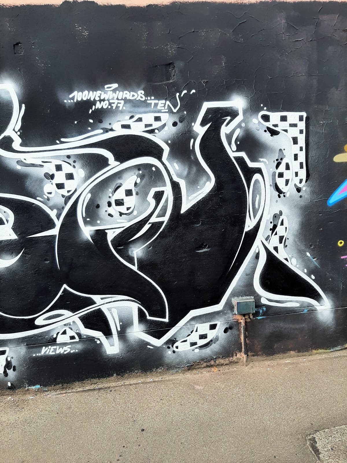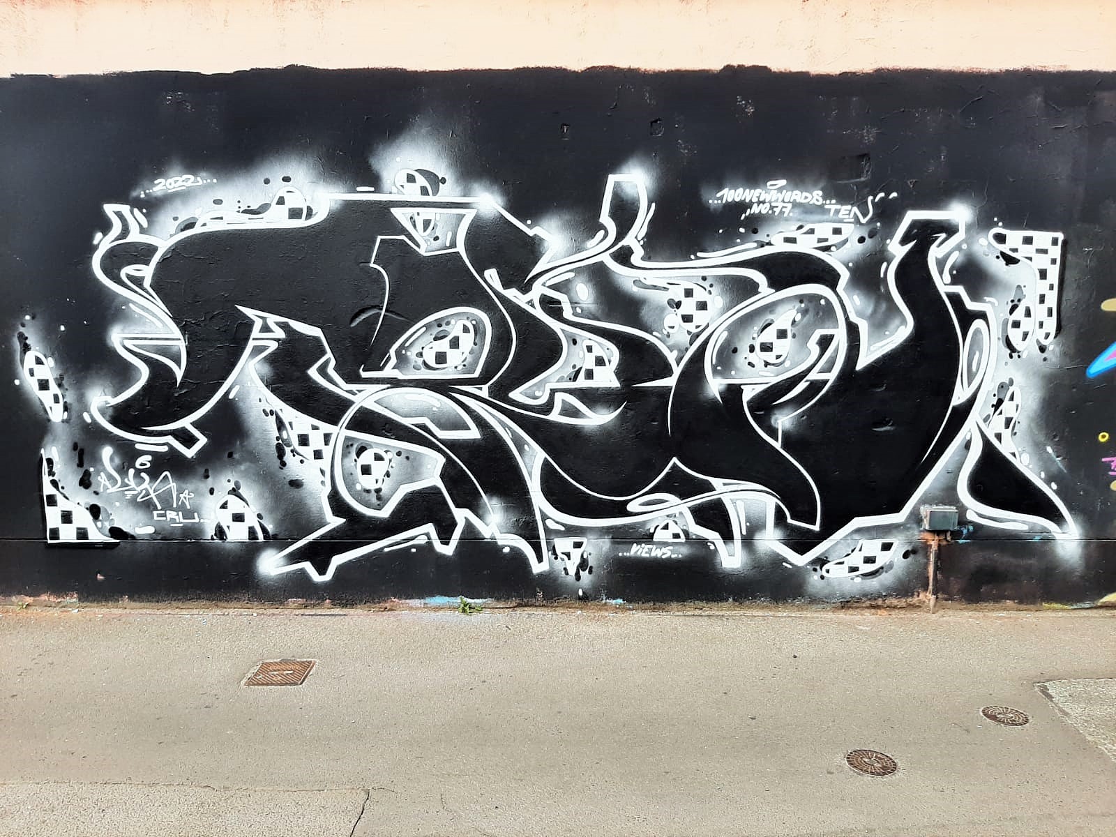 This great wall was made by members of the crew ADULT ENTERTAINMENT. The graffiti from left to right were made by JAZZ, SKOR, SHAW, VIEWS and PHROM.