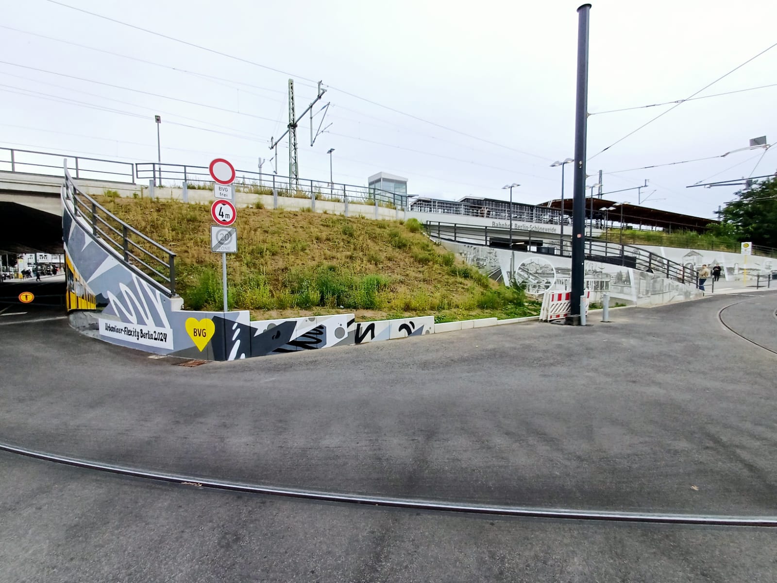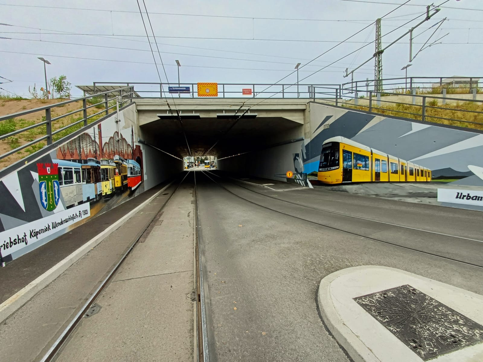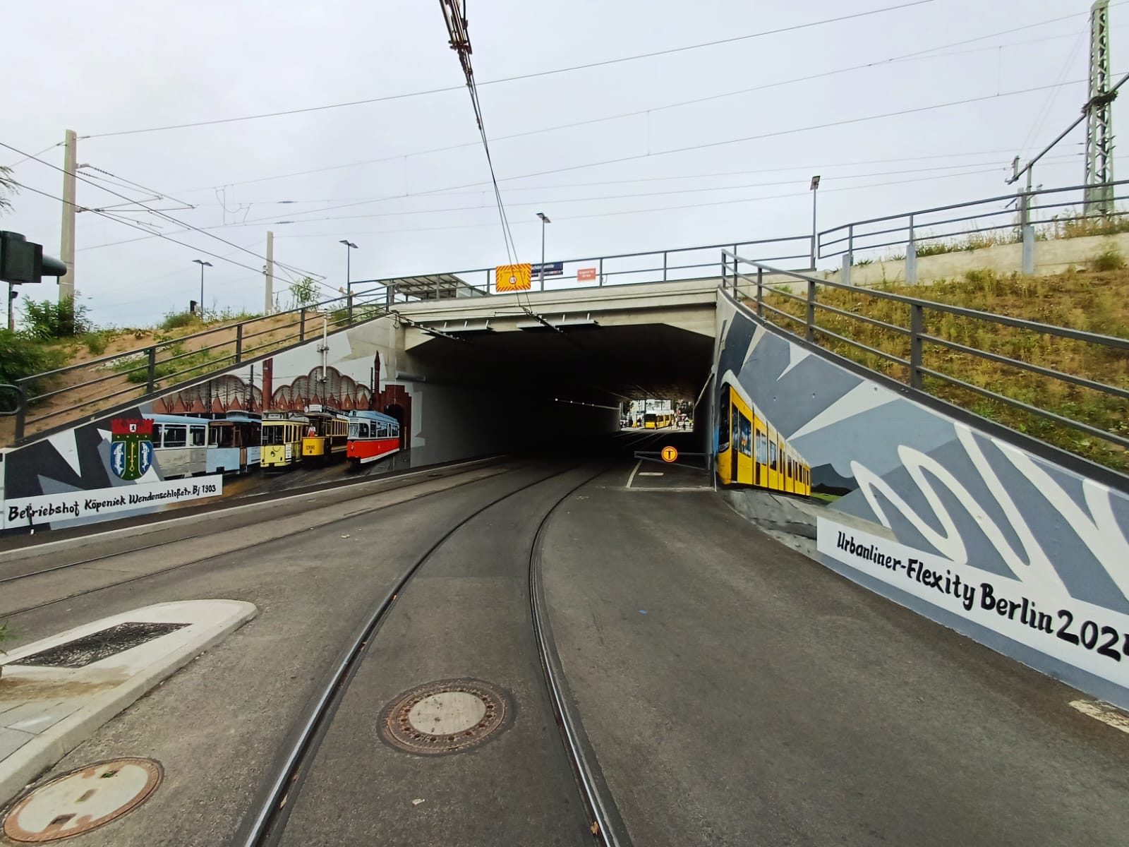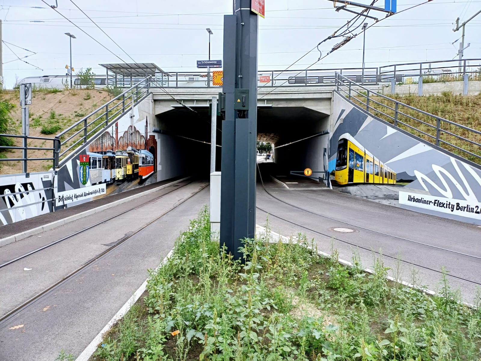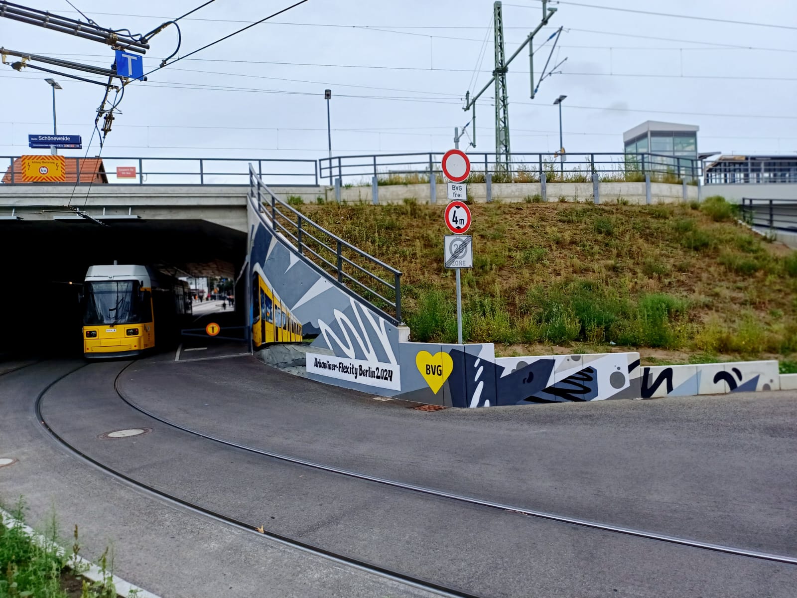 At the Schönweide train station there are several extensive works with tranportation themes located at three spots around the tracks. Directly at the entrance to the S-Bahn station, you can marvel at the large-scale work by STEVEN KARLSTEDT that decorates the walls around the stairs and ramps. The streetcar station and bus station are also located in front of the tracks to the S-Bahn and these tram tracks and the bus road pass under a bridge beneath the S-Bahn tracks. On the east side of the bridge and also on the west side of this tunnel are extensive mural paintings made by FOKUZ DESIGN. Here we have the creations at the east side of the bridge.