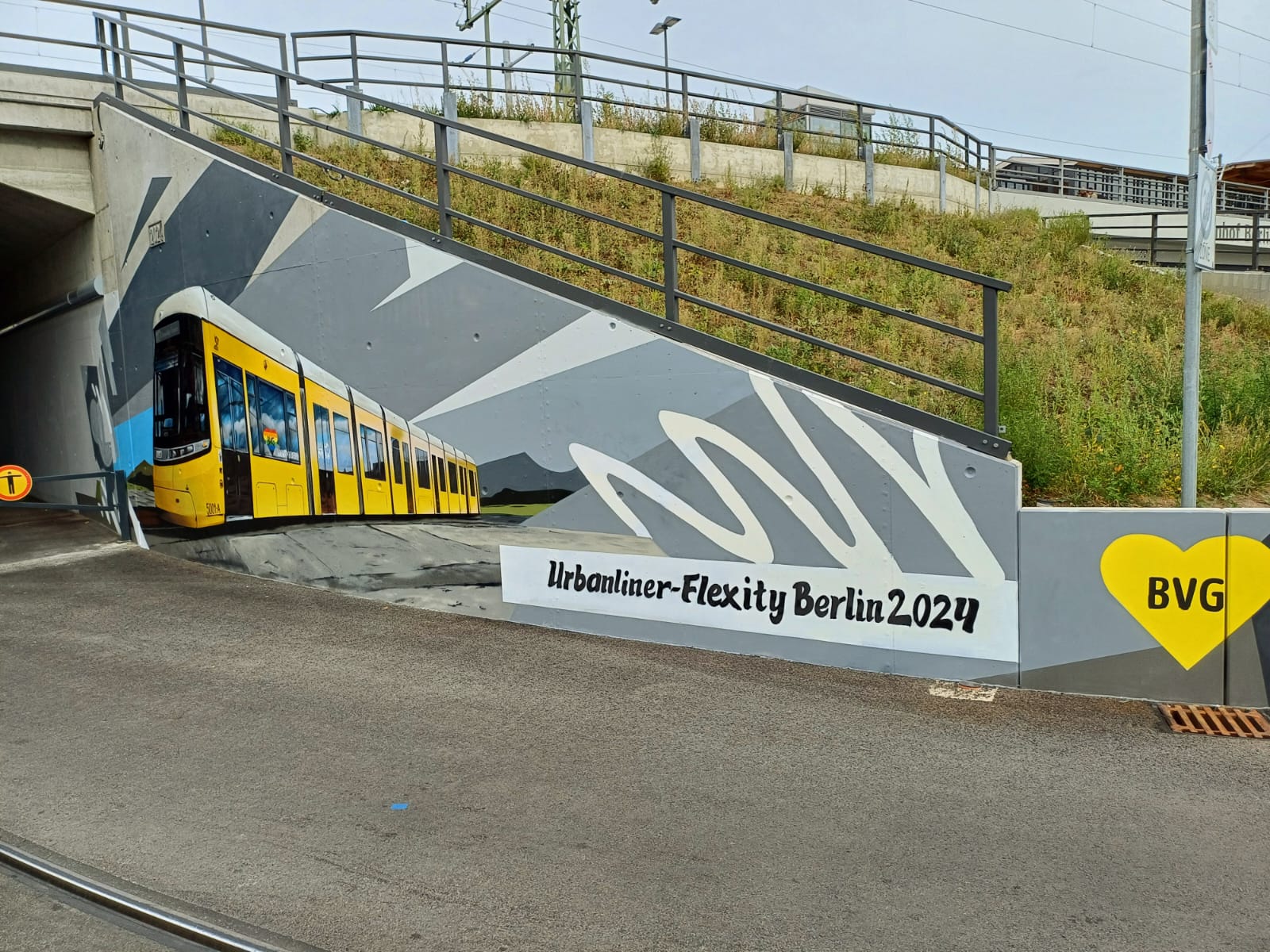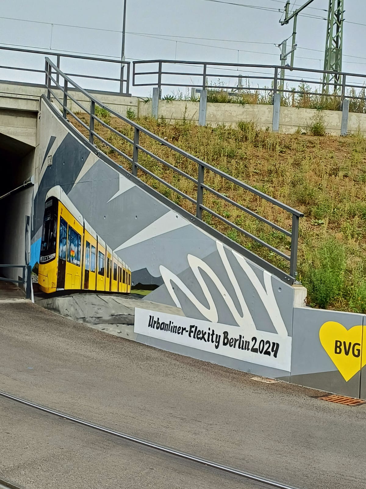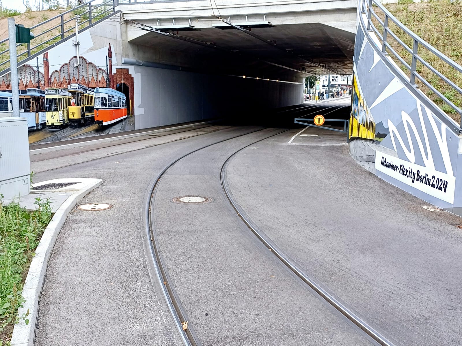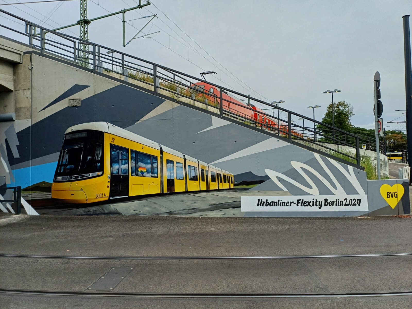 At the Schönweide train station there are several extensive works with tranportation themes located at three spots around the tracks. Directly at the entrance to the S-Bahn station, you can marvel at the large-scale work by STEVEN KARLSTEDT that decorates the walls around the stairs and ramps. The streetcar station and bus station are also located in front of the tracks to the S-Bahn and these tram tracks and the bus road pass under a bridge beneath the S-Bahn tracks. On the east side of the bridge and also on the west side of this tunnel are extensive mural paintings made by FOKUZ DESIGN. Here we have the creations at the east side of the bridge.