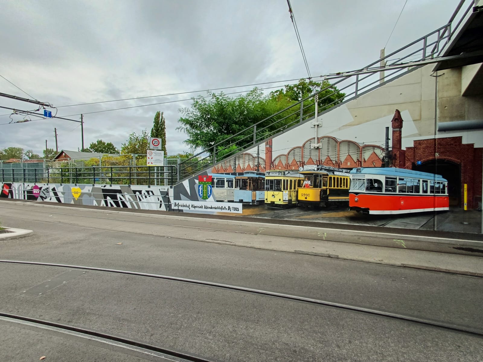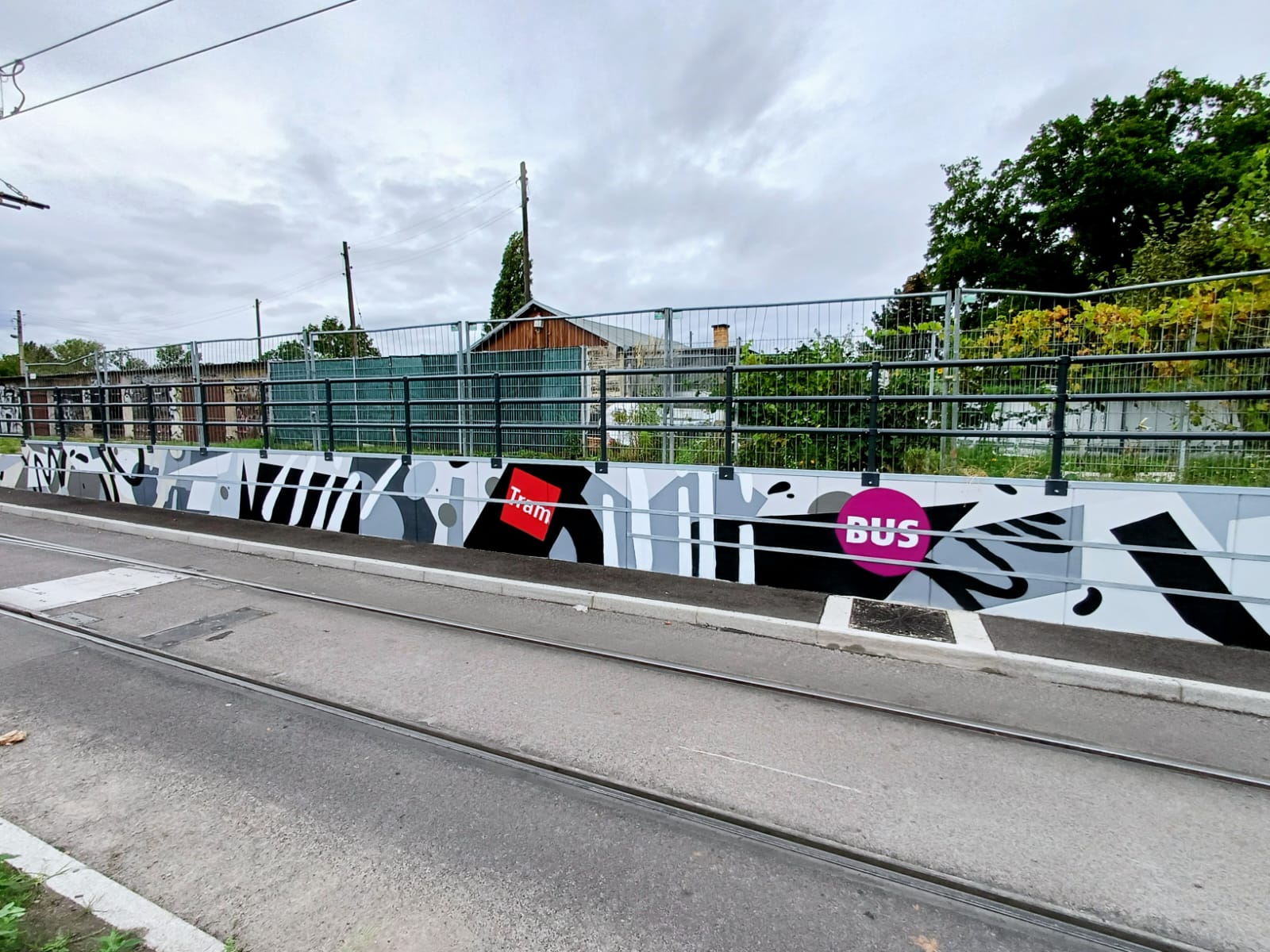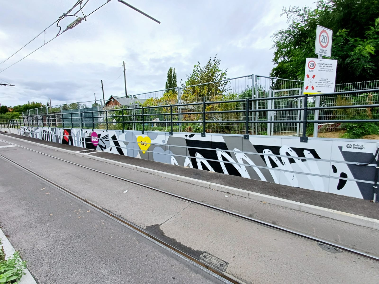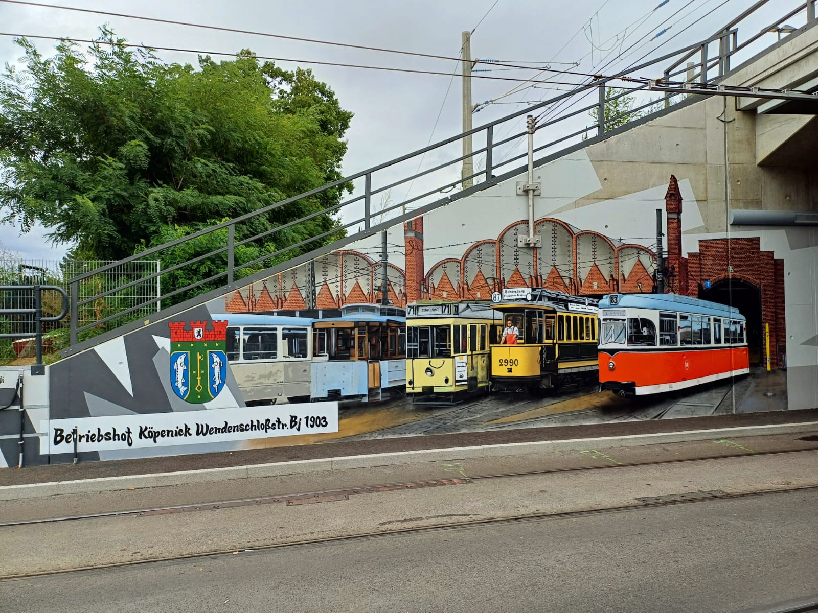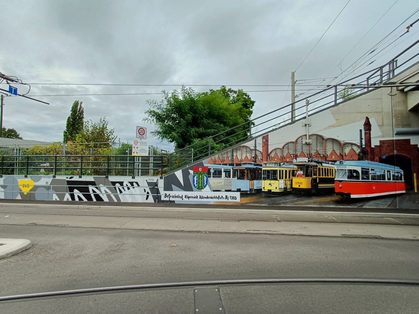 At the Schönweide train station there are several extensive works with tranportation themes located at three spots around the tracks. Directly at the entrance to the S-Bahn station, you can marvel at the large-scale work by STEVEN KARLSTEDT that decorates the walls around the stairs and ramps. The streetcar station and bus station are also located in front of the tracks to the S-Bahn and these tram tracks and the bus road pass under a bridge beneath the S-Bahn tracks. On the east side of the bridge and also on the west side of this tunnel are extensive mural paintings made by FOKUZ DESIGN. Here we have the creations at the east side of the bridge.