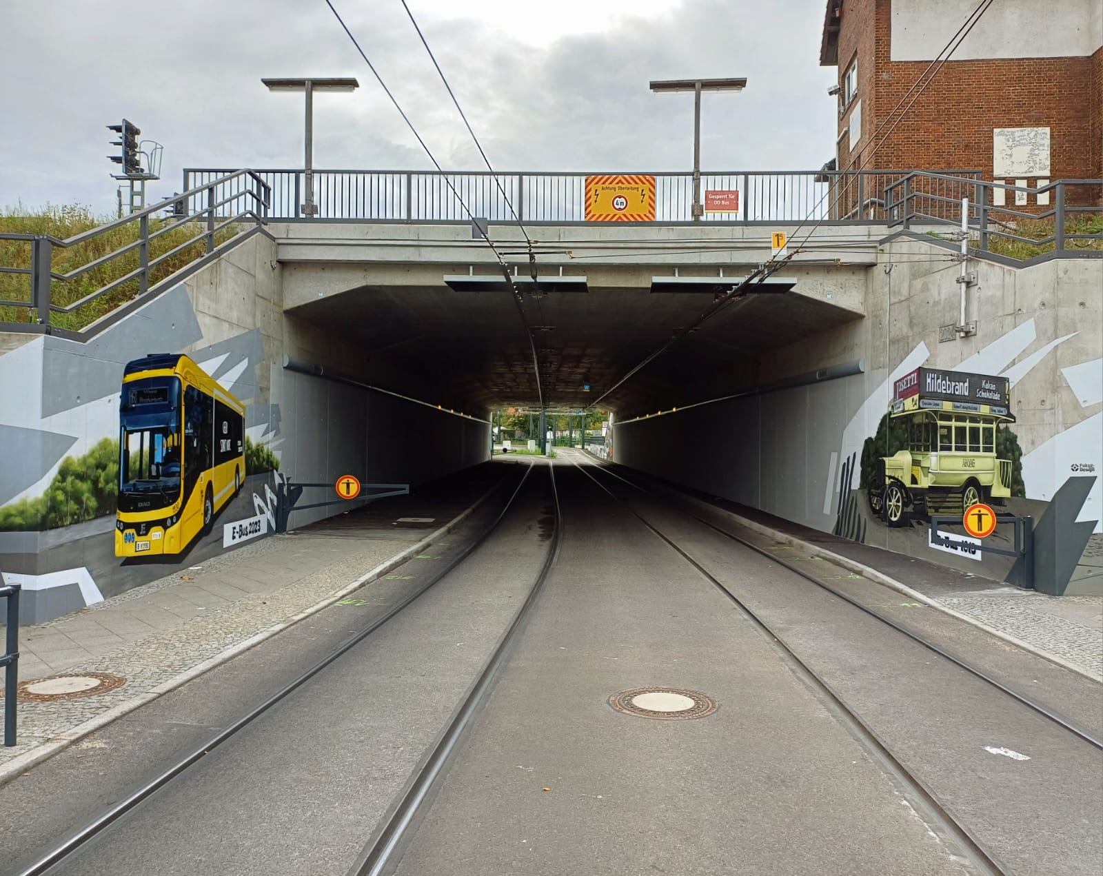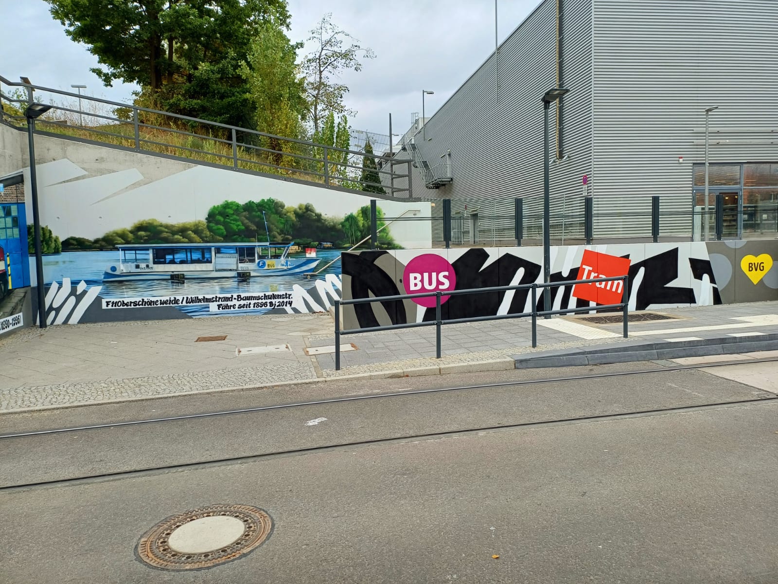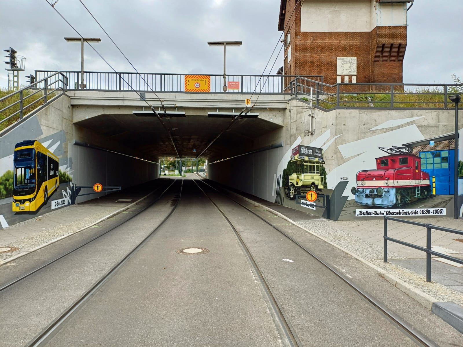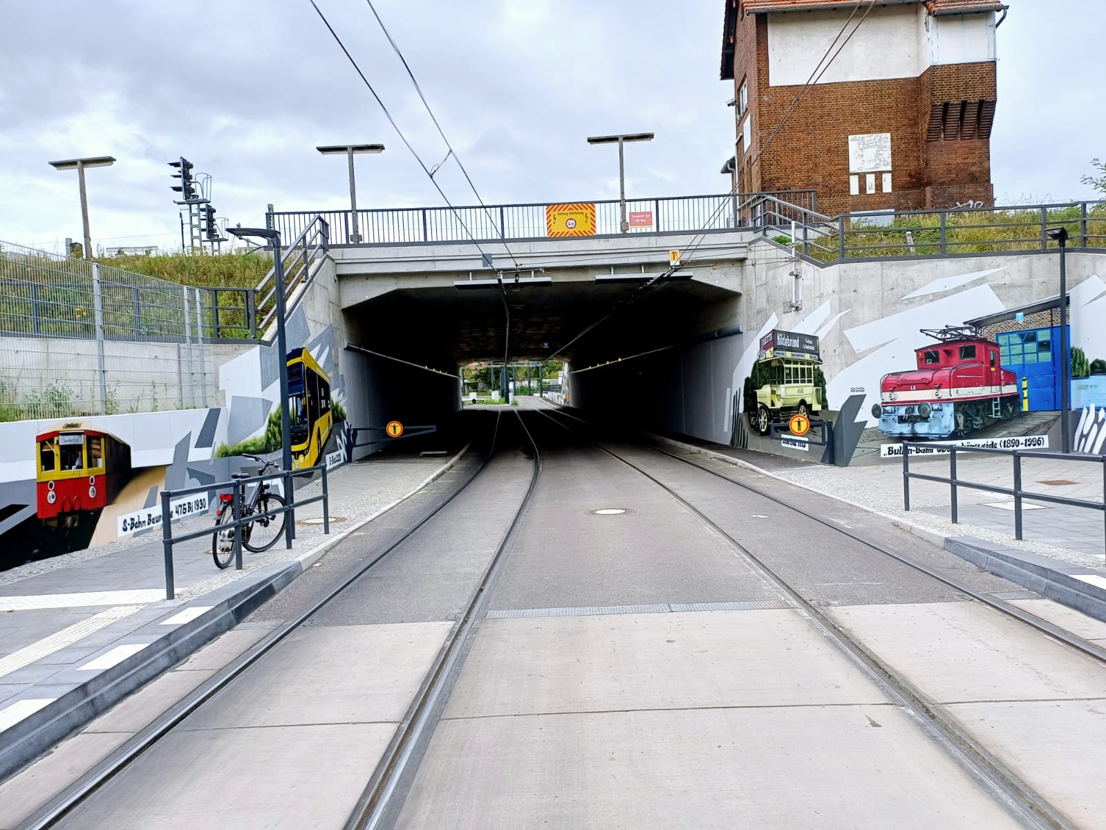 At the Schönweide train station there are several extensive works with tranportation themes located at three spots around the tracks. Directly at the entrance to the S-Bahn station, you can marvel at the large-scale work by STEVEN KARLSTEDT that decorates the walls around the stairs and ramps. The streetcar station and bus station are also located in front of the tracks to the S-Bahn and these tram tracks and the bus road pass under a bridge beneath the S-Bahn tracks. On the east side of the bridge and also on the west side of this tunnel are extensive mural paintings made by FOKUZ DESIGN. Here we have the creations at the west side of the bridge.