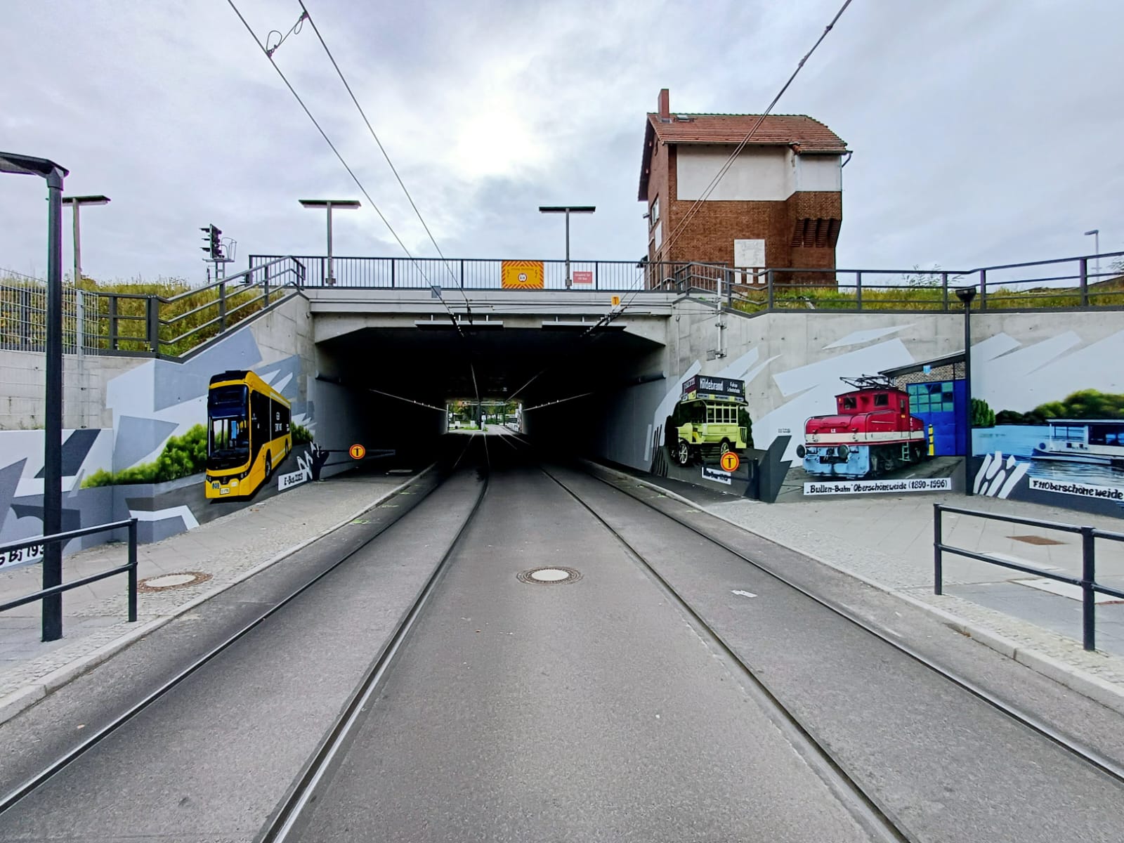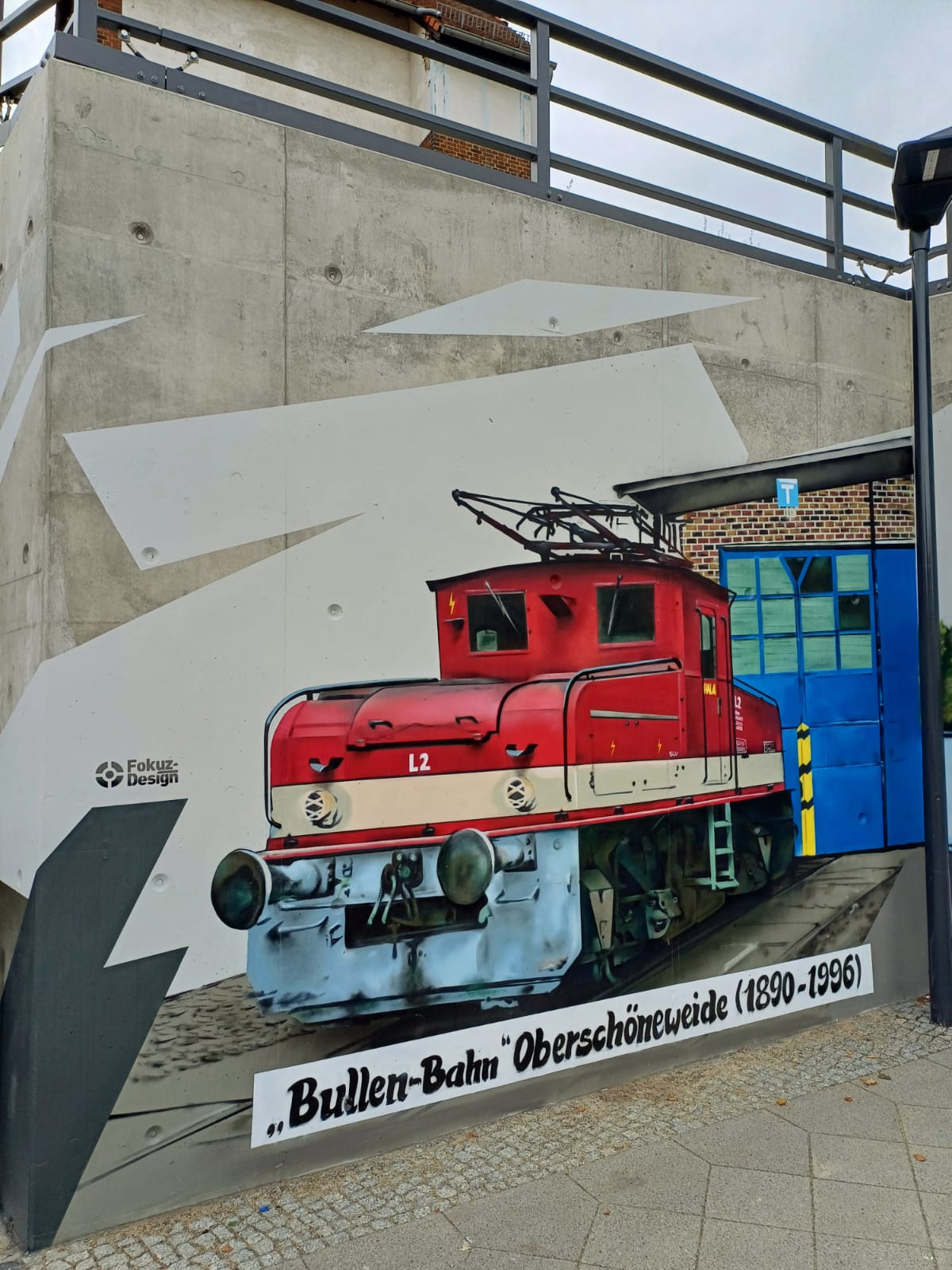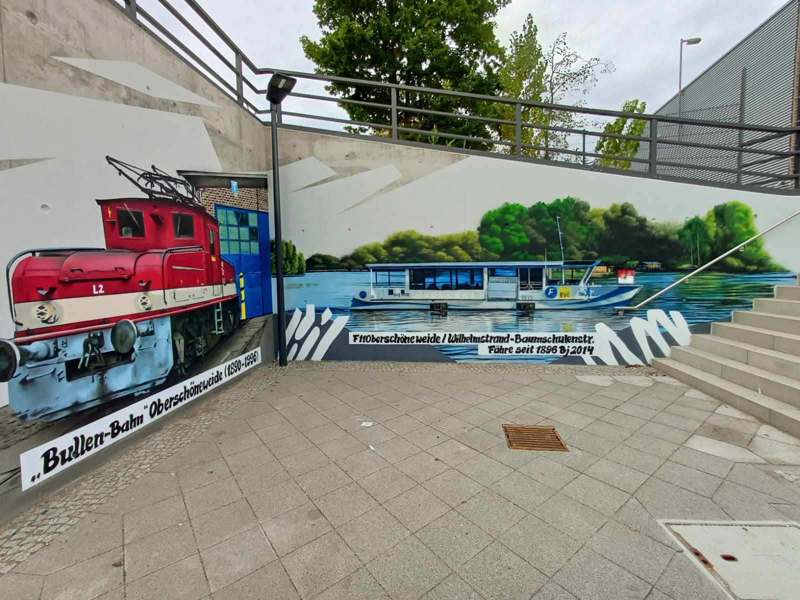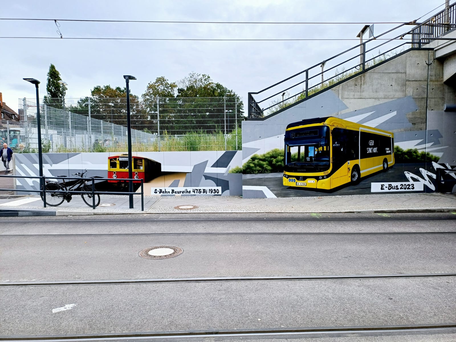 At the Schönweide train station there are several extensive works with tranportation themes located at three spots around the tracks. Directly at the entrance to the S-Bahn station, you can marvel at the large-scale work by STEVEN KARLSTEDT that decorates the walls around the stairs and ramps. The streetcar station and bus station are also located in front of the tracks to the S-Bahn and these tram tracks and the bus road pass under a bridge beneath the S-Bahn tracks. On the east side of the bridge and also on the west side of this tunnel are extensive mural paintings made by FOKUZ DESIGN. Here we have the creations at the west side of the bridge.