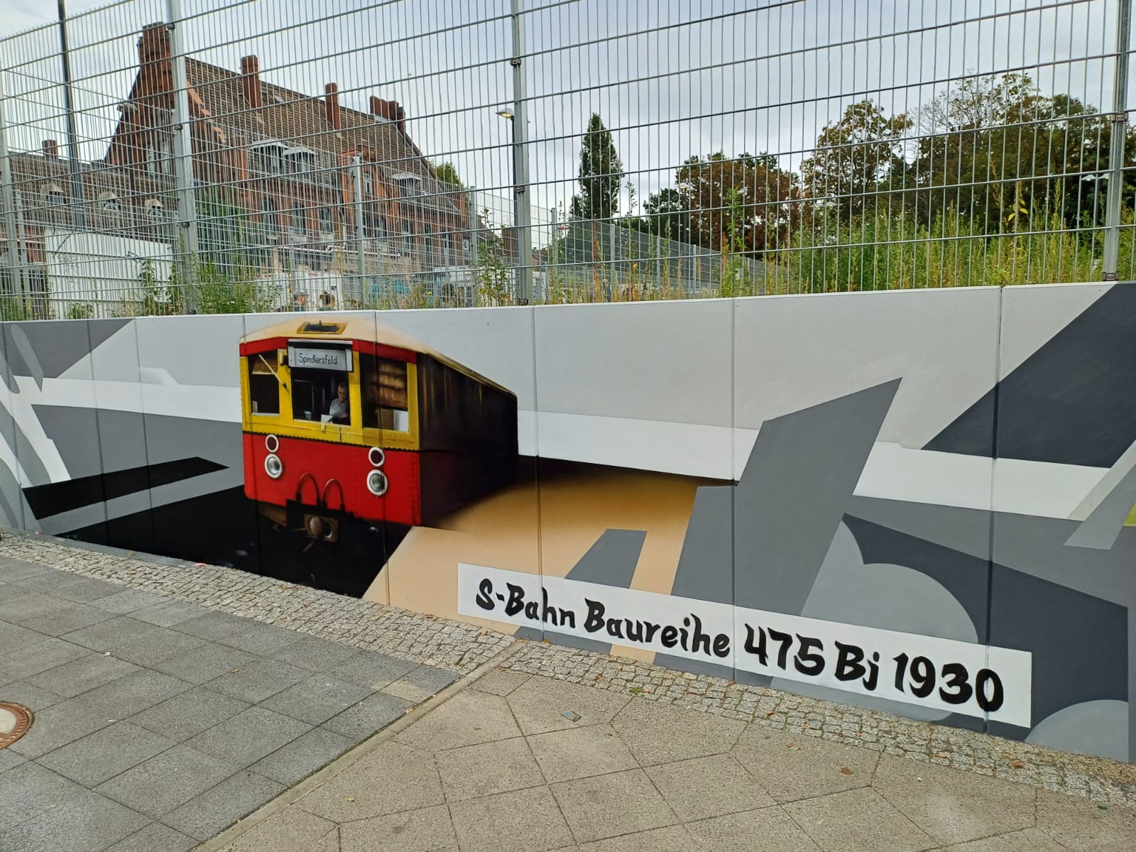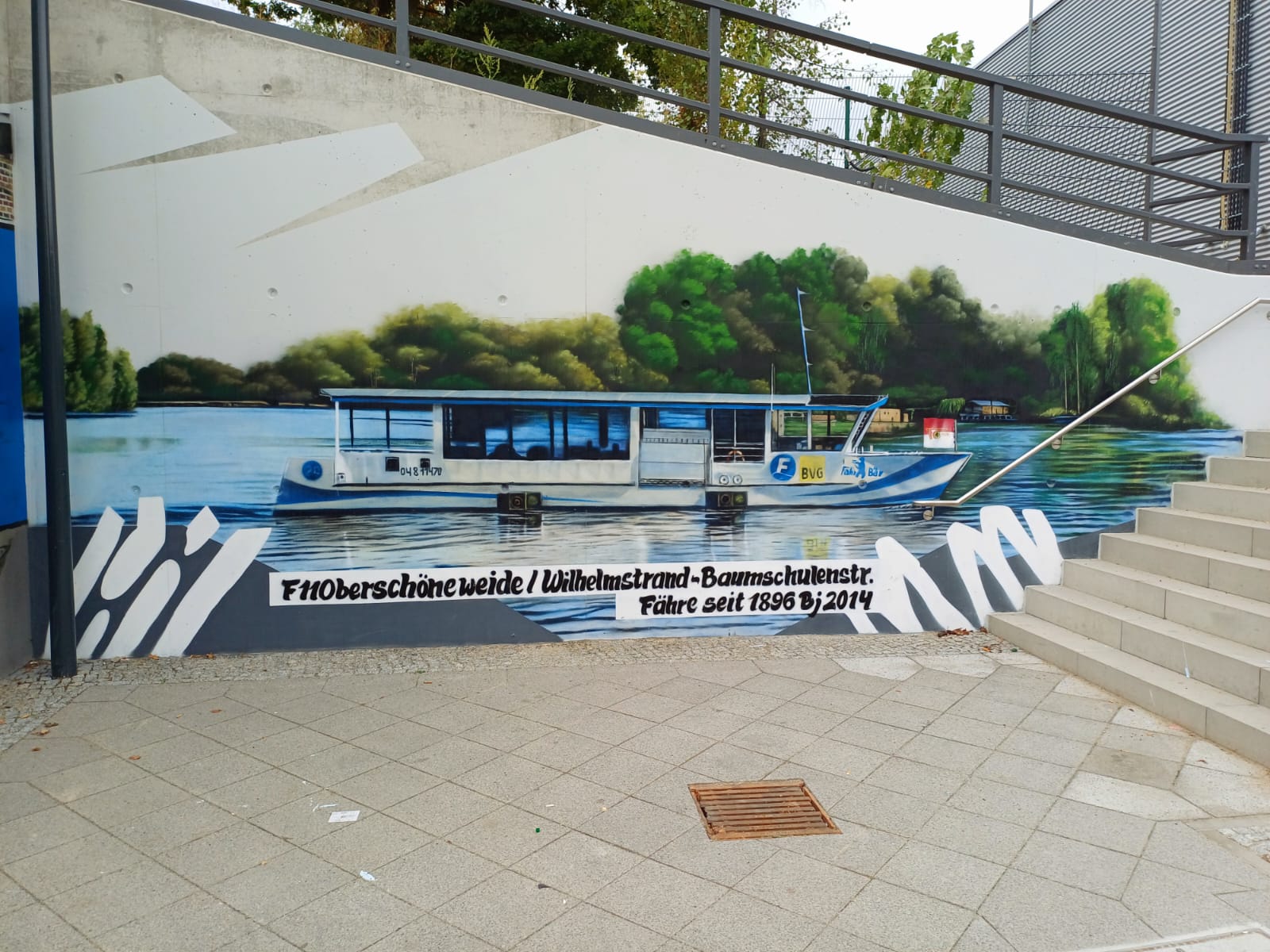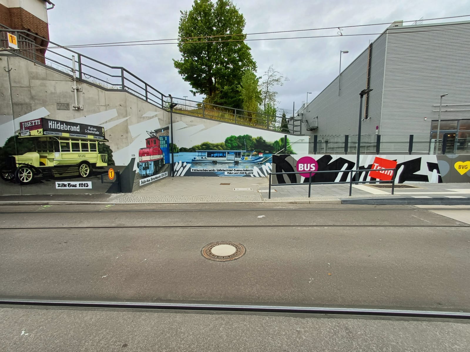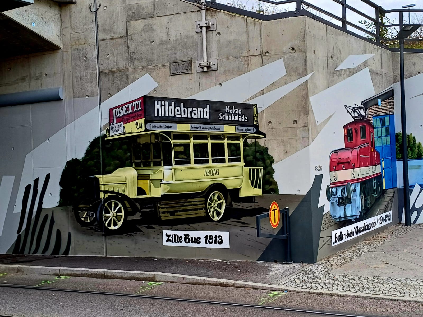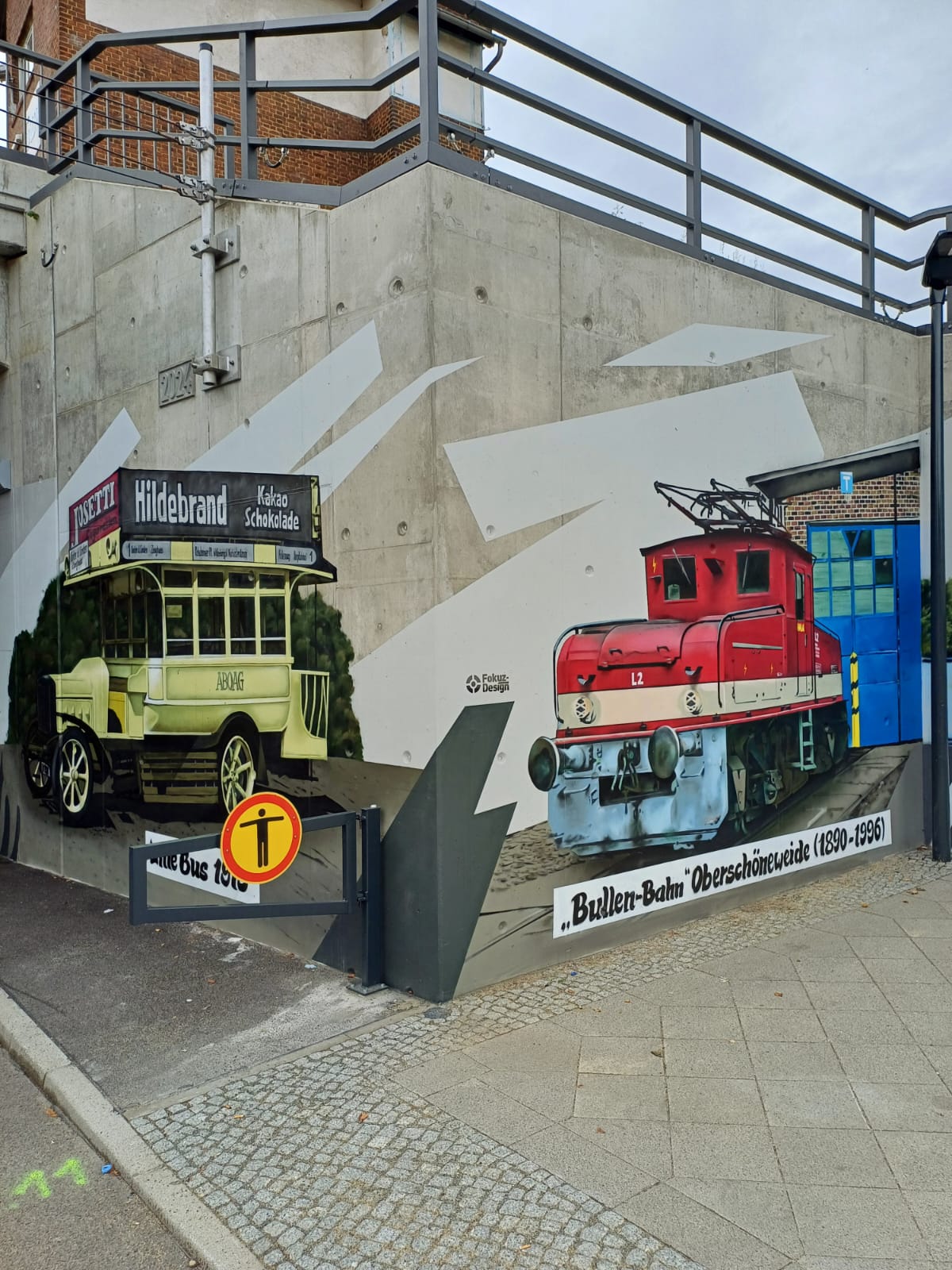 At the Schönweide train station there are several extensive works with tranportation themes located at three spots around the tracks. Directly at the entrance to the S-Bahn station, you can marvel at the large-scale work by STEVEN KARLSTEDT that decorates the walls around the stairs and ramps. The streetcar station and bus station are also located in front of the tracks to the S-Bahn and these tram tracks and the bus road pass under a bridge beneath the S-Bahn tracks. On the east side of the bridge and also on the west side of this tunnel are extensive mural paintings made by FOKUZ DESIGN. Here we have the creations at the west side of the bridge.