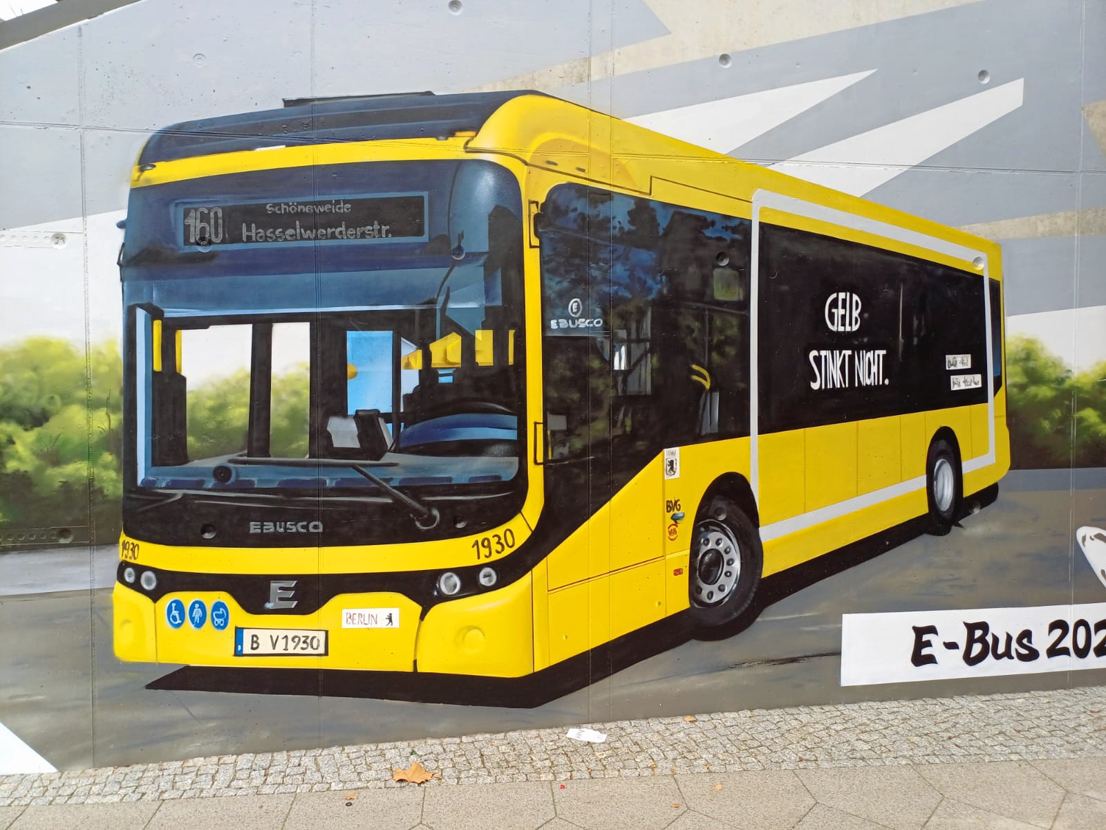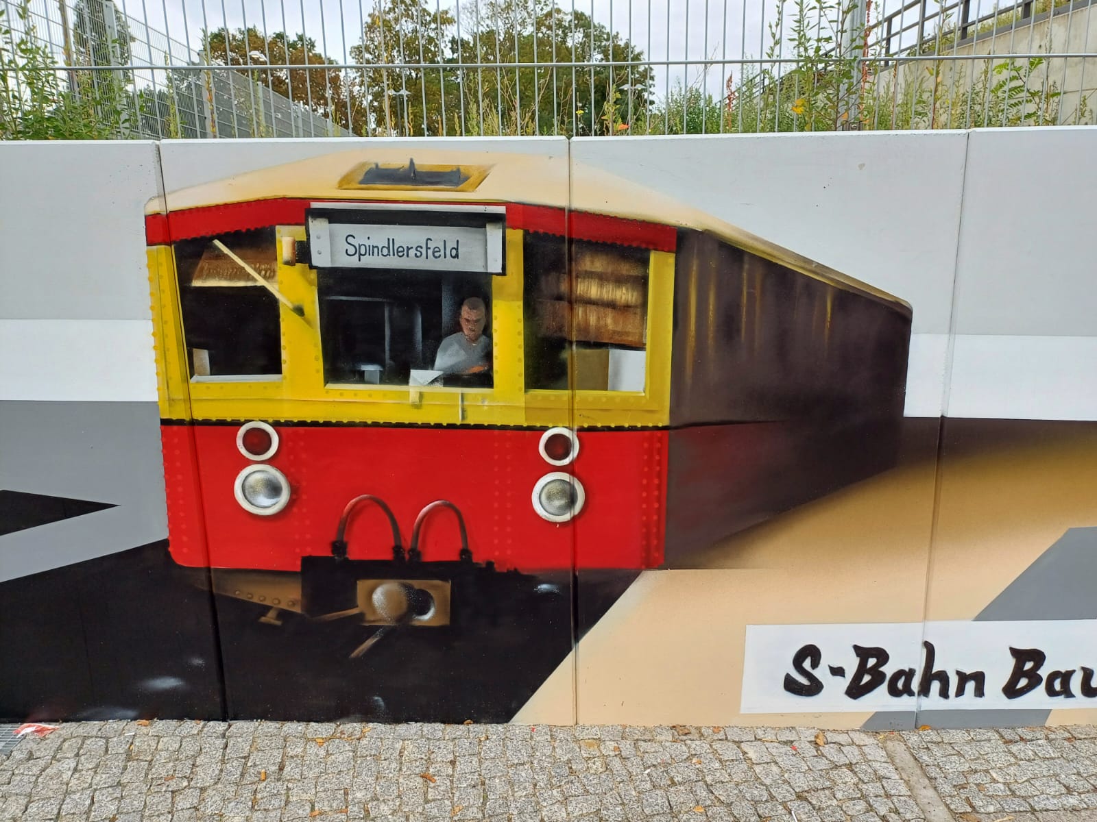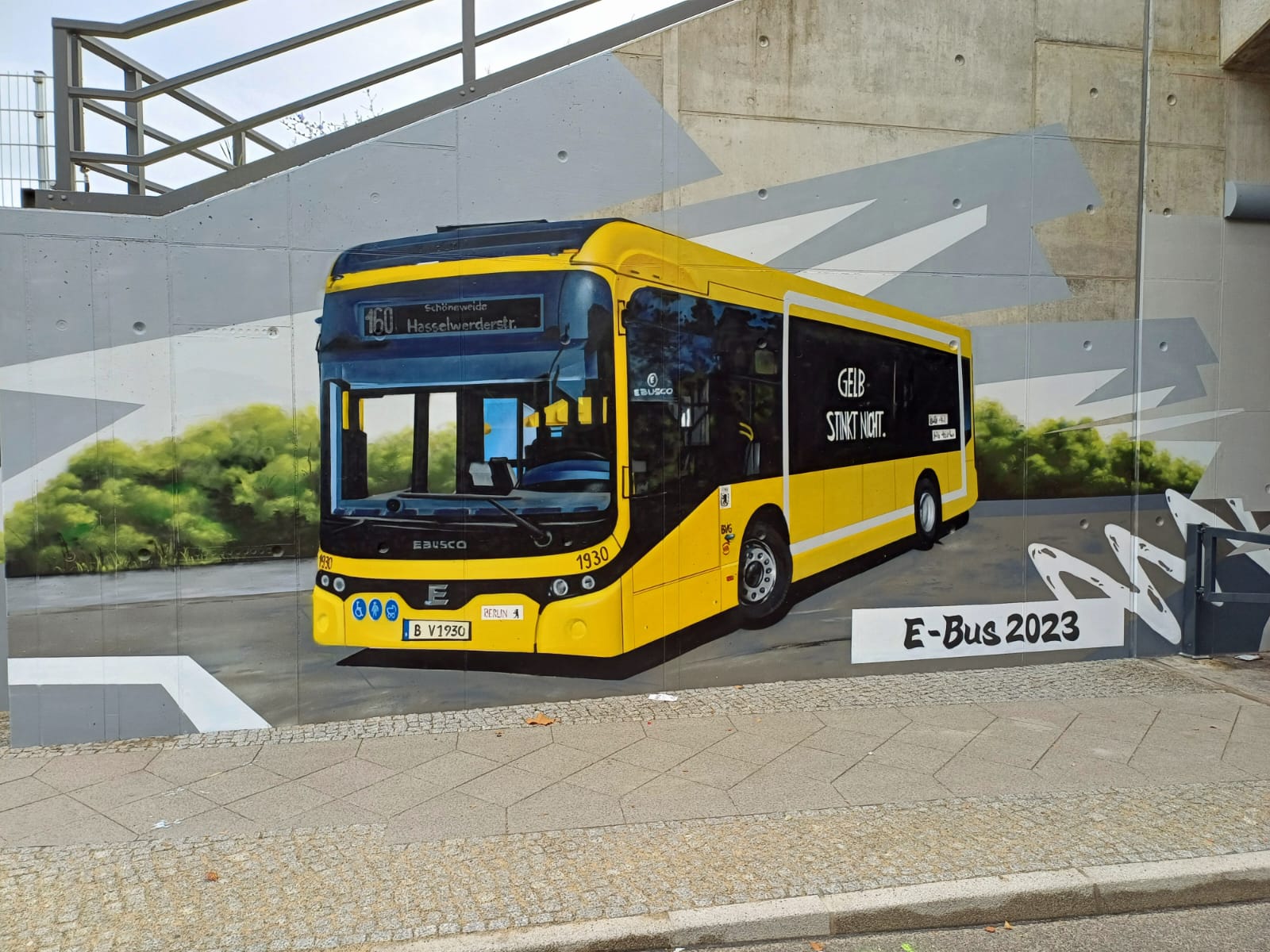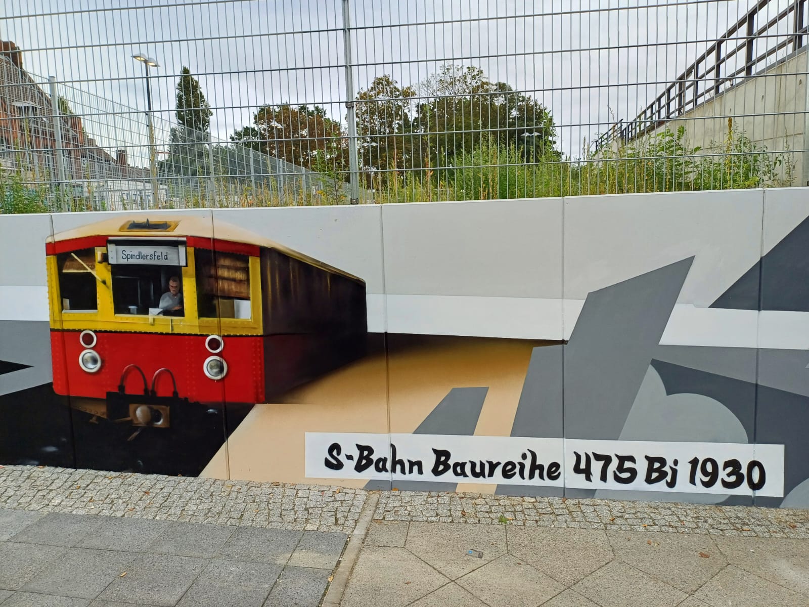 At the Schönweide train station there are several extensive works with tranportation themes located at three spots around the tracks. Directly at the entrance to the S-Bahn station, you can marvel at the large-scale work by STEVEN KARLSTEDT that decorates the walls around the stairs and ramps. The streetcar station and bus station are also located in front of the tracks to the S-Bahn and these tram tracks and the bus road pass under a bridge beneath the S-Bahn tracks. On the east side of the bridge and also on the west side of this tunnel are extensive mural paintings made by FOKUZ DESIGN. Here we have the creations at the west side of the bridge.