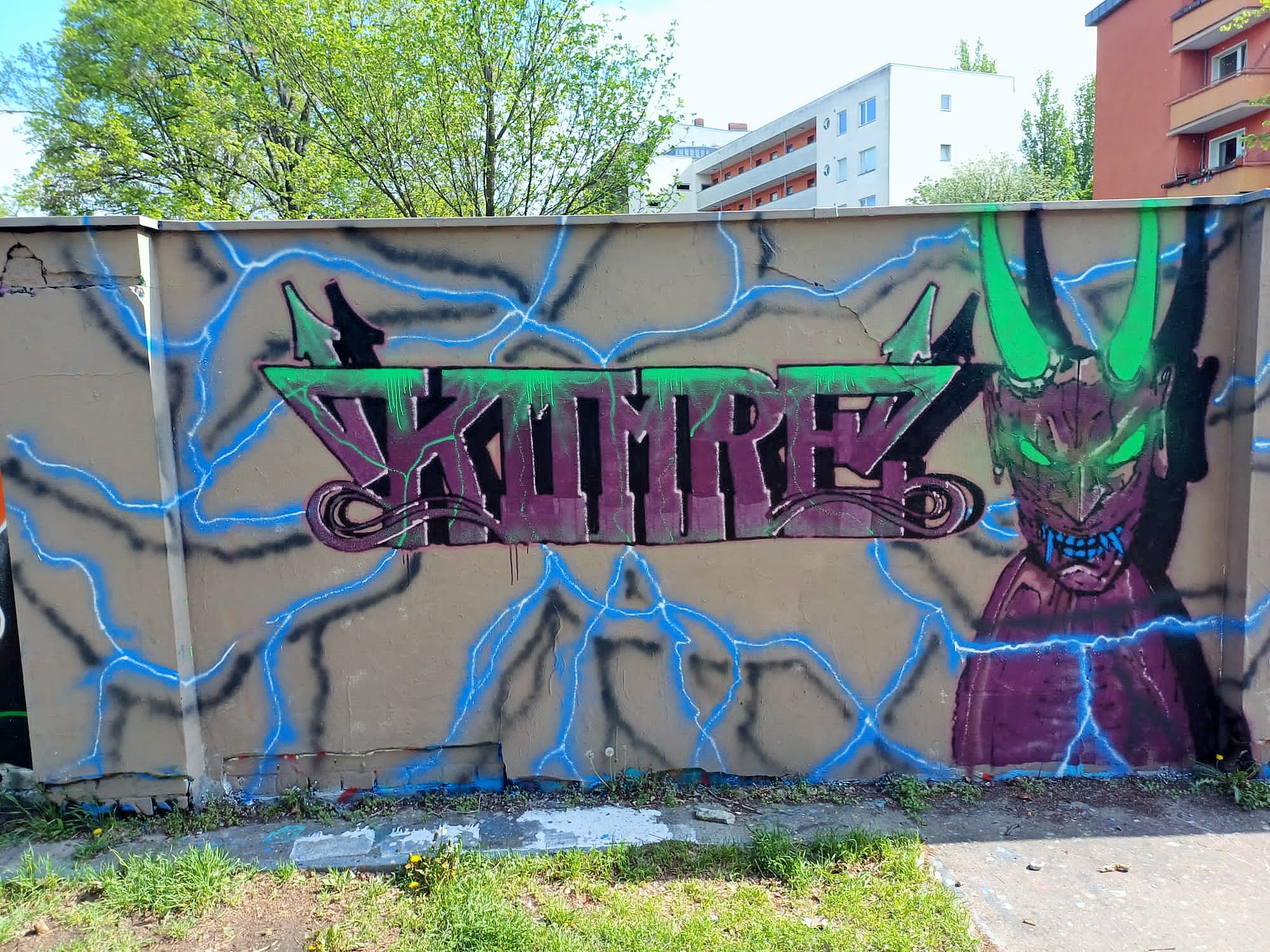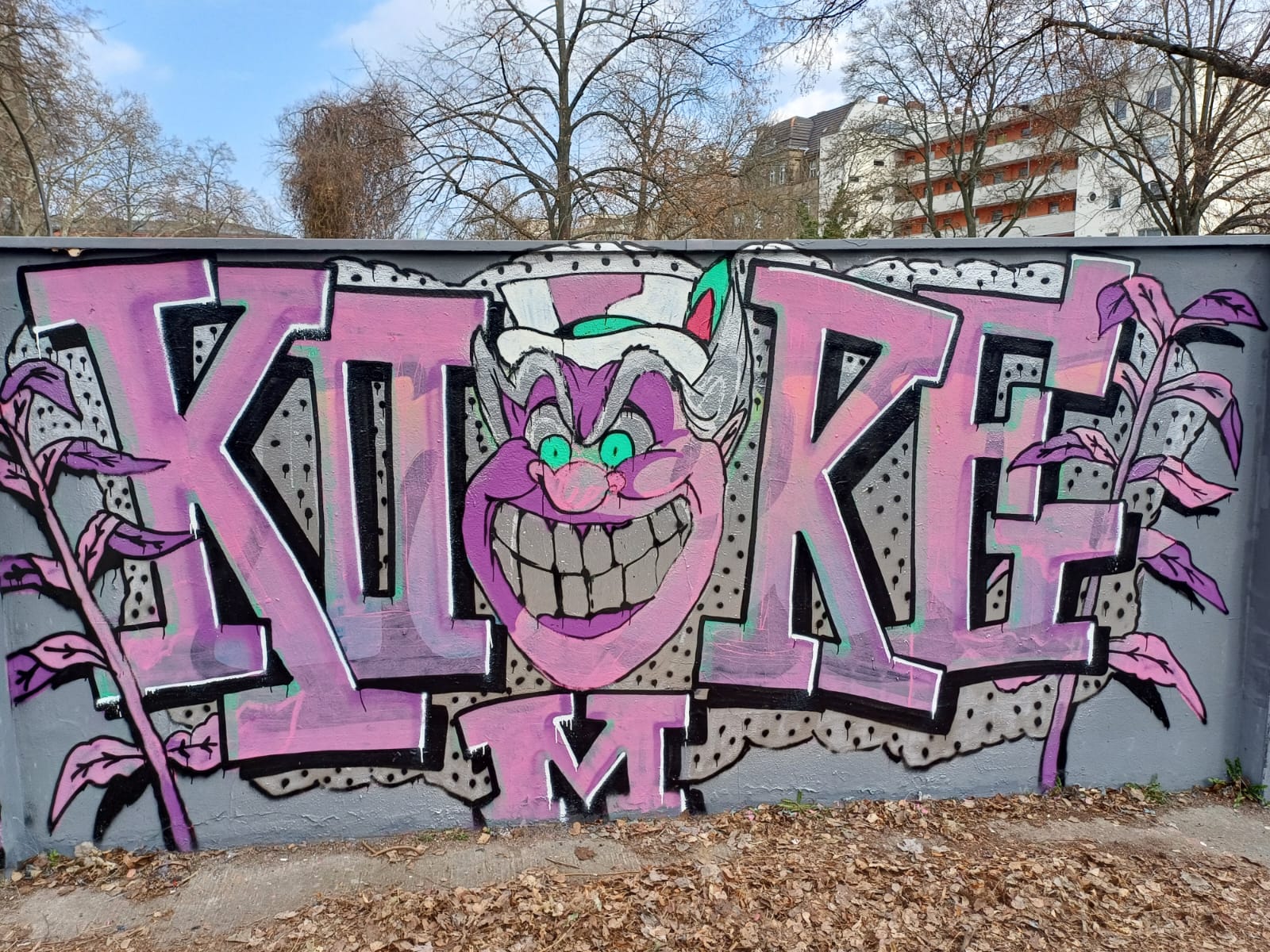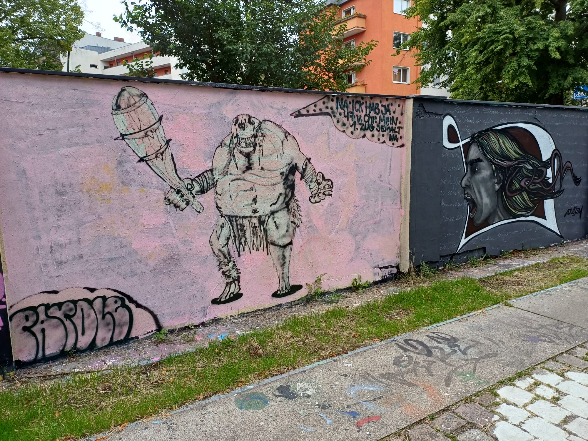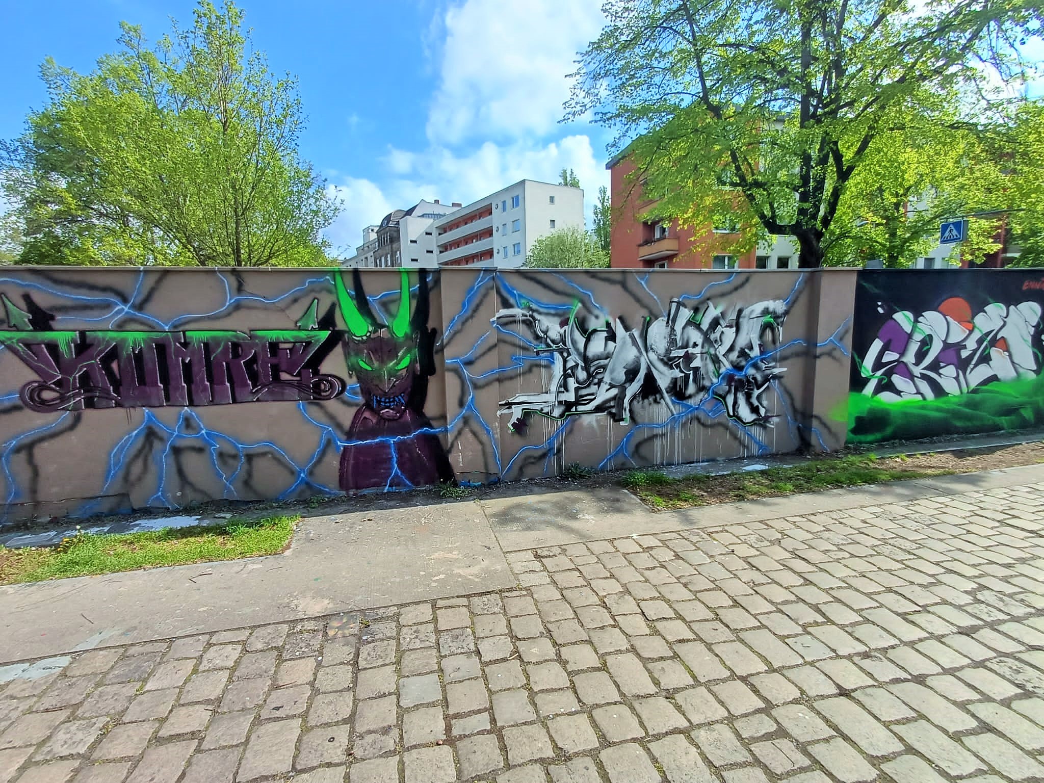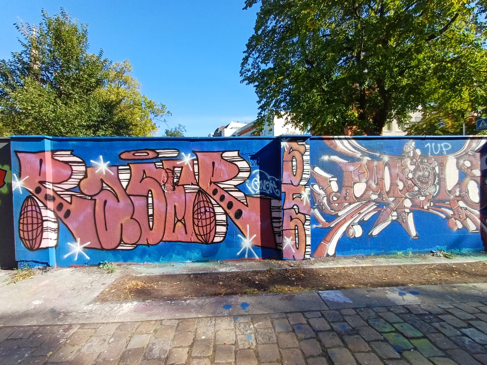 The graffiti on the left is from KIELKA, the blue character on the right is from MASCHA MIND and the graffiti on the right was made by KARO