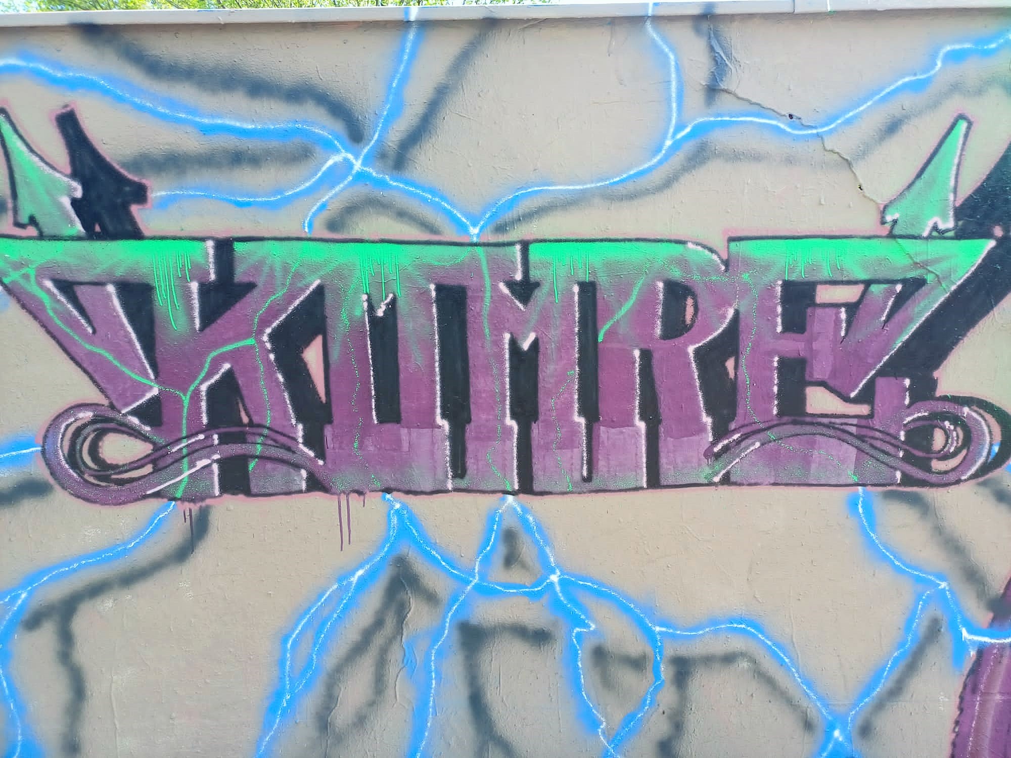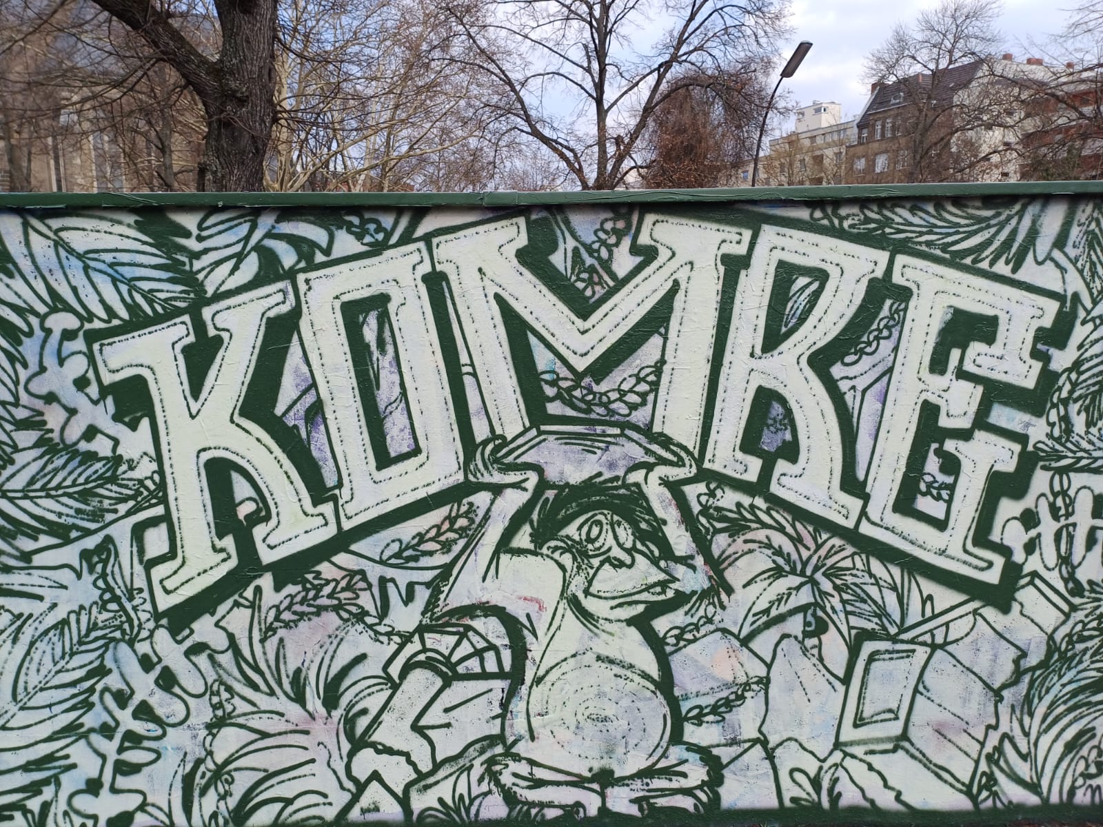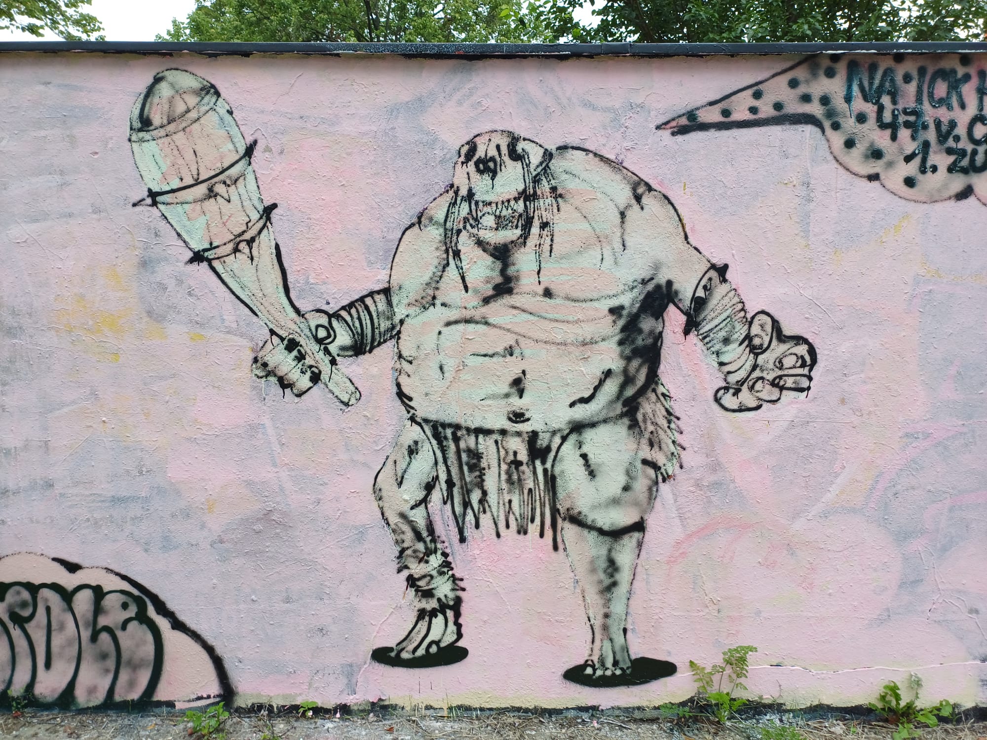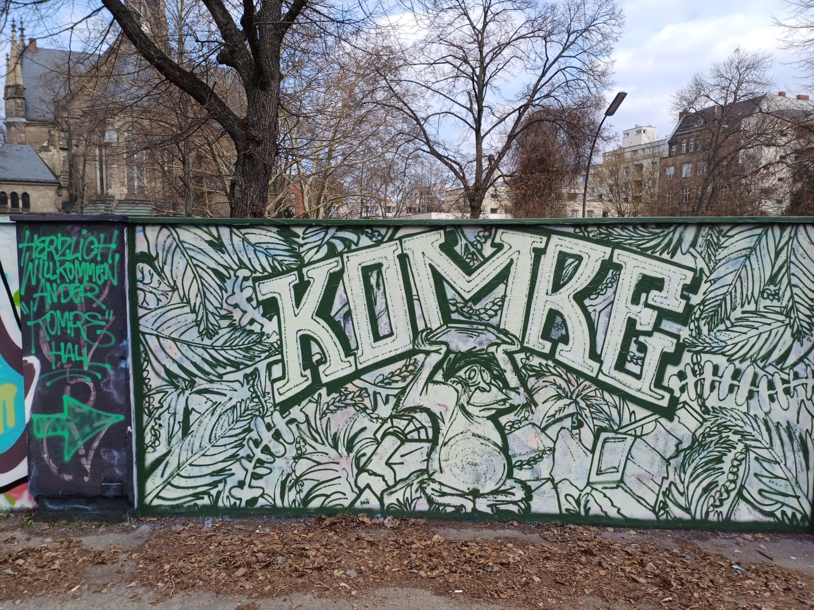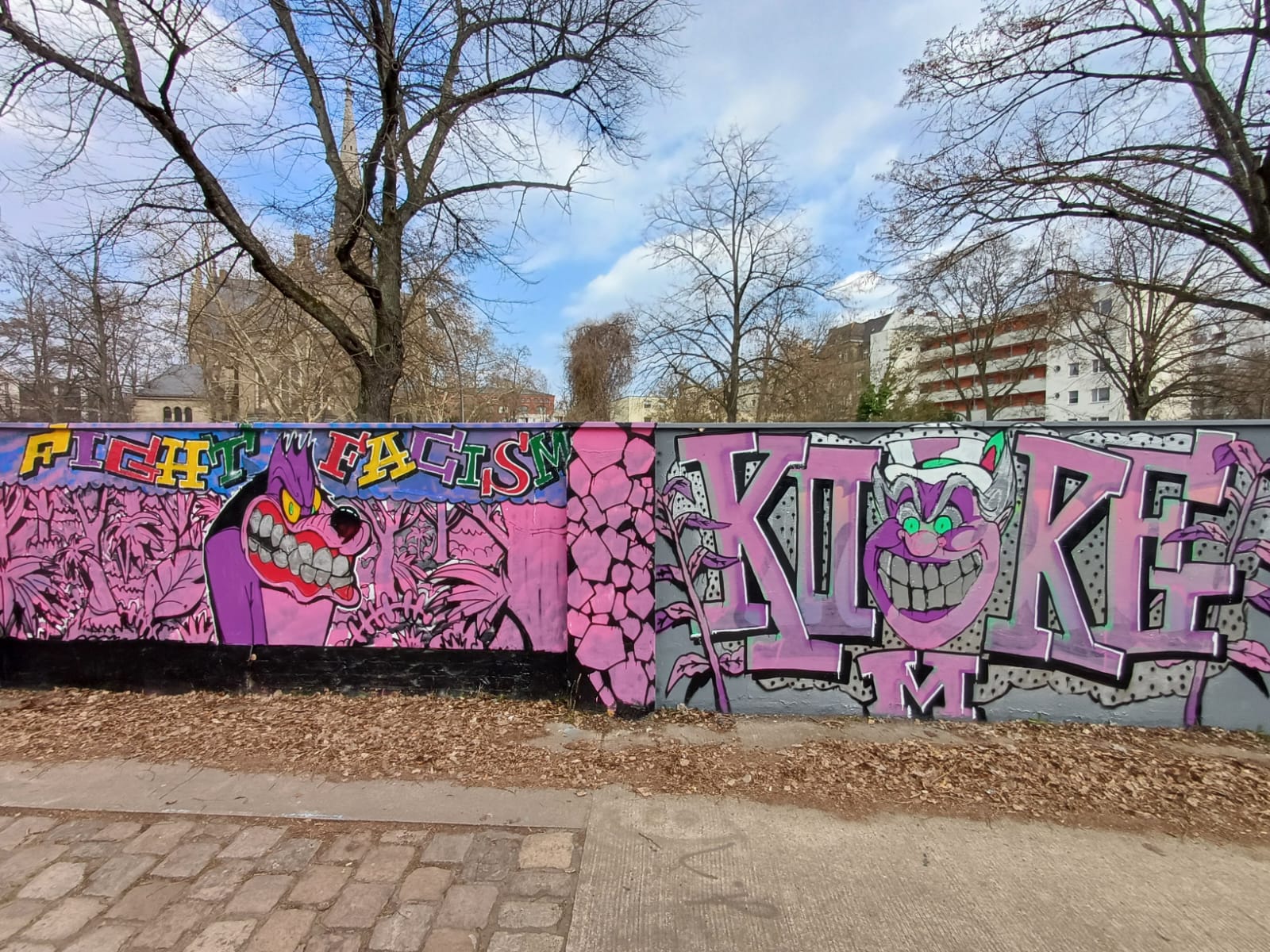 The graffiti on the left is from KIELKA, the blue character on the right is from MASCHA MIND and the graffiti on the right was made by KARO