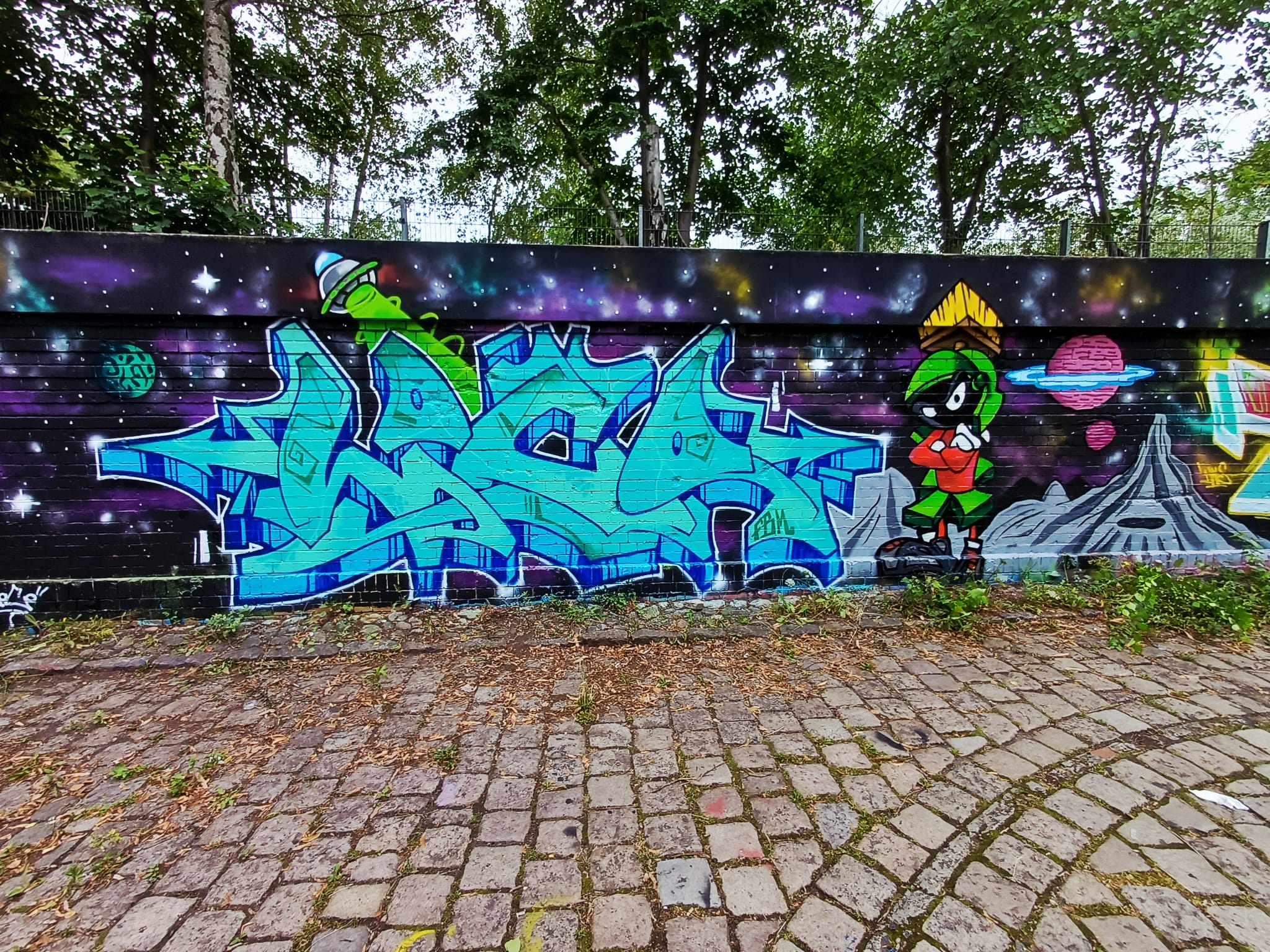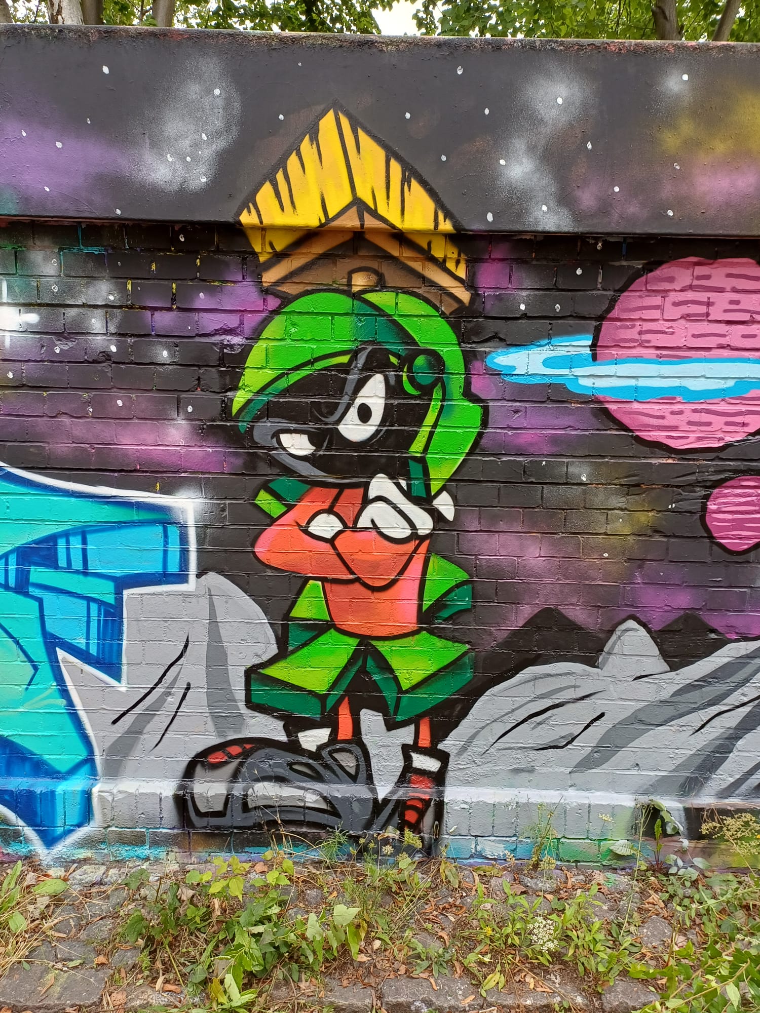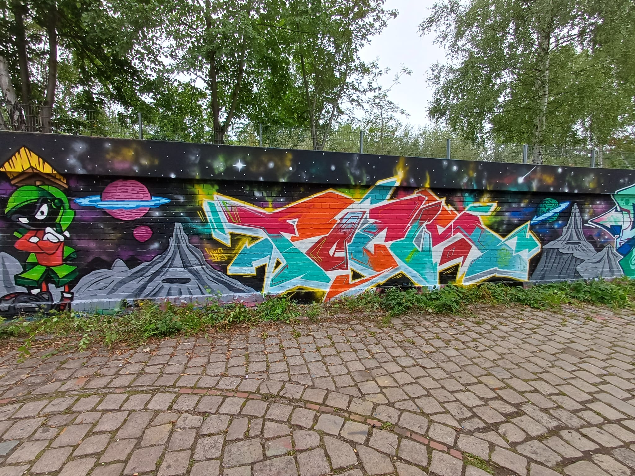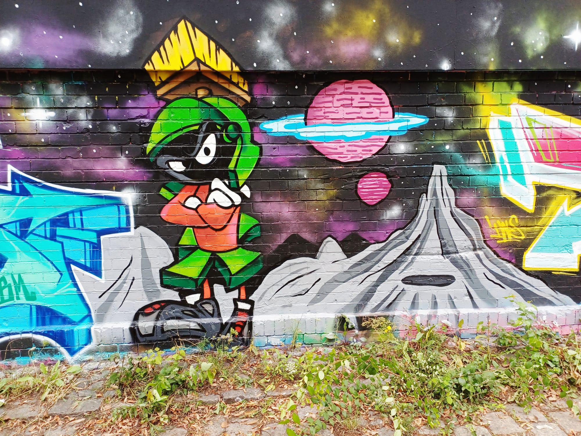 This great wall and the scenery around it was made as a tribute to Marvin the Martian from the Looney Tunes. A legendary character, also the graffiti are legendary. The pieces on the right are from FOCUS and SEM. Each artist made the individual graffiti style, but the whole wall was made together by all of them in a collaboration theme.