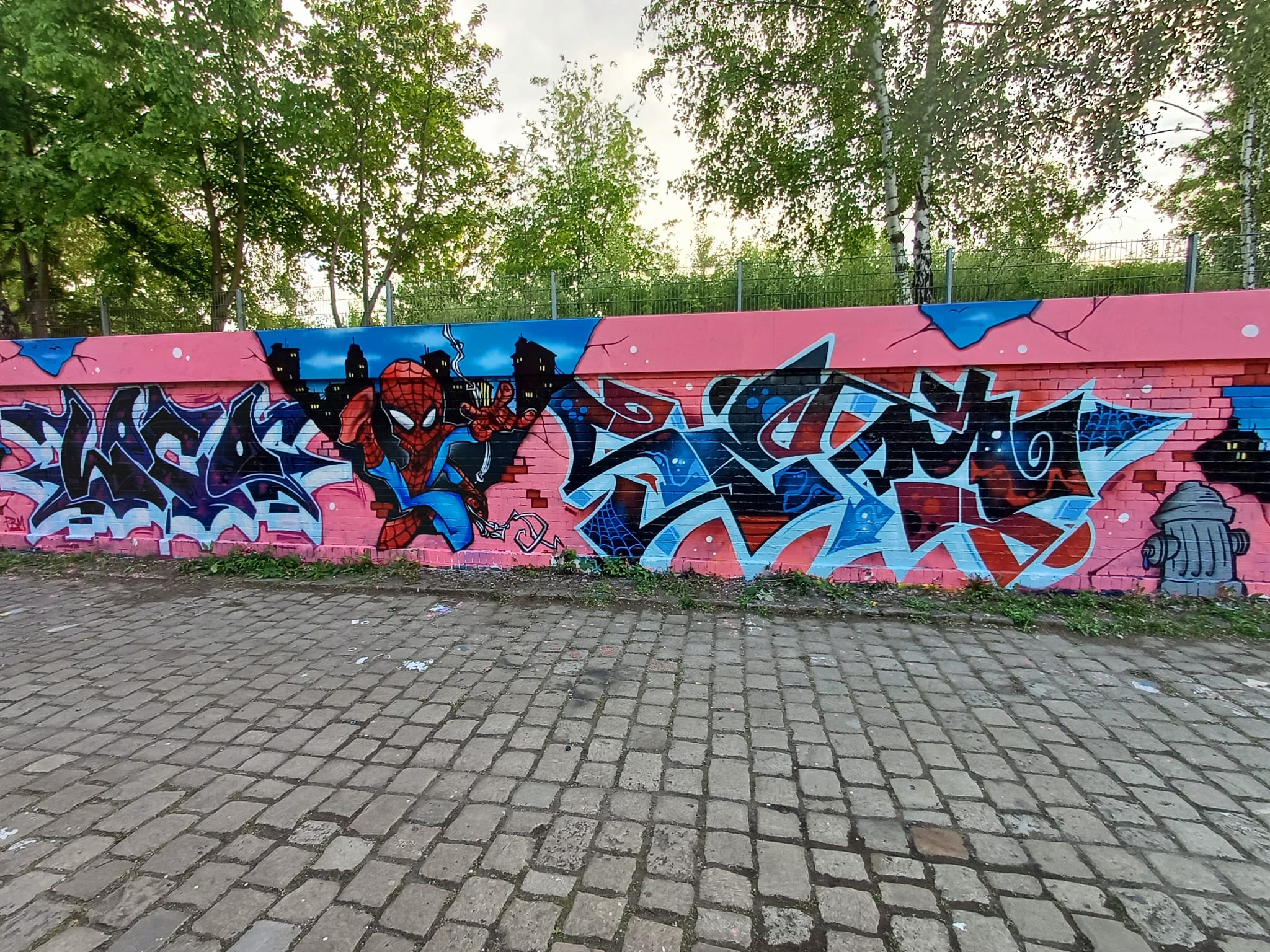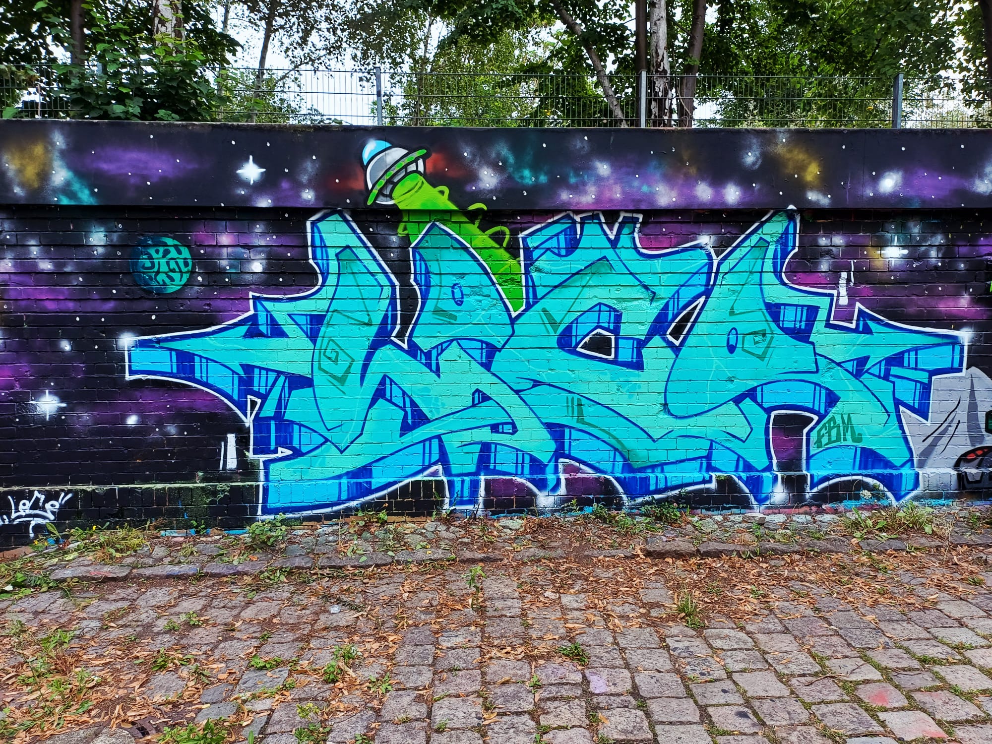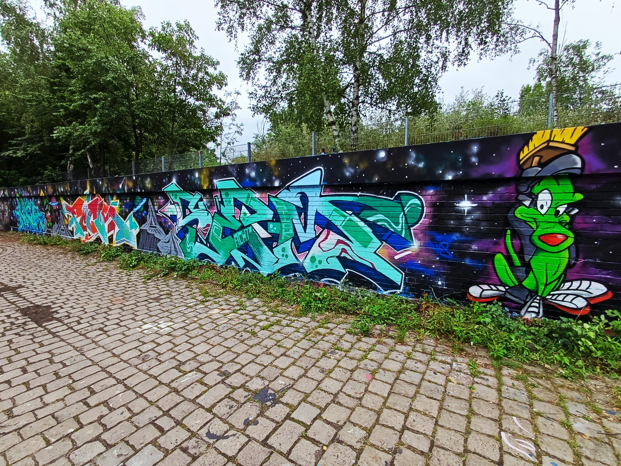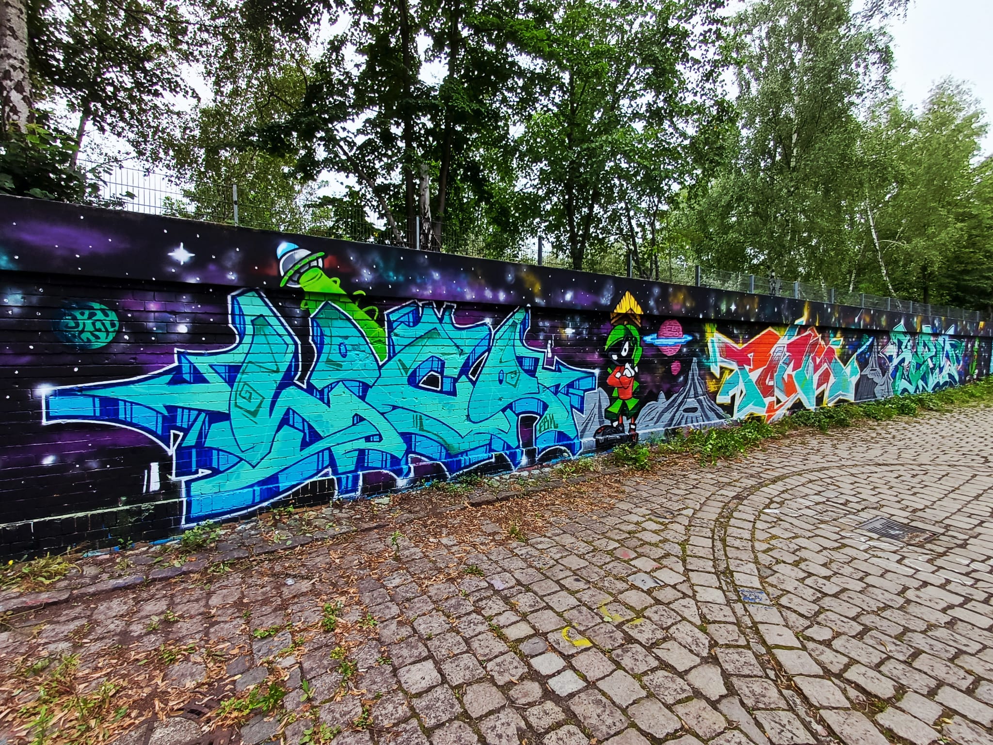This great wall and the scenery around it was made as a tribute to Marvin the Martian from the Looney Tunes. A legendary character, also the graffiti are legendary. The pieces on the right are from FOCUS and SEM. Each artist made the individual graffiti style, but the whole wall was made together by all of them in a collaboration theme.