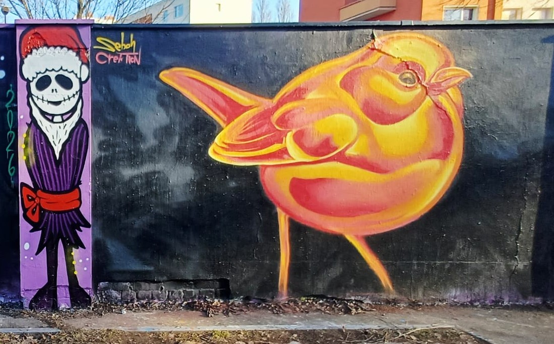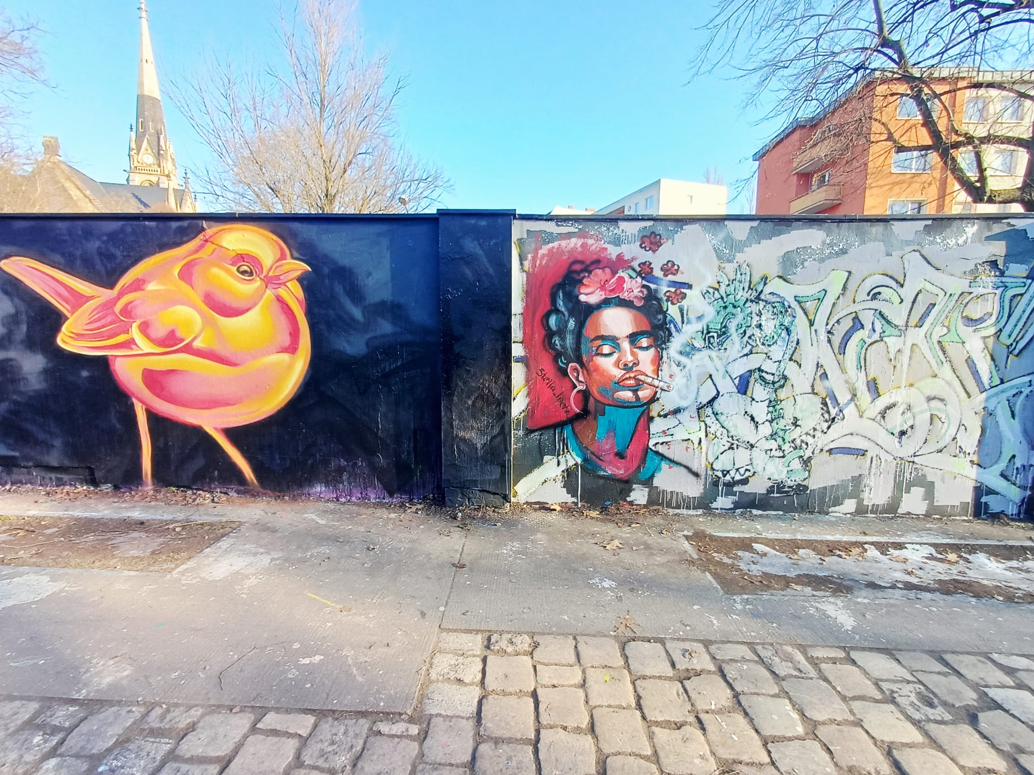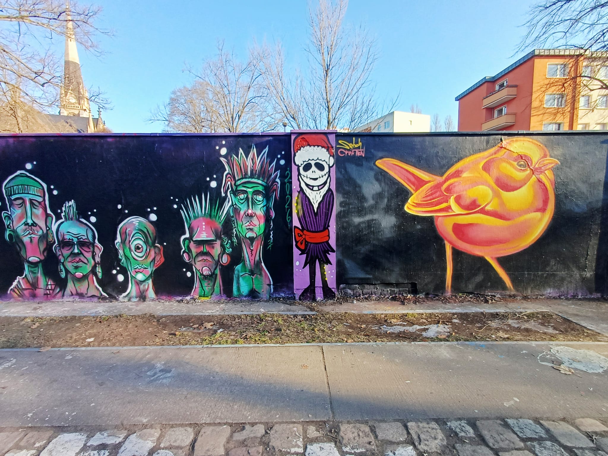 The characters on the left are from COSMEAN, the portrait in the middle was made by STELLA LOONA and the graffiti on the right is from KOMRE