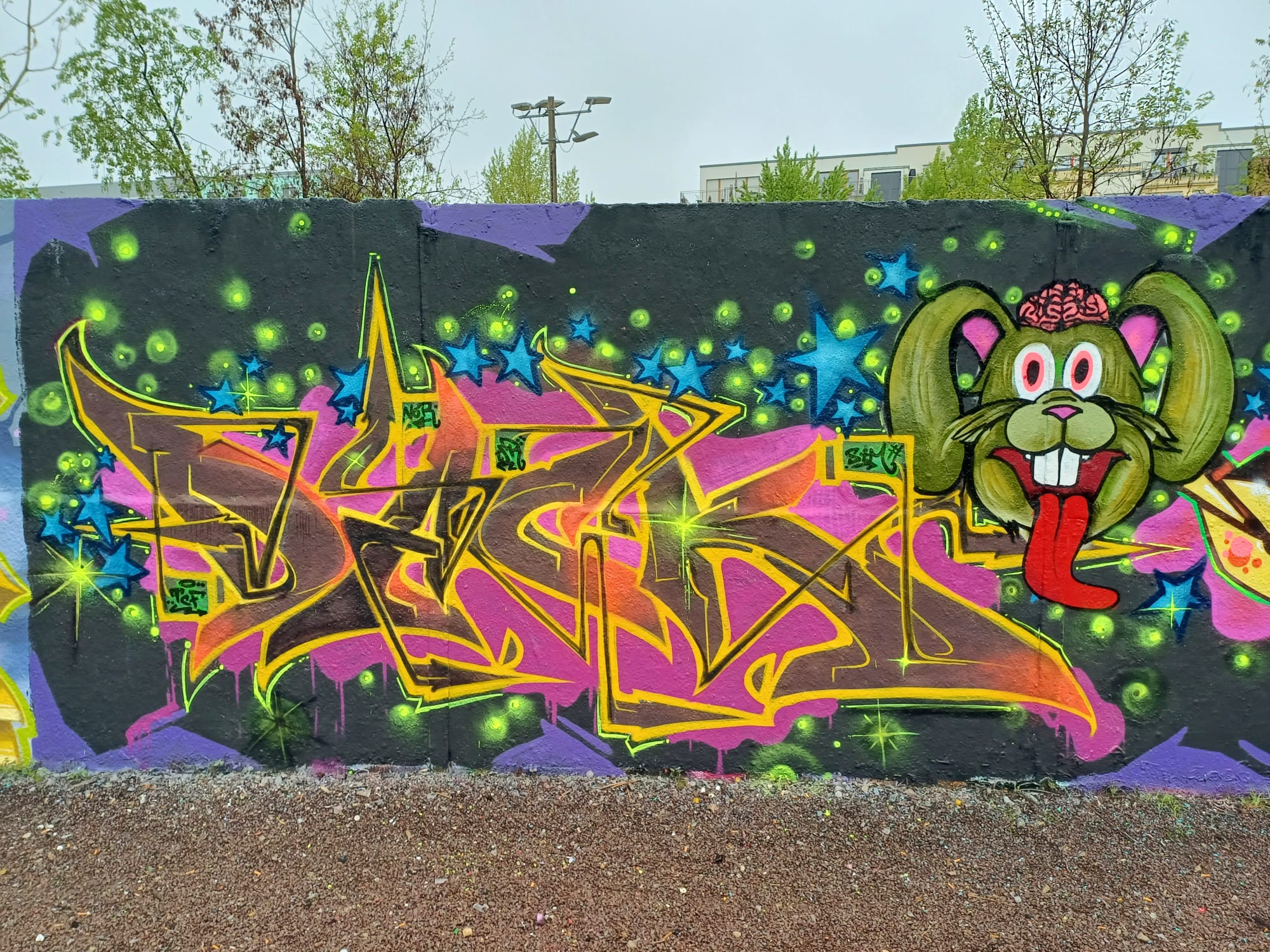The character on the left is from LOYD GOLD and the graffiti on the right was made by EWAK