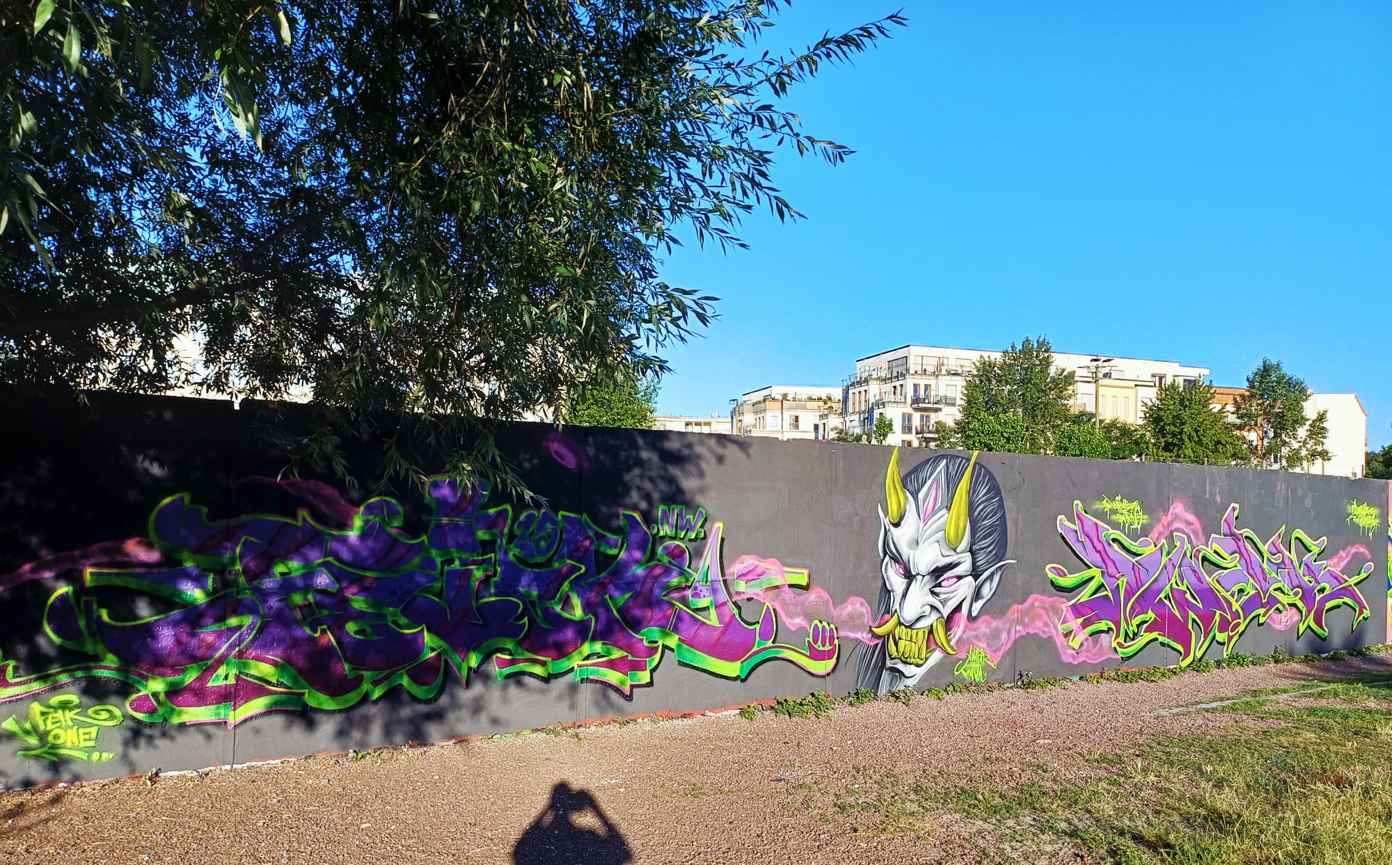 The graffiti on the left is from RETOK and the character was made by both artists together.