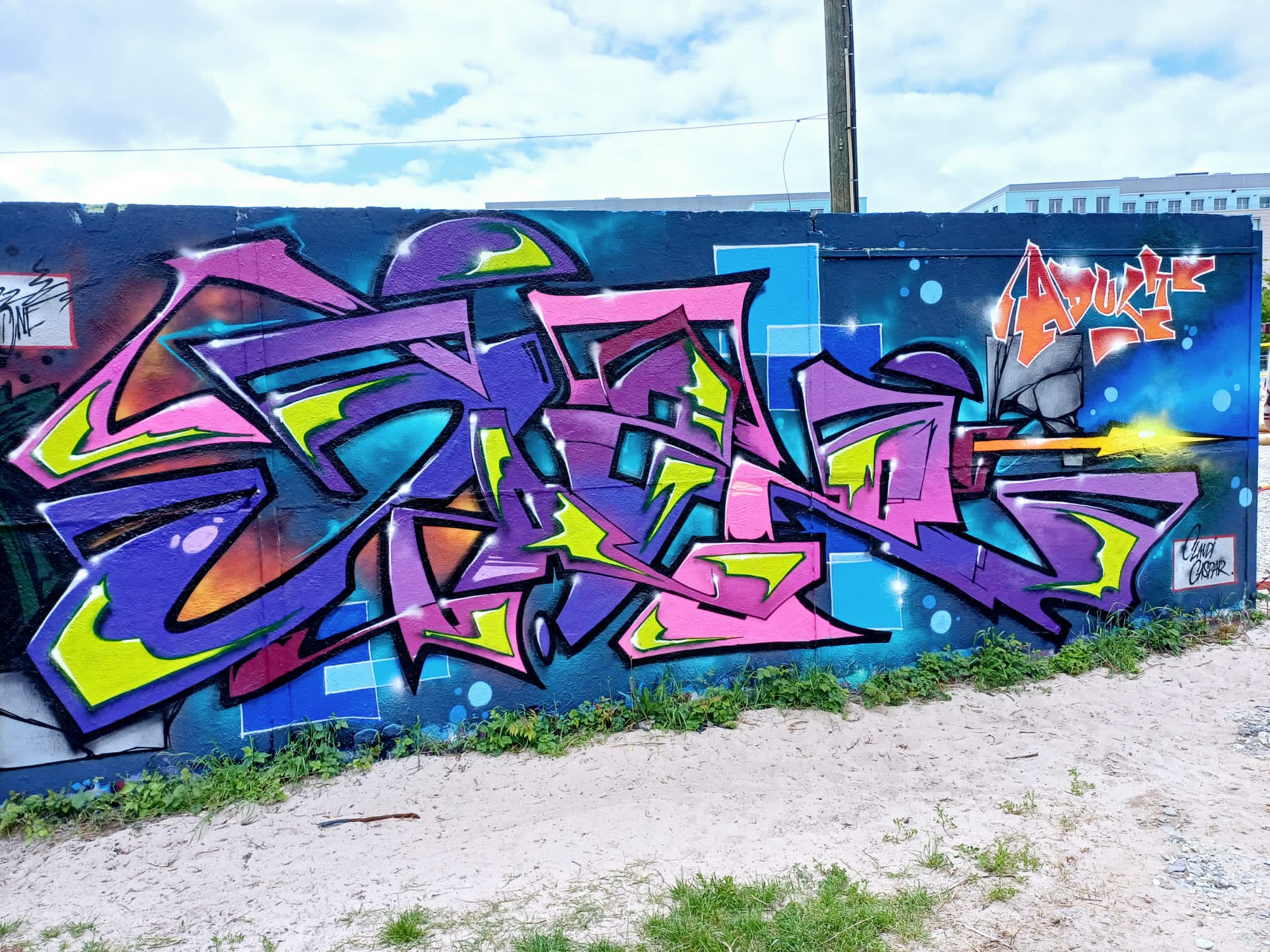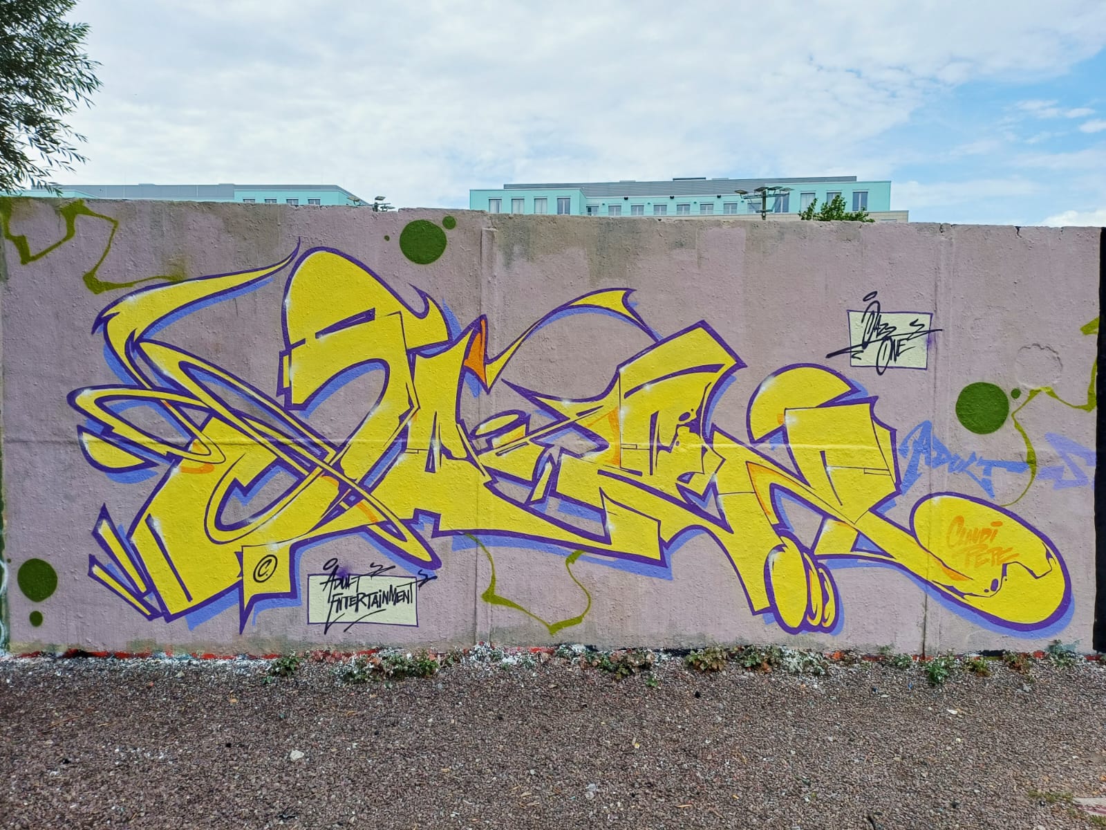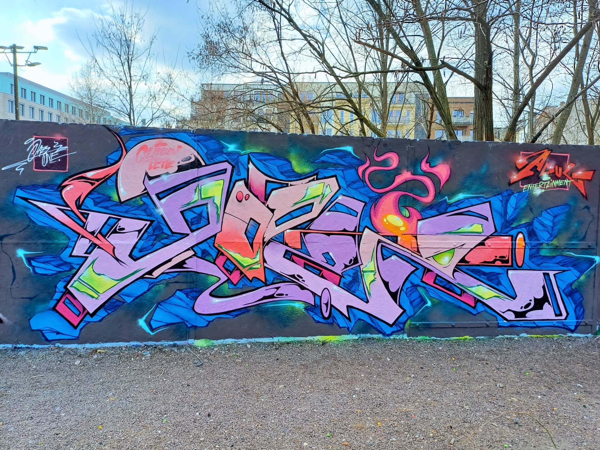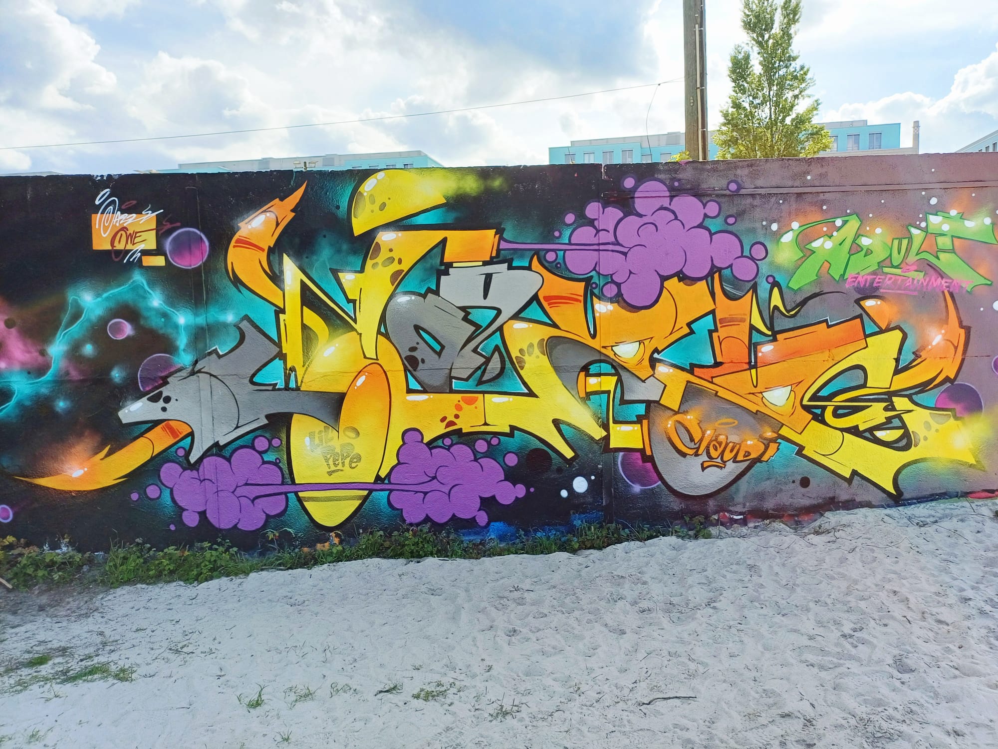 The graffiti on the right is from SHAW, the graffiti on the left was made by WAVE NINE and the flames on the left are from NATRIX