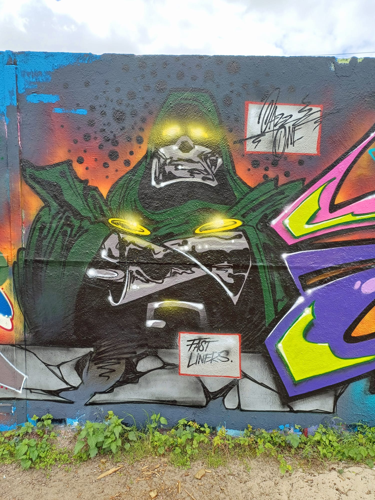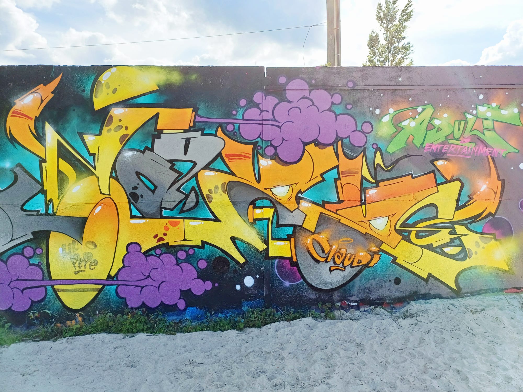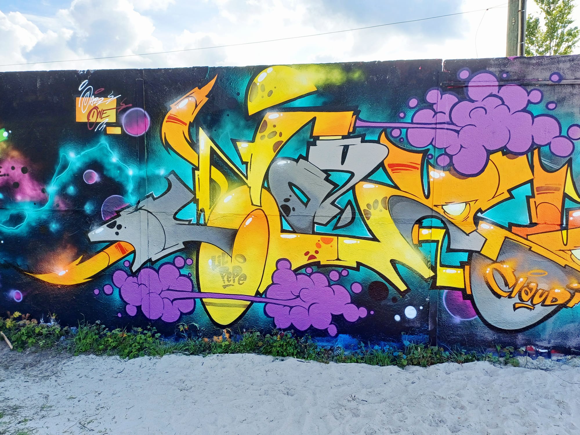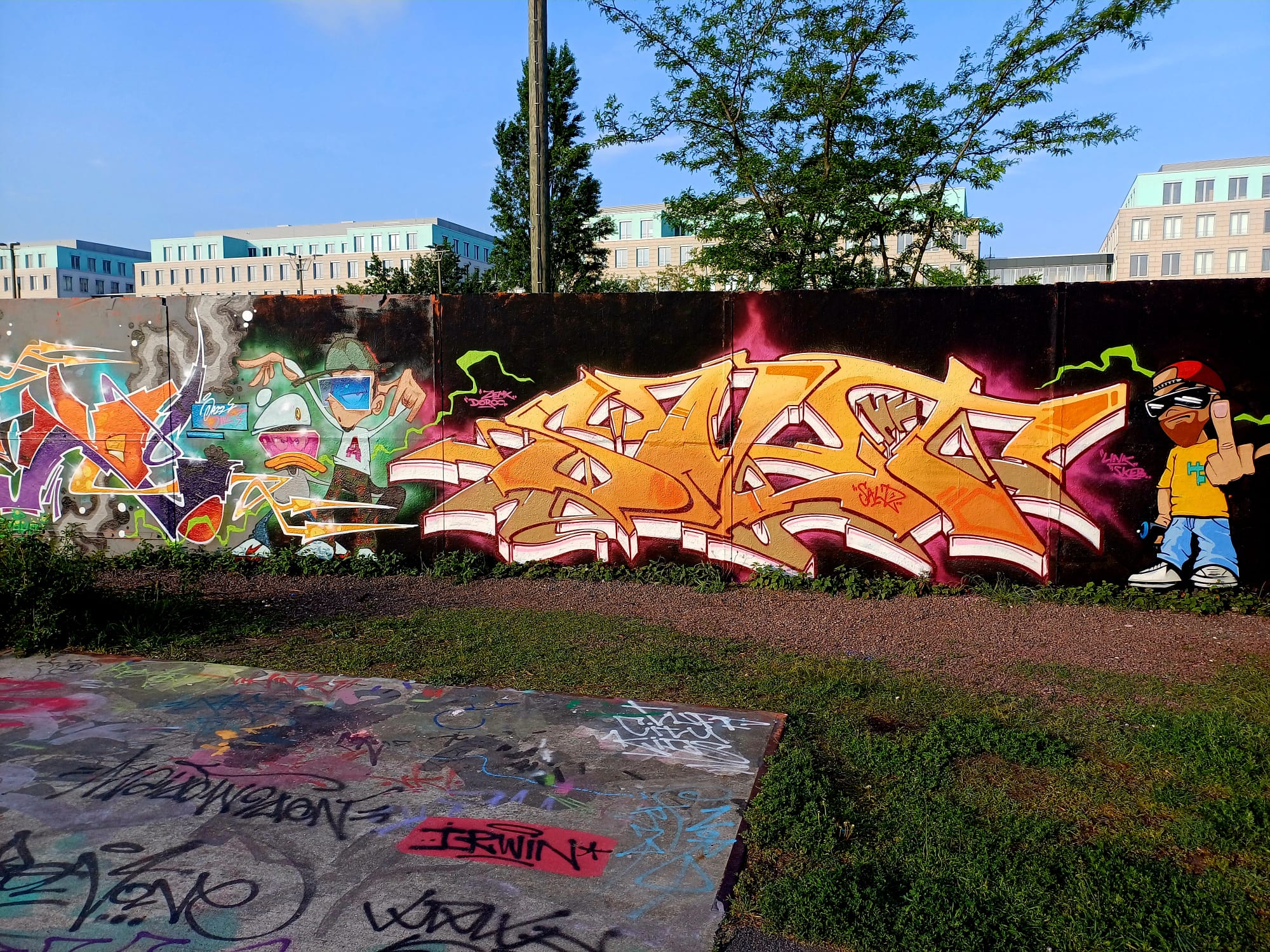 The graffiti on the right is from SHAW, the graffiti on the left was made by WAVE NINE and the flames on the left are from NATRIX