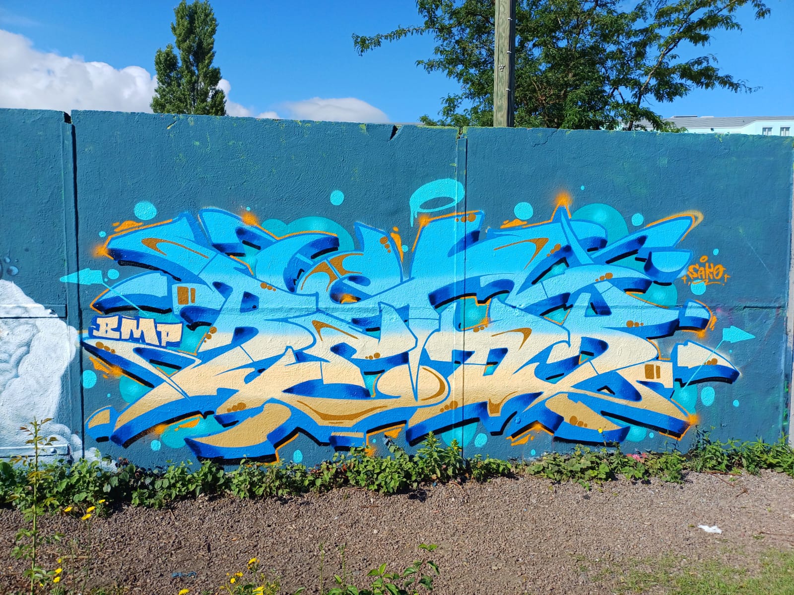 The graffiti on the left are from HOOMS and FEIK, and the character was made by AMPER
