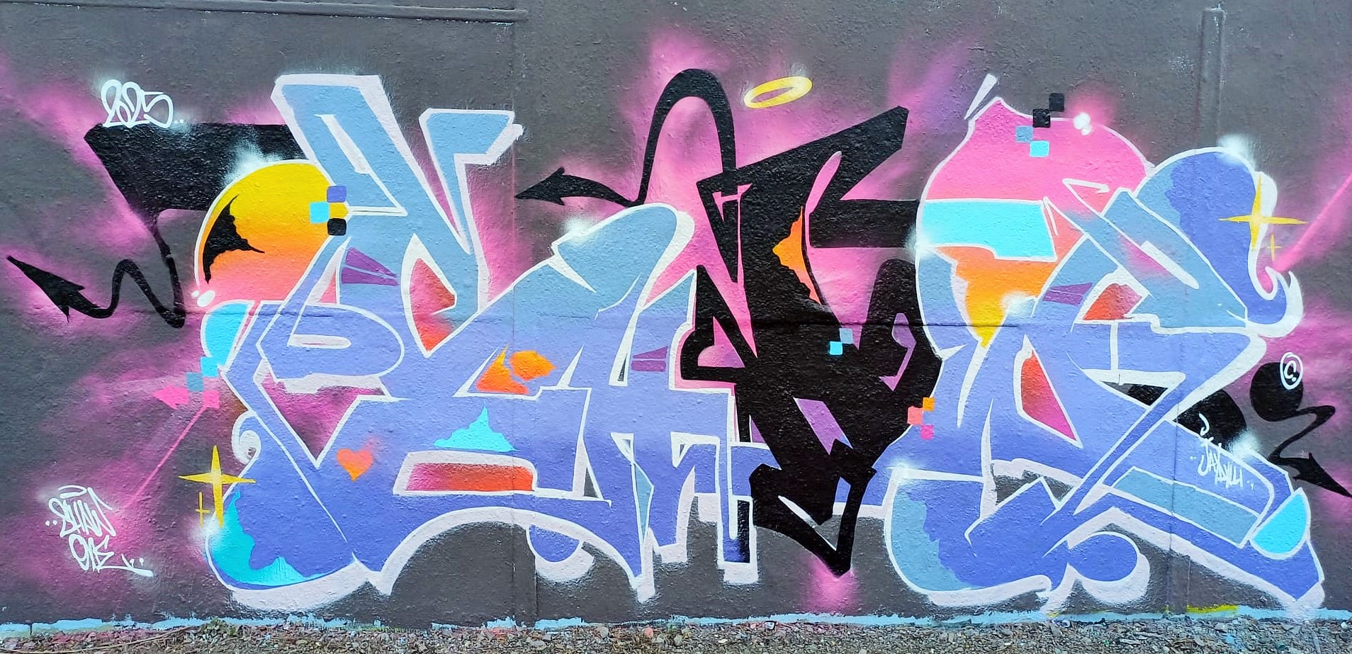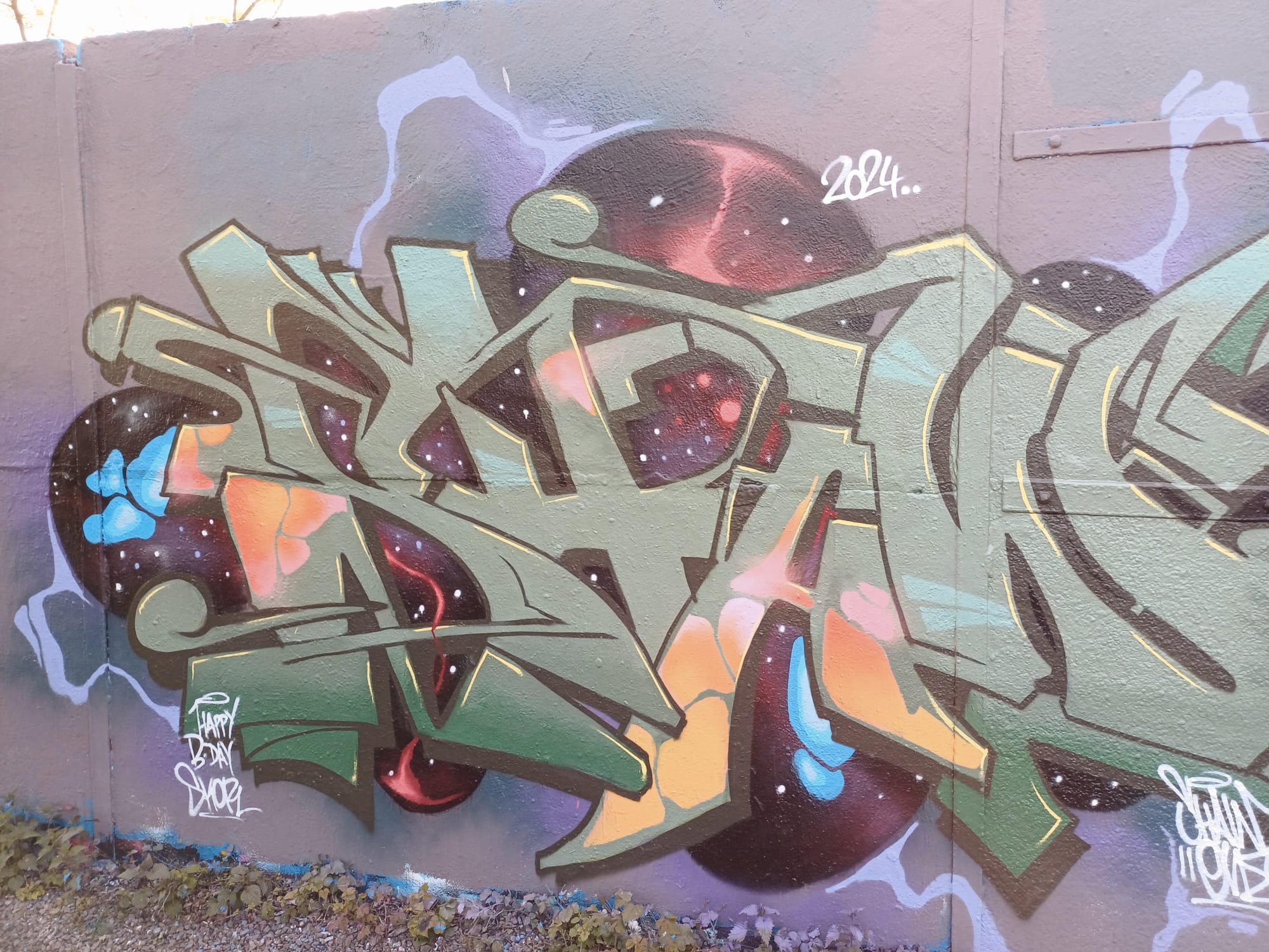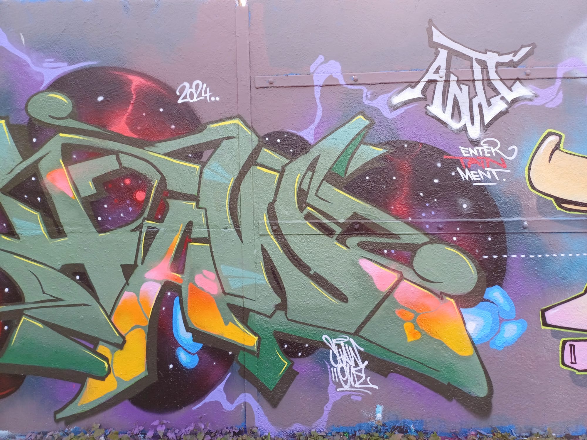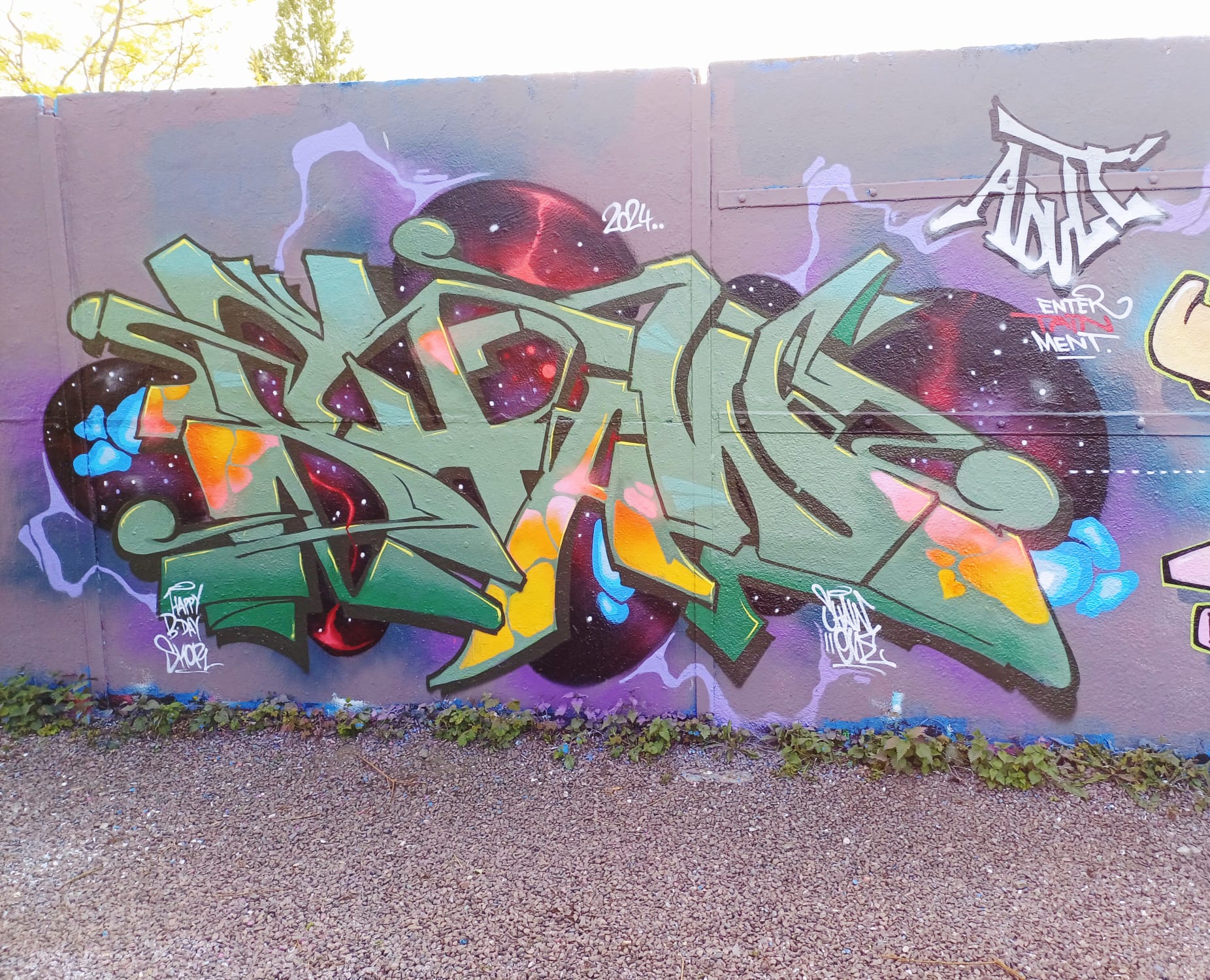 The graffiti on the far left was made by WAVE NINE and the flames are from NATRIX