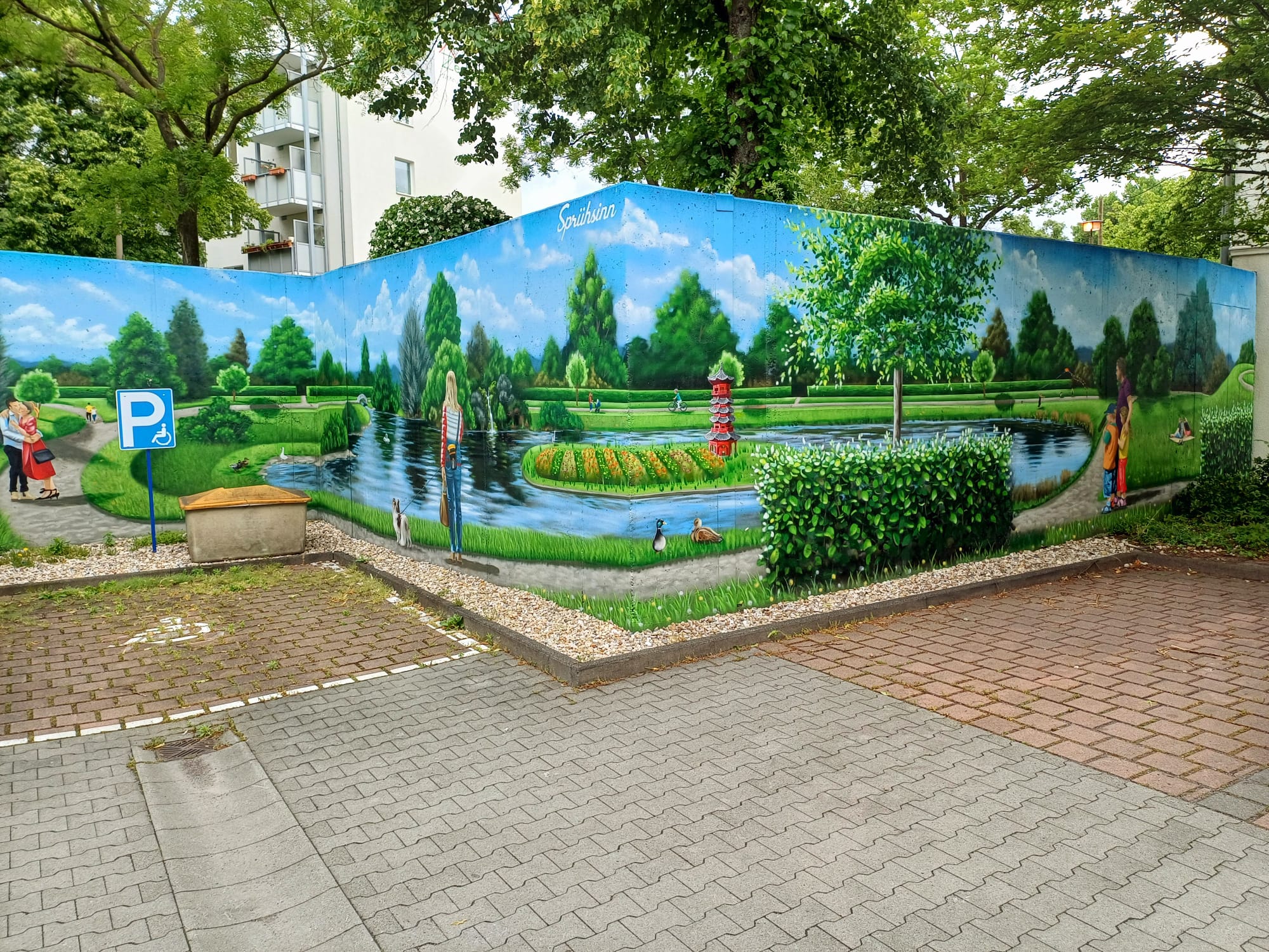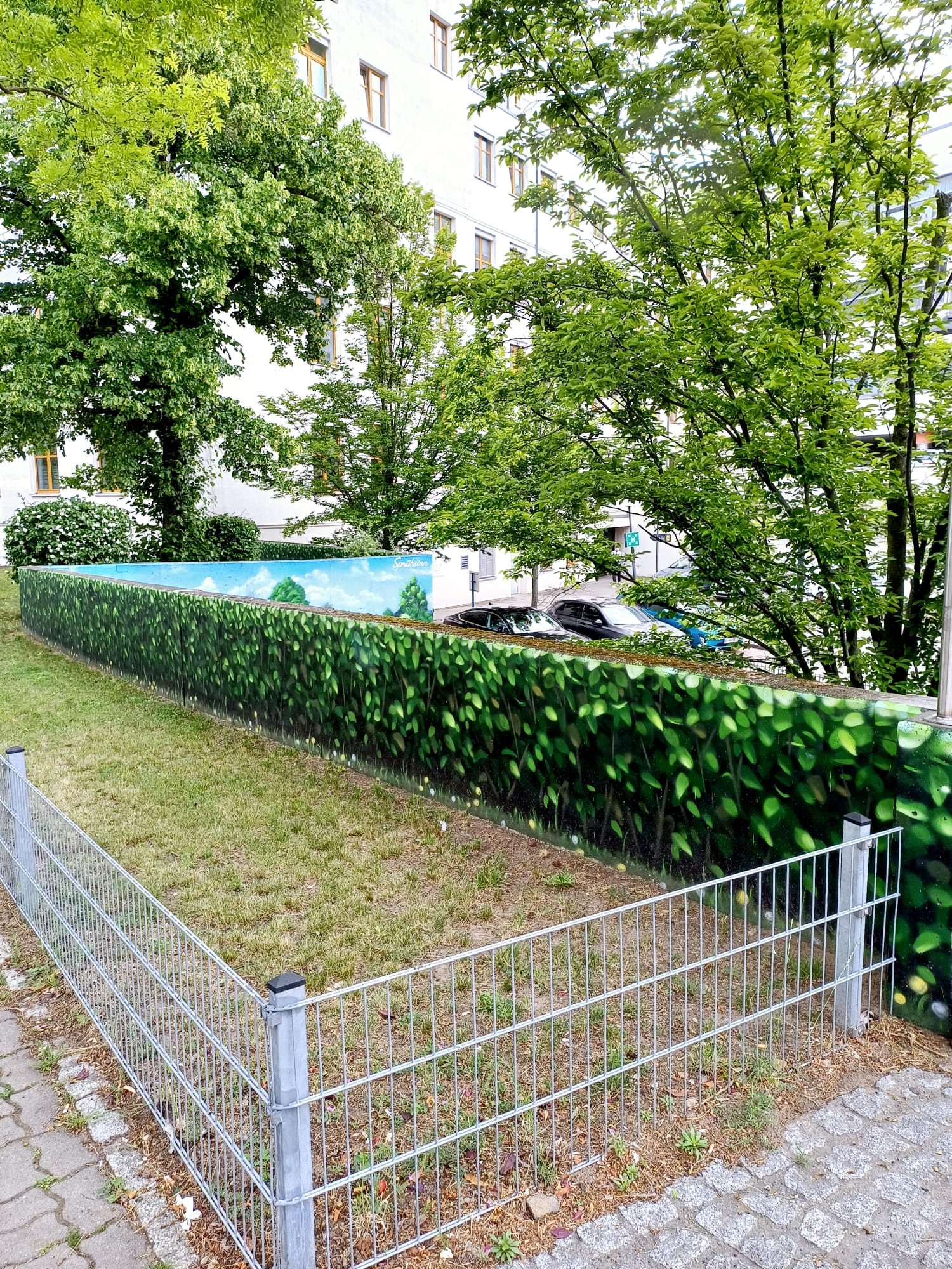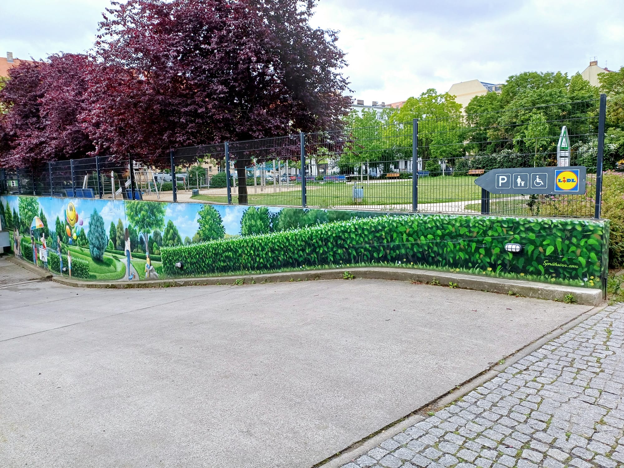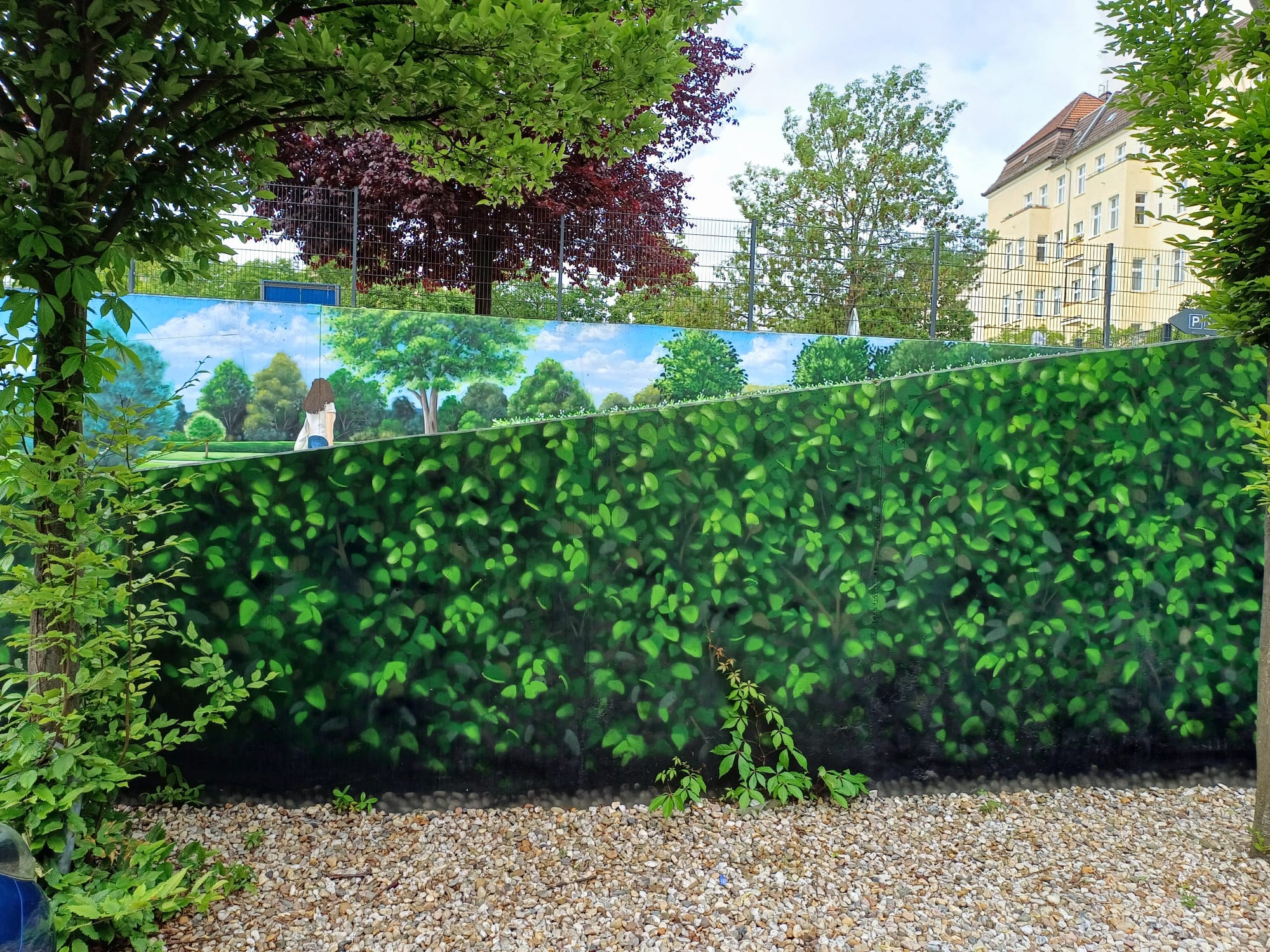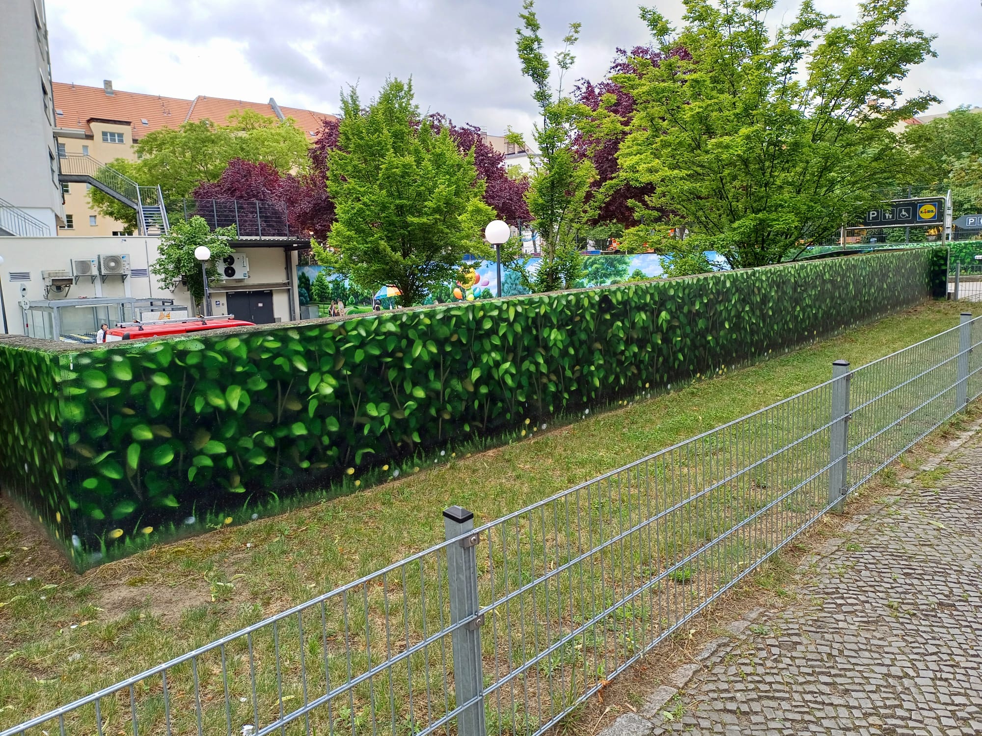 The artist duo BENJAMIN BRAUNE and LINO MEYER, better known for their art agency SPRÜHSINN, have embellished the medical center in Pankow with extensive wall scenarios. The large building, which houses several doctors and surgeries, is located on Lewald Street to the west, Wisbyer Street to the north and Scherenberg Street to the east, with the small Lewaldplatz park to the south. On this page are the artworks around the backyard parking lot at Lewald Street to the west. Also take a look at the great artworks from the east front wall of the building on Scherenberg Street with the ramp to the parking garage level.