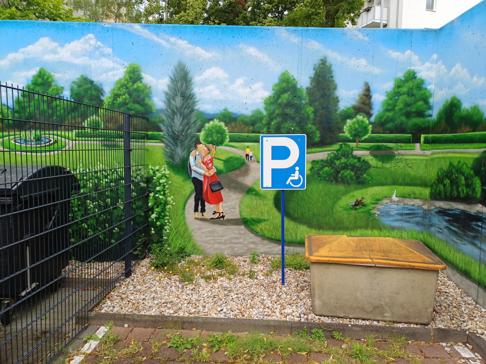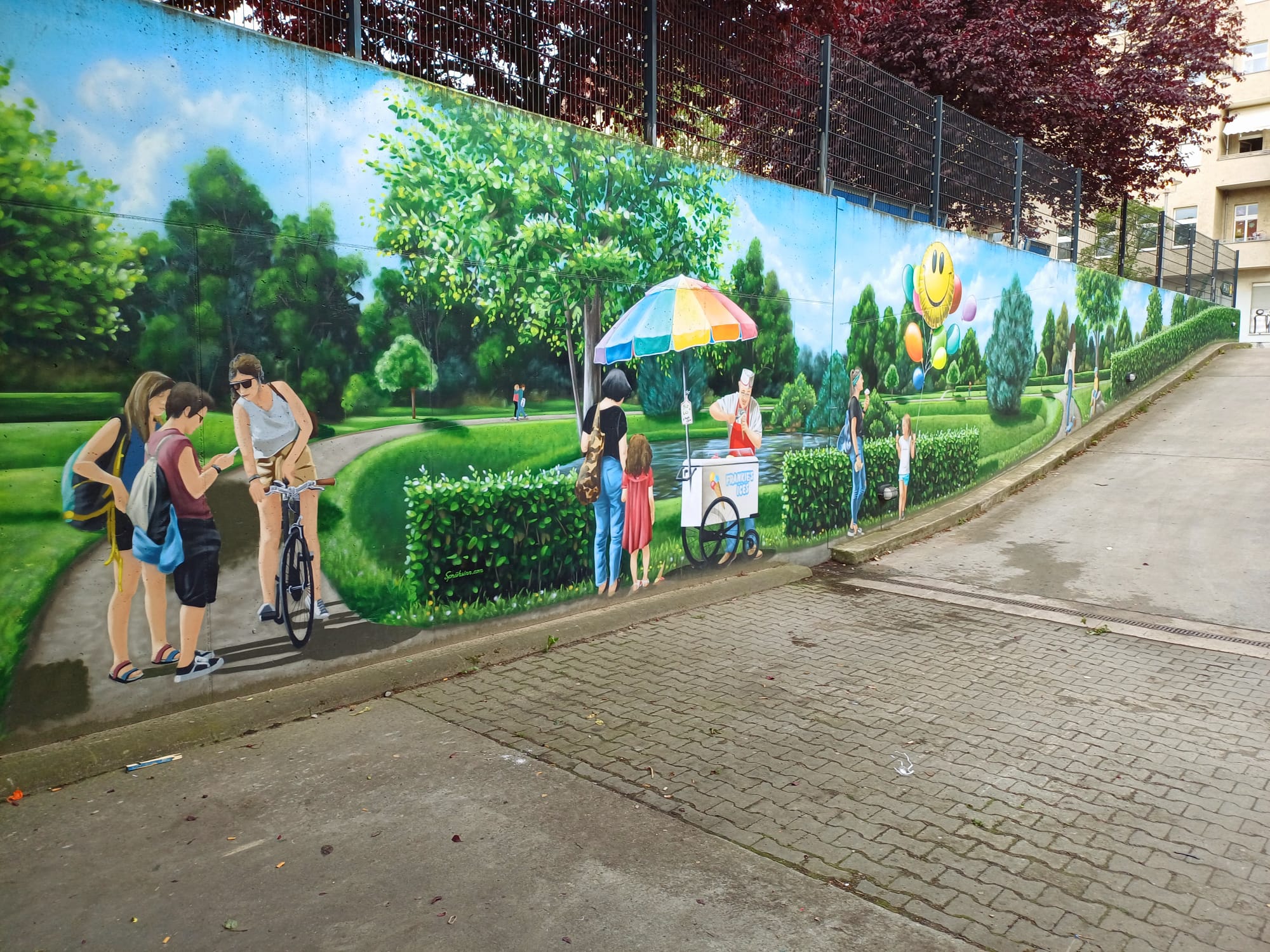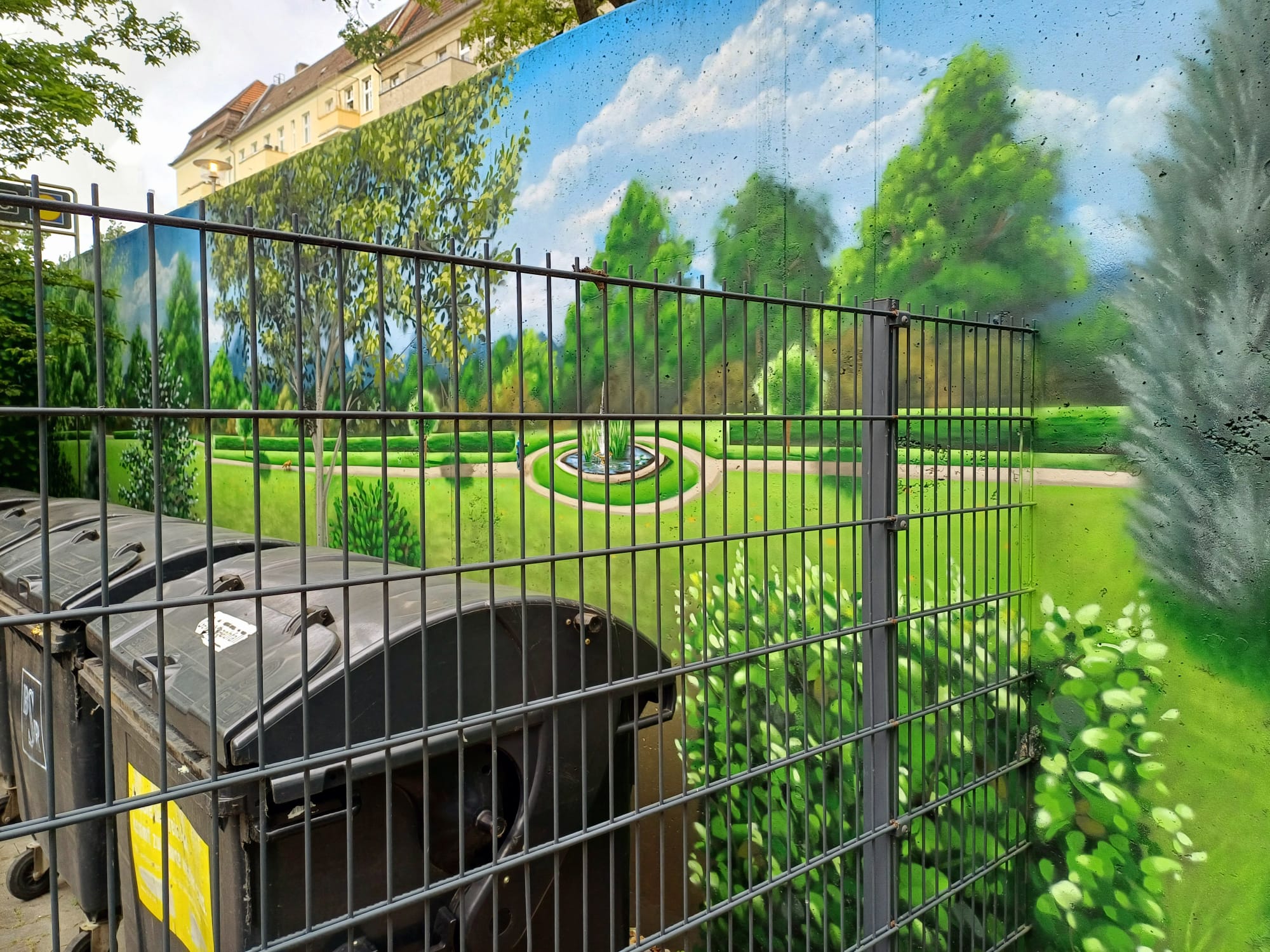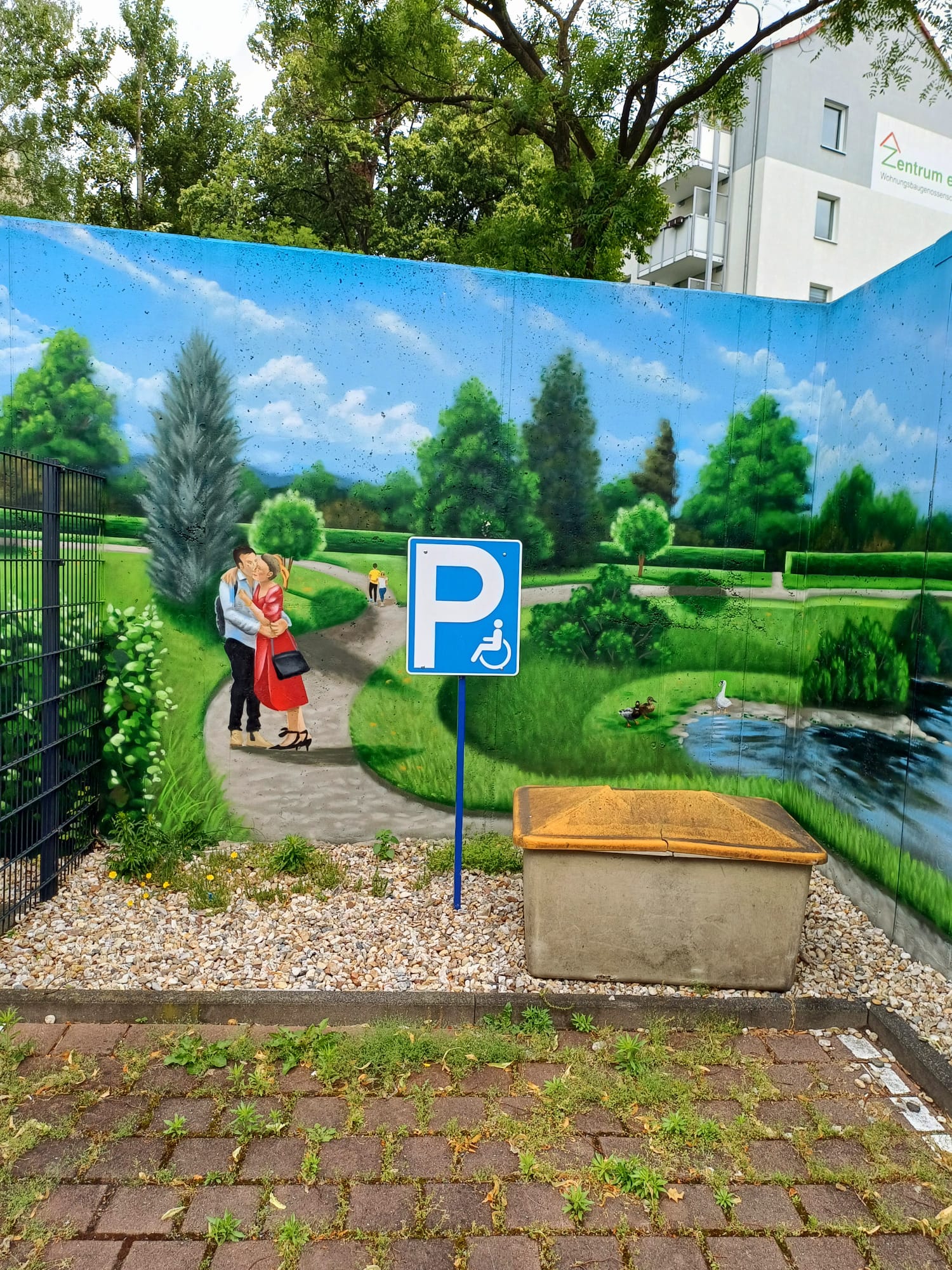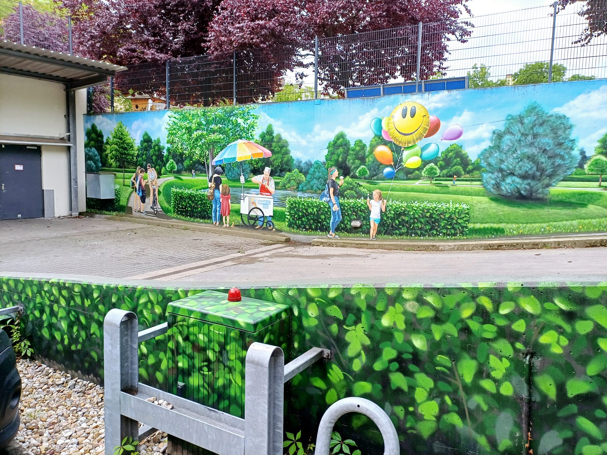 The artist duo BENJAMIN BRAUNE and LINO MEYER, better known for their art agency SPRÜHSINN, have embellished the medical center in Pankow with extensive wall scenarios. The large building, which houses several doctors and surgeries, is located on Lewald Street to the west, Wisbyer Street to the north and Scherenberg Street to the east, with the small Lewaldplatz park to the south. On this page are the artworks around the backyard parking lot at Lewald Street to the west. Also take a look at the great artworks from the east front wall of the building on Scherenberg Street with the ramp to the parking garage level.
