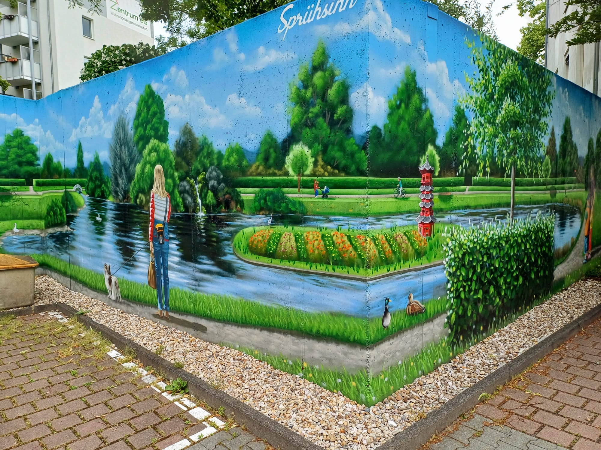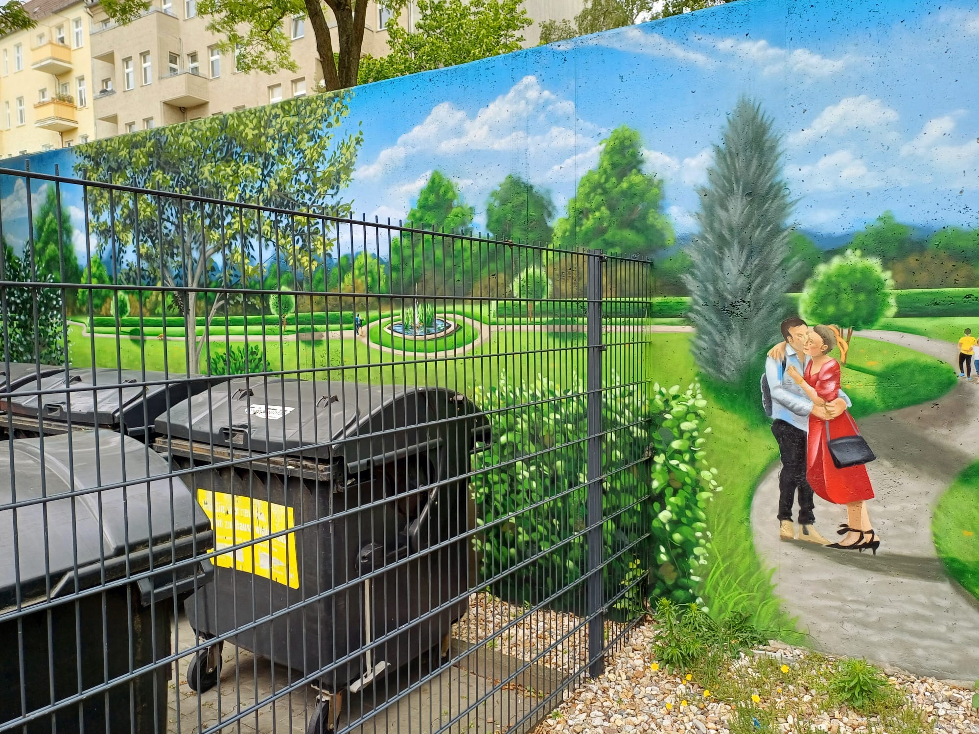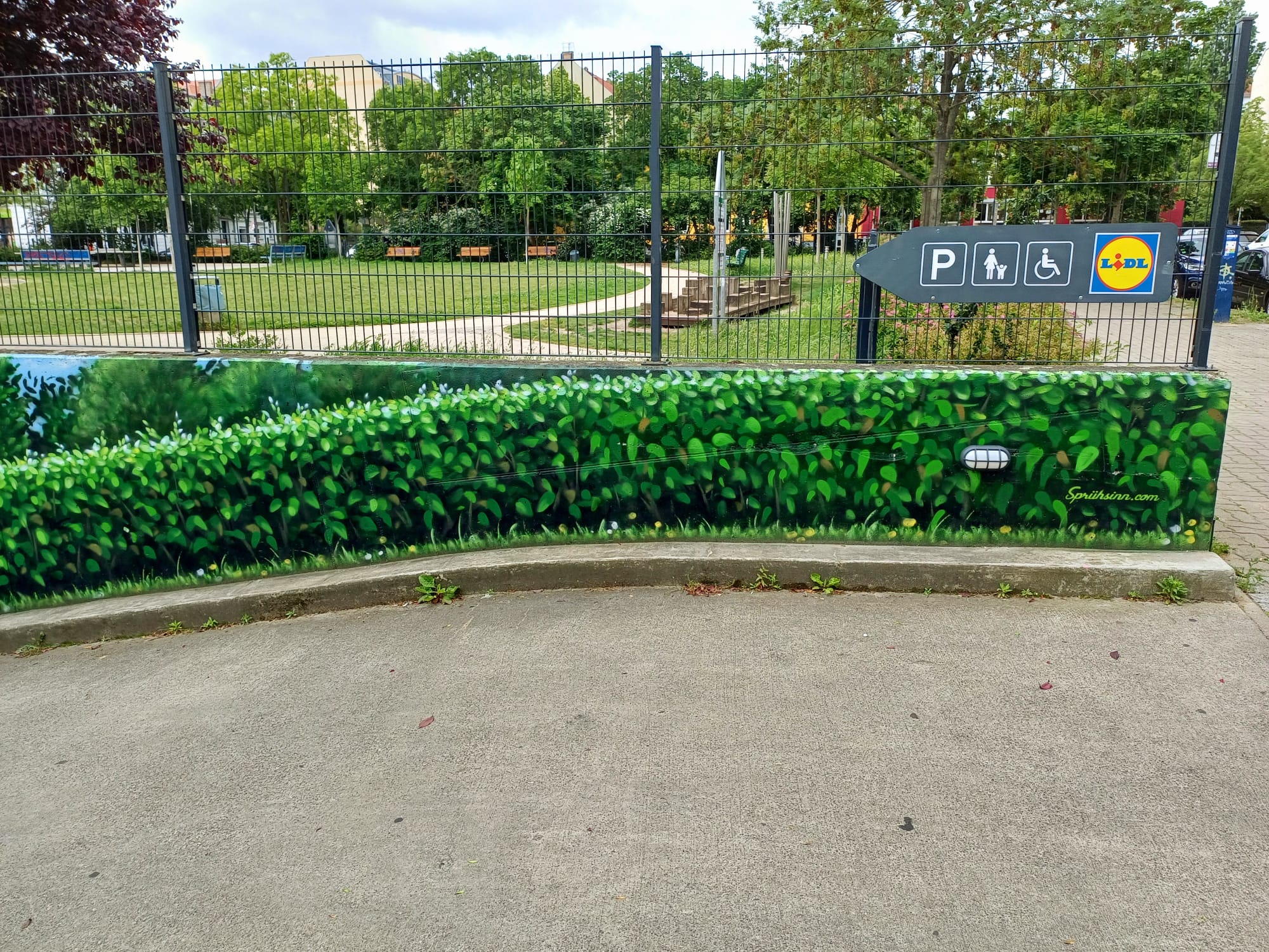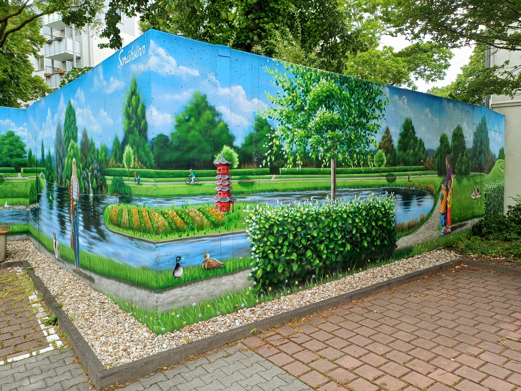 The artist duo BENJAMIN BRAUNE and LINO MEYER, better known for their art agency SPRÜHSINN, have embellished the medical center in Pankow with extensive wall scenarios. The large building, which houses several doctors and surgeries, is located on Lewald Street to the west, Wisbyer Street to the north and Scherenberg Street to the east, with the small Lewaldplatz park to the south. On this page are the artworks around the backyard parking lot at Lewald Street to the west. Also take a look at the great artworks from the east front wall of the building on Scherenberg Street with the ramp to the parking garage level.