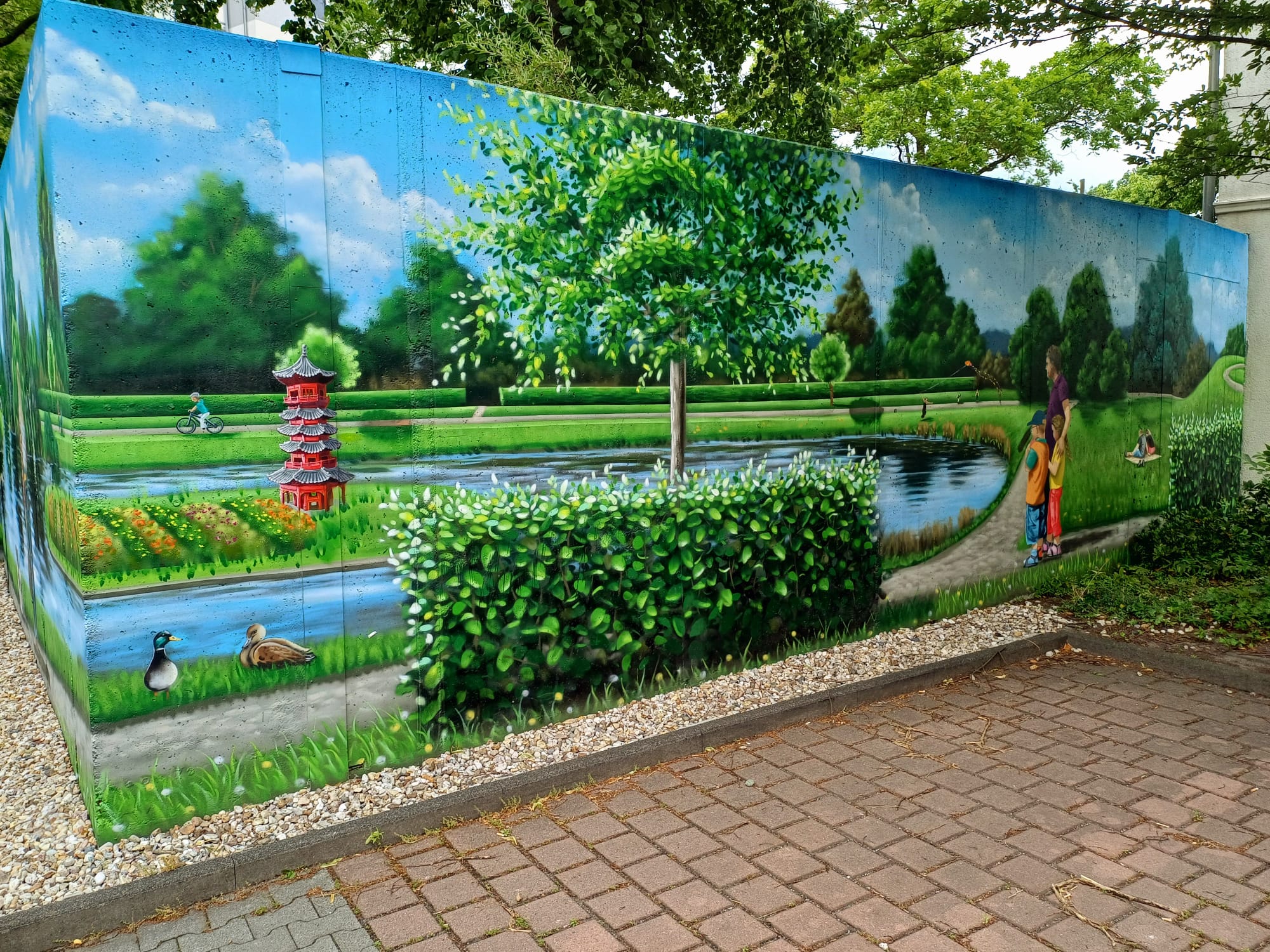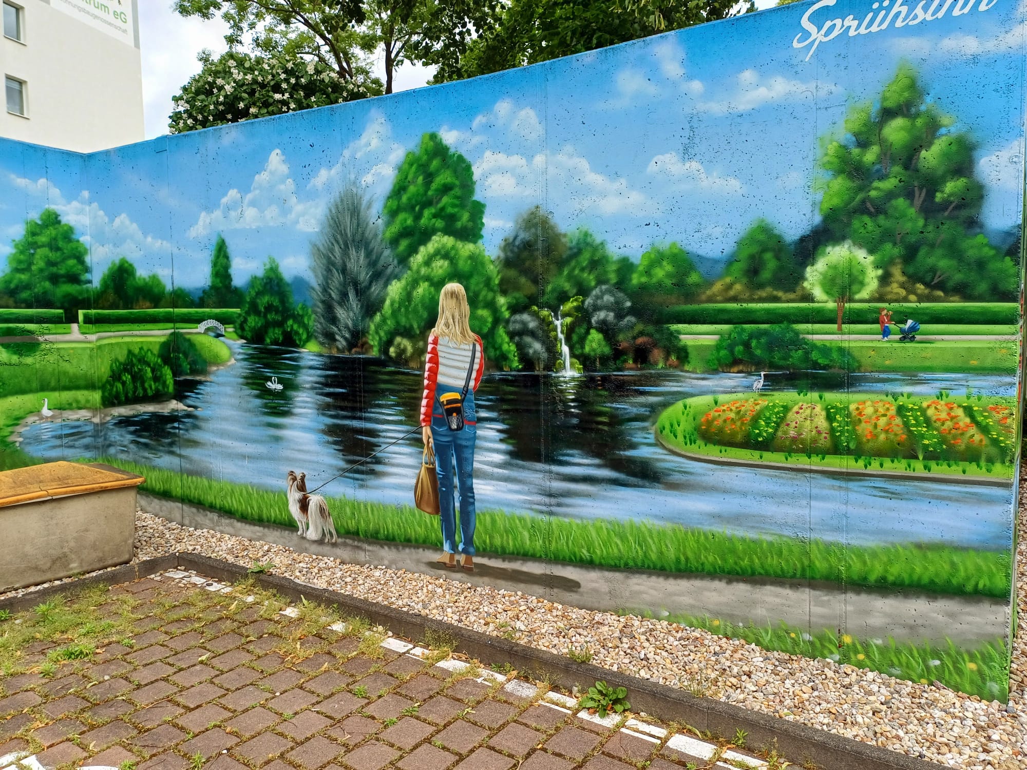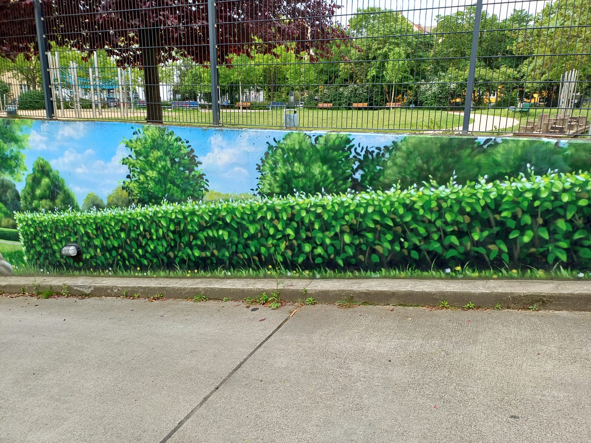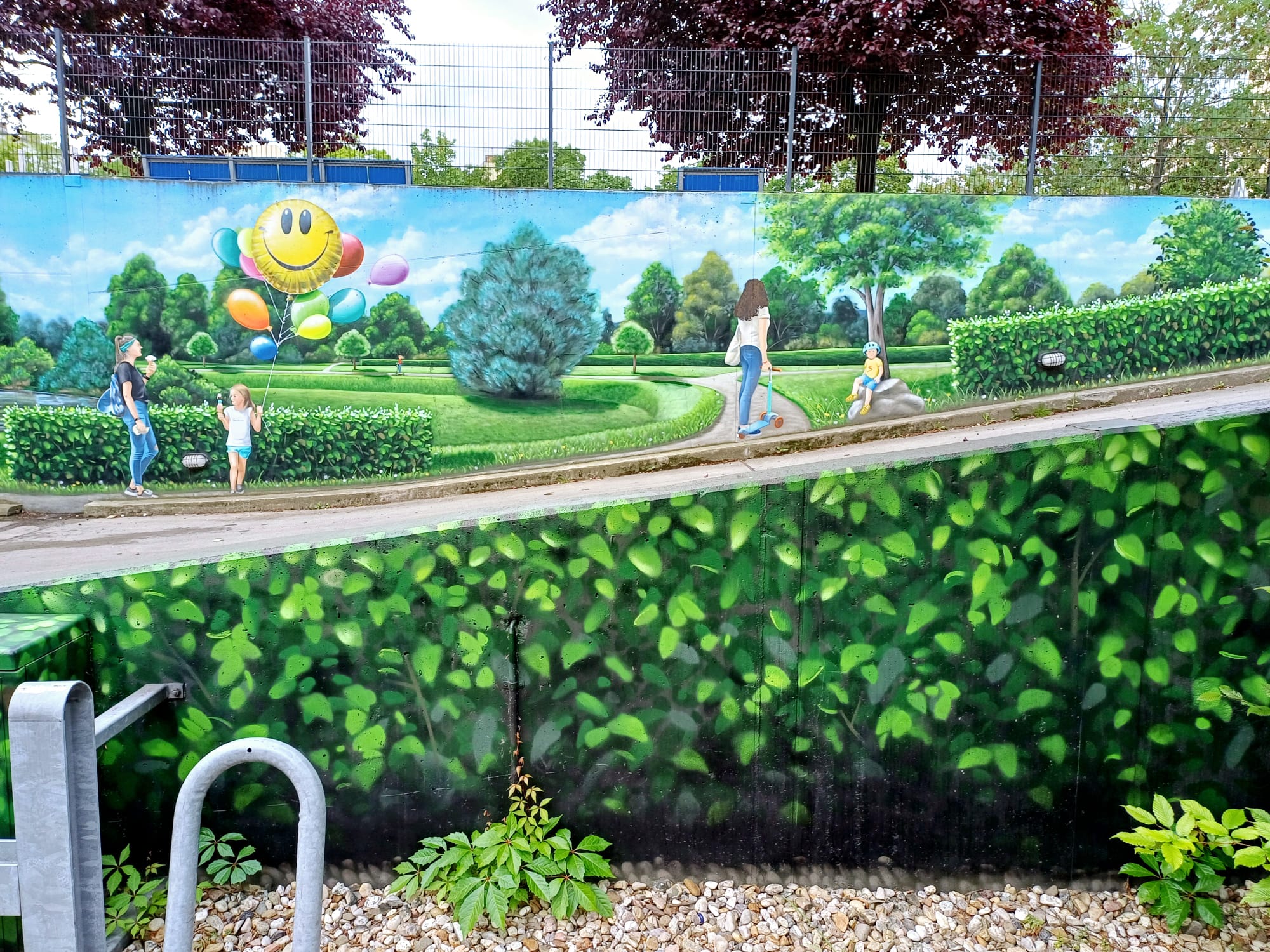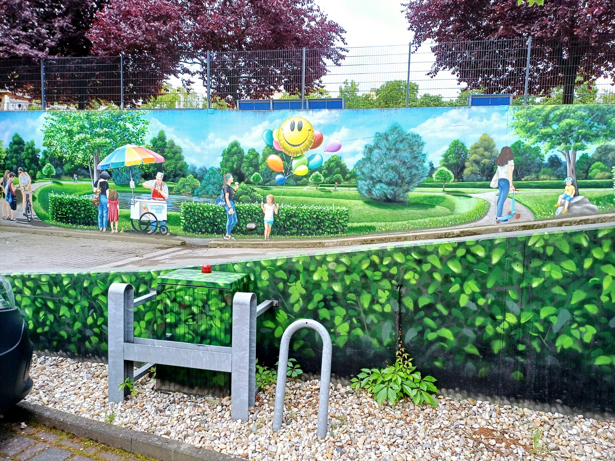 The artist duo BENJAMIN BRAUNE and LINO MEYER, better known for their art agency SPRÜHSINN, have embellished the medical center in Pankow with extensive wall scenarios. The large building, which houses several doctors and surgeries, is located on Lewald Street to the west, Wisbyer Street to the north and Scherenberg Street to the east, with the small Lewaldplatz park to the south. On this page are the artworks around the backyard parking lot at Lewald Street to the west. Also take a look at the great artworks from the east front wall of the building on Scherenberg Street with the ramp to the parking garage level.