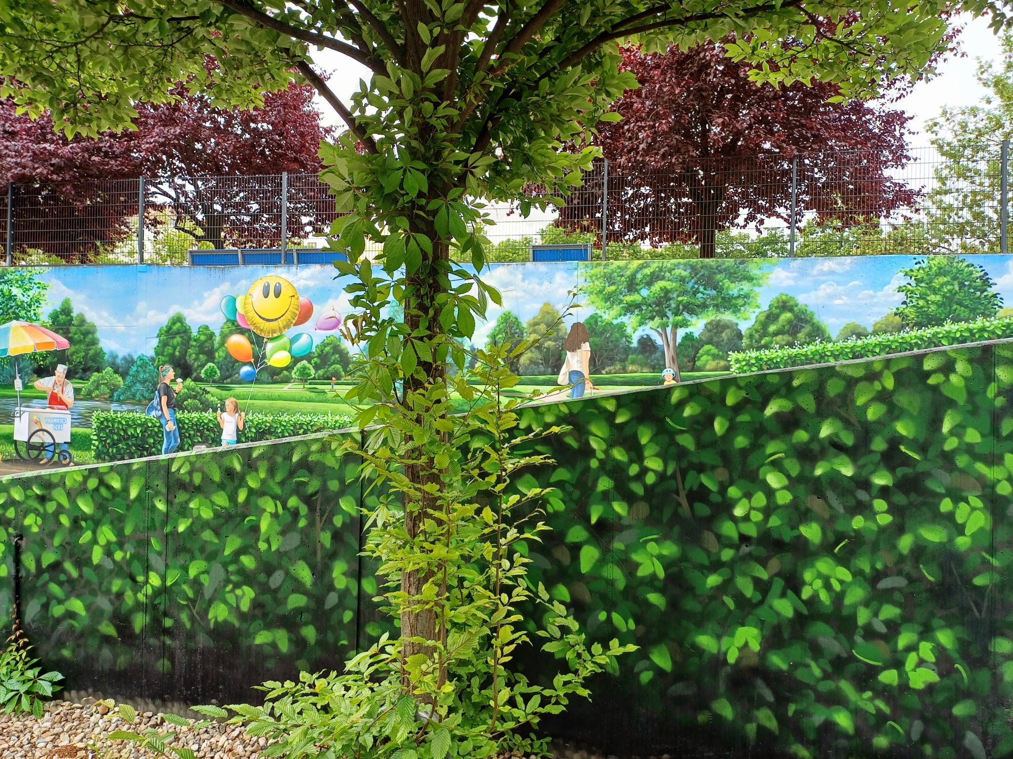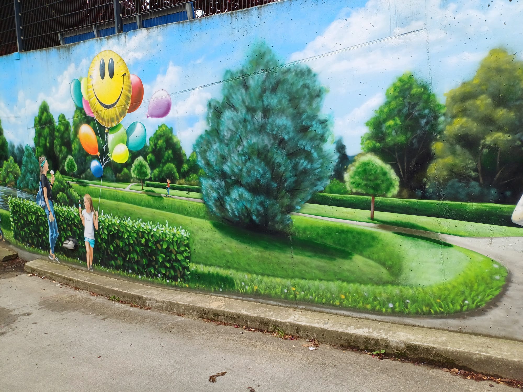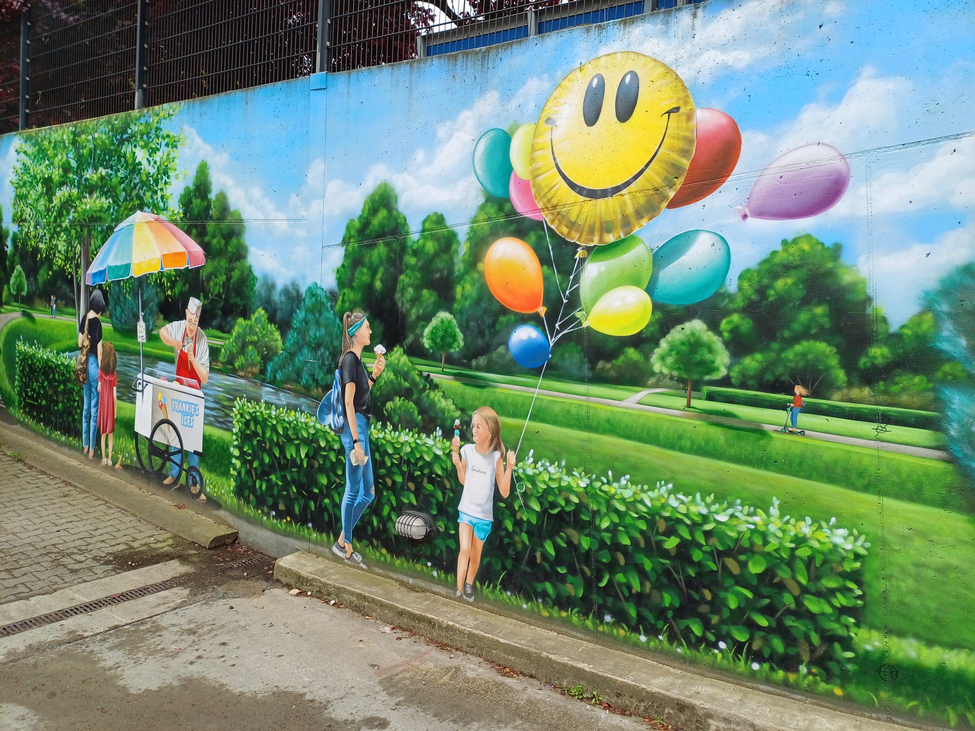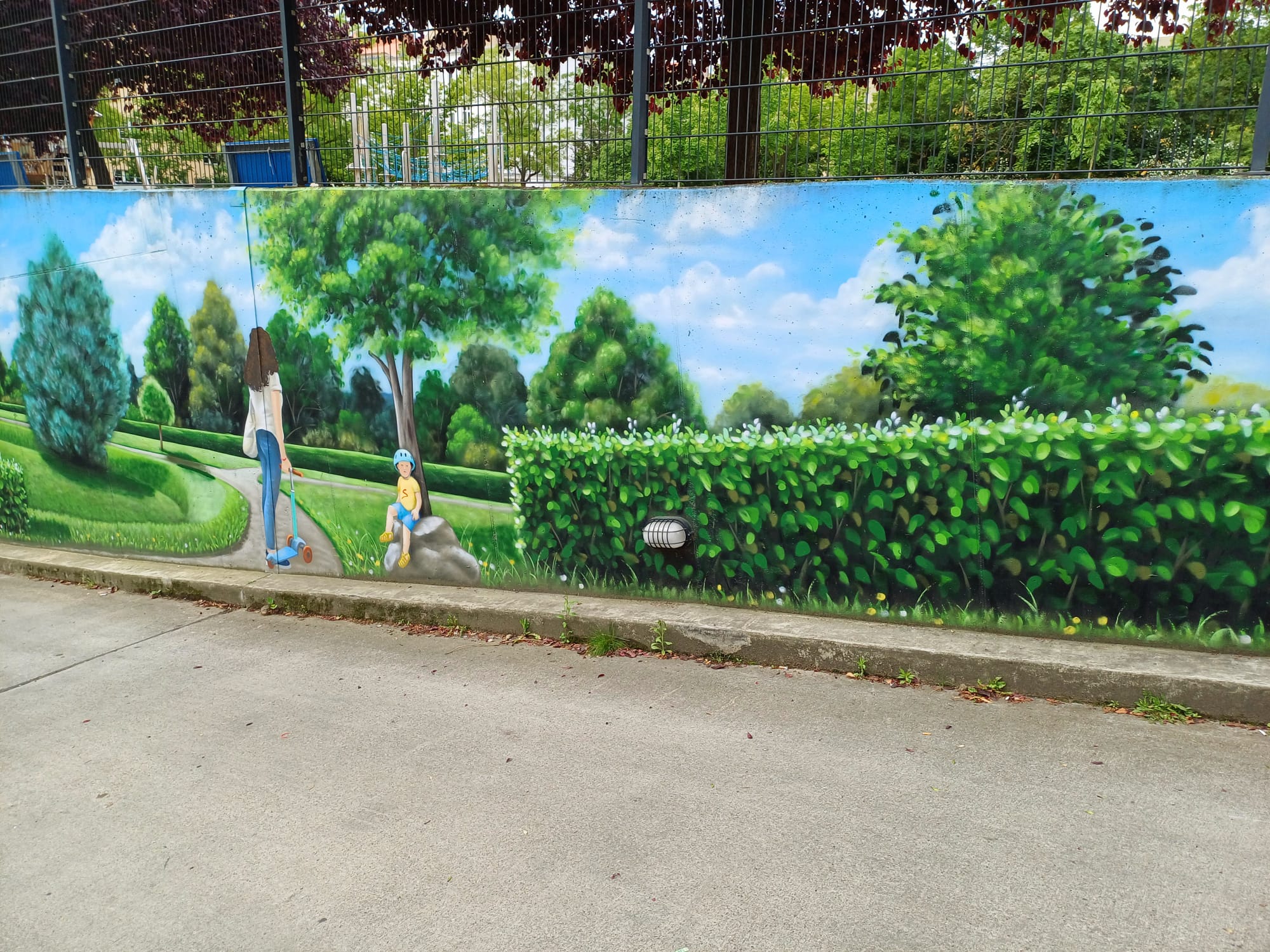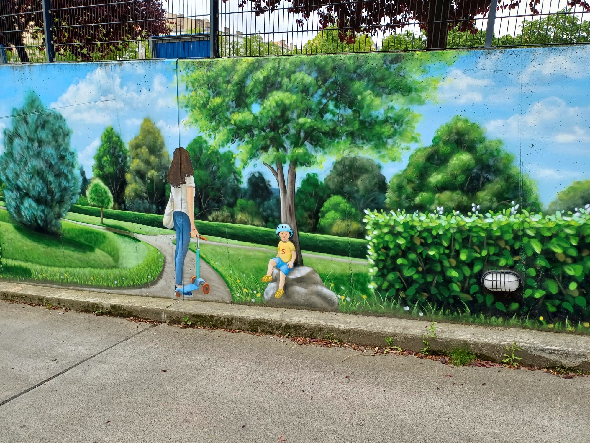 The artist duo BENJAMIN BRAUNE and LINO MEYER, better known for their art agency SPRÜHSINN, have embellished the medical center in Pankow with extensive wall scenarios. The large building, which houses several doctors and surgeries, is located on Lewald Street to the west, Wisbyer Street to the north and Scherenberg Street to the east, with the small Lewaldplatz park to the south. On this page are the artworks around the backyard parking lot at Lewald Street to the west. Also take a look at the great artworks from the east front wall of the building on Scherenberg Street with the ramp to the parking garage level.