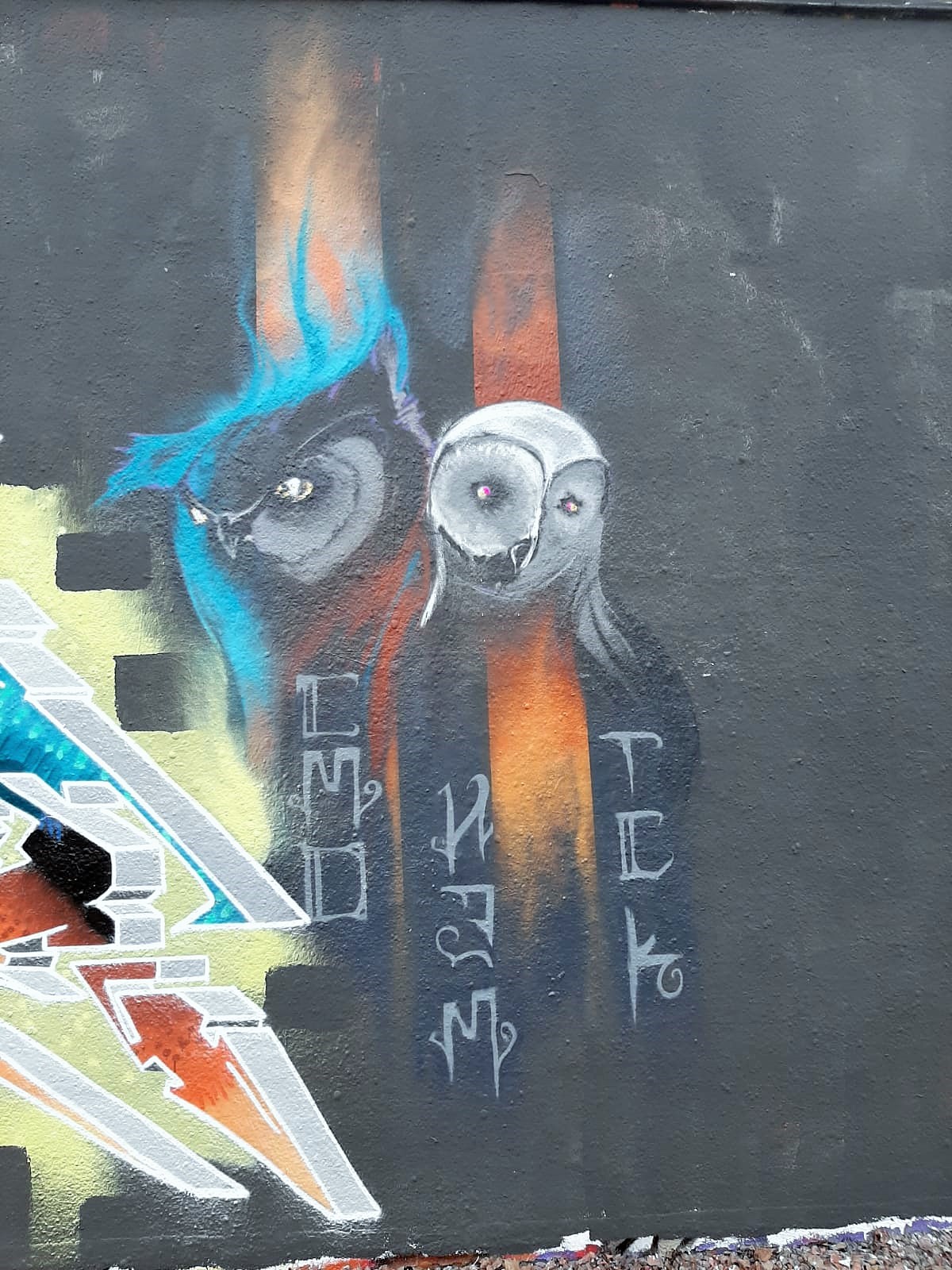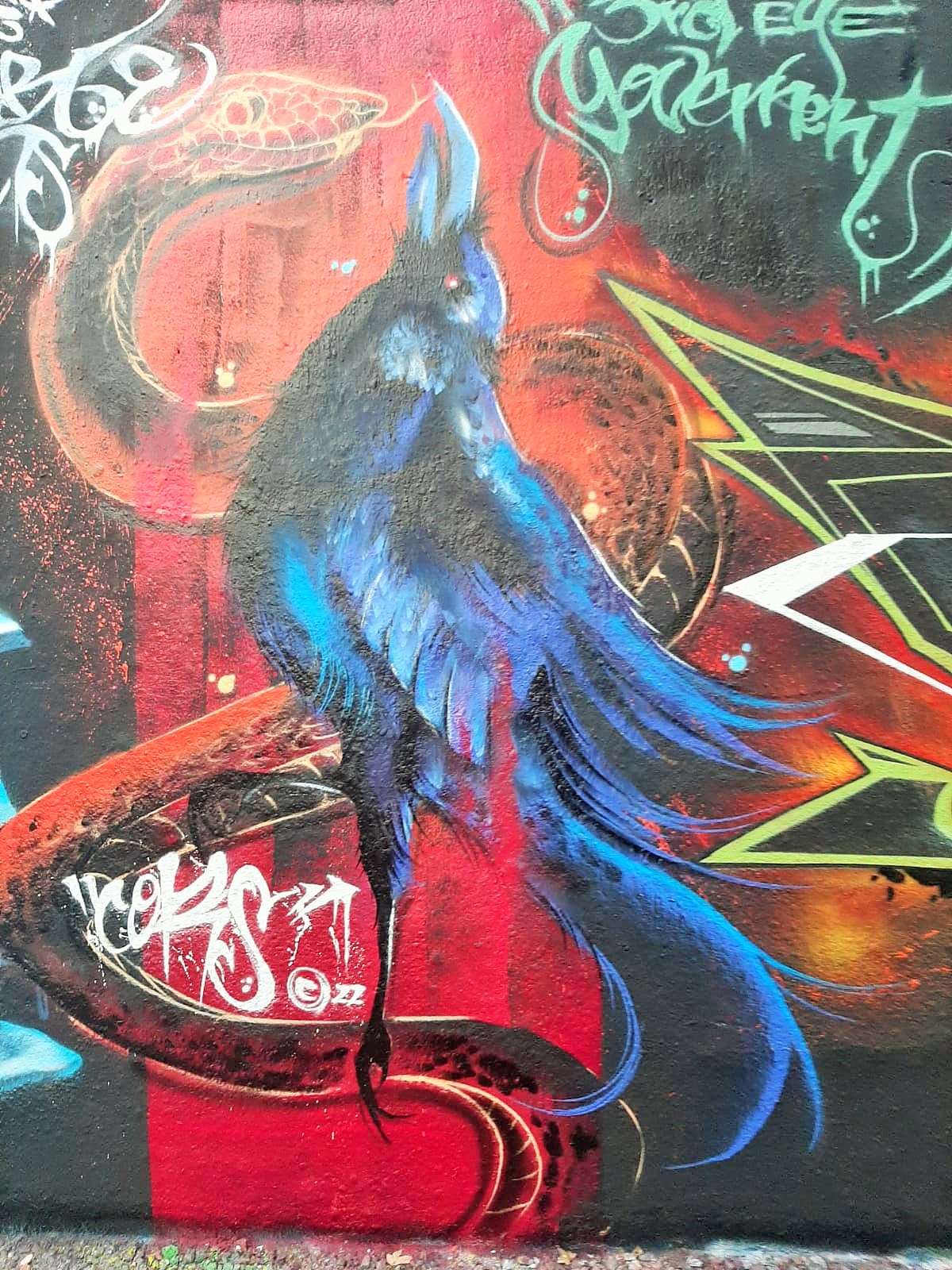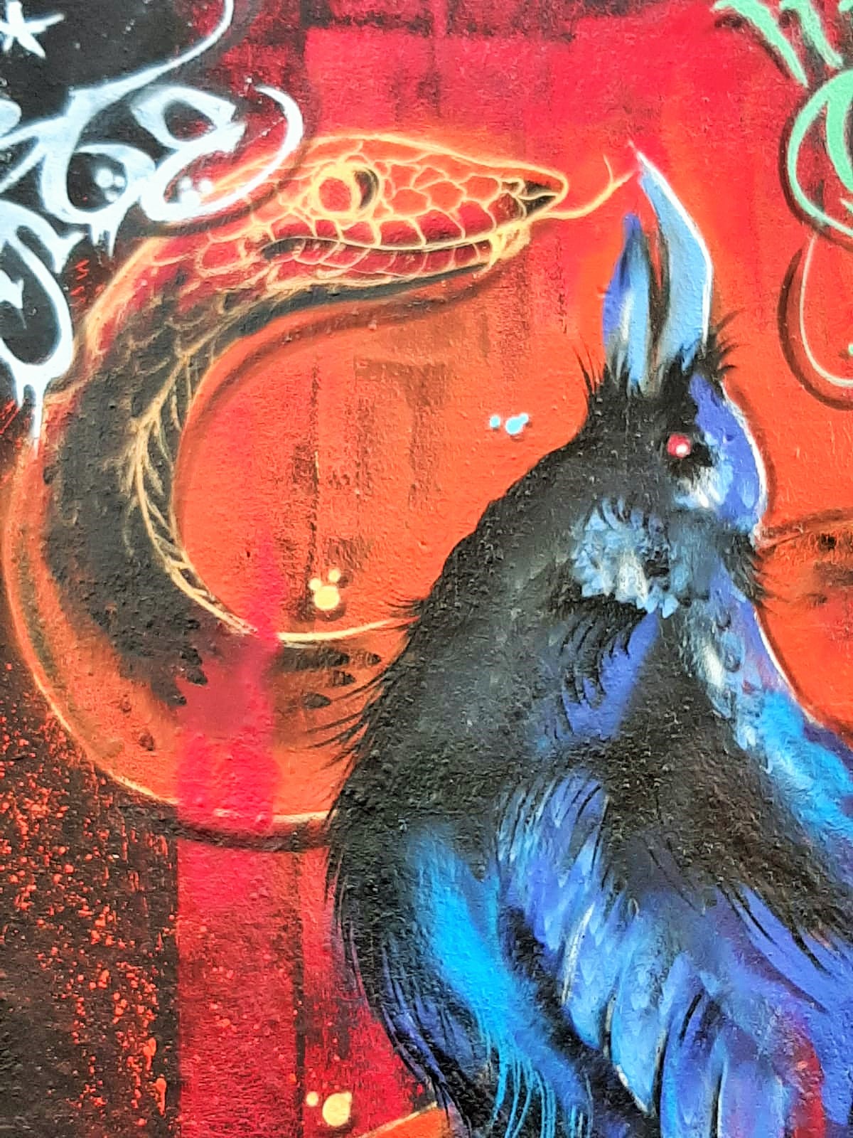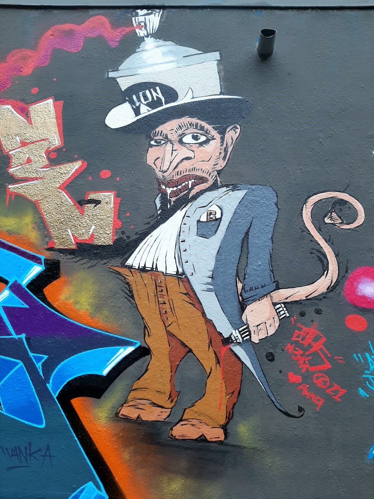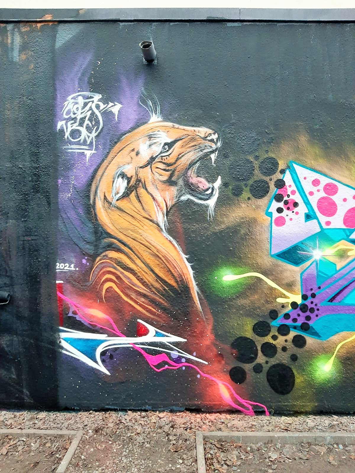 The tiger on the left was made by CORS ONE, the graffiti is from TRON 26 and the green bird character above was made by SAF.X. The graffiti to the right is from KAME and the rabbit character again from SAF.X.