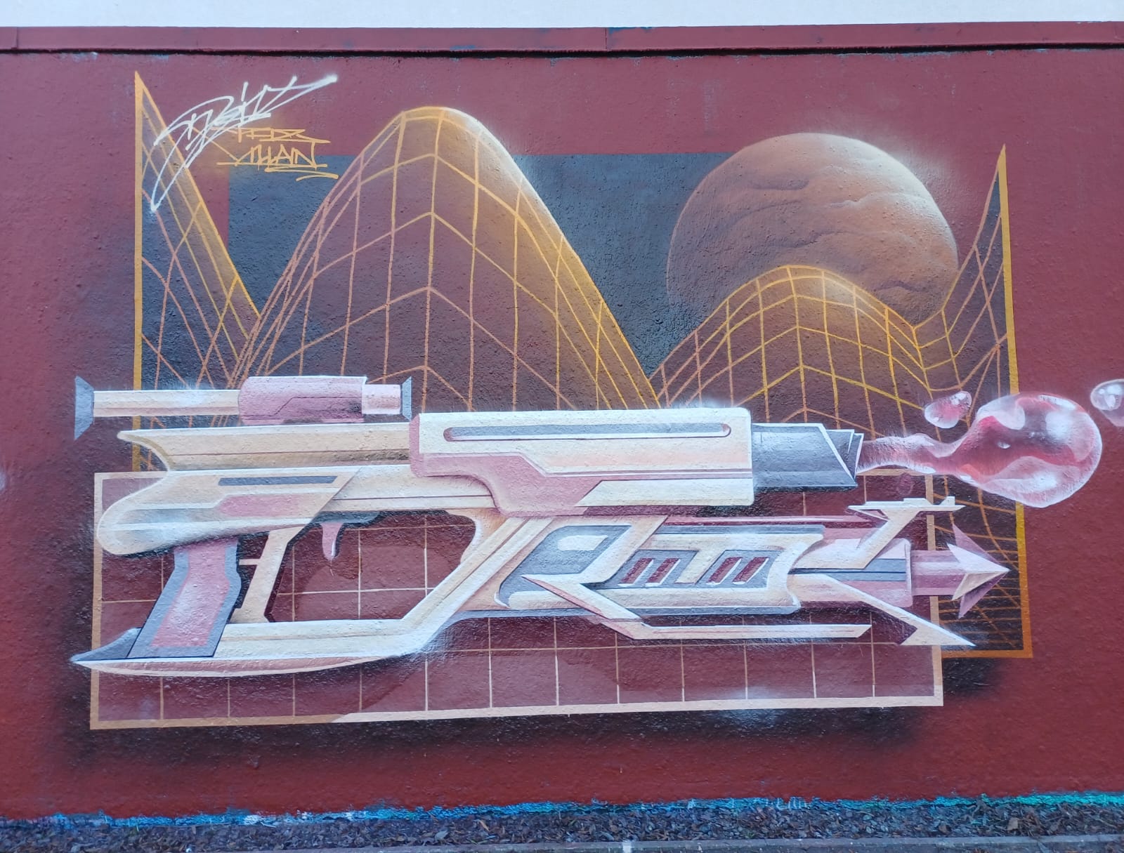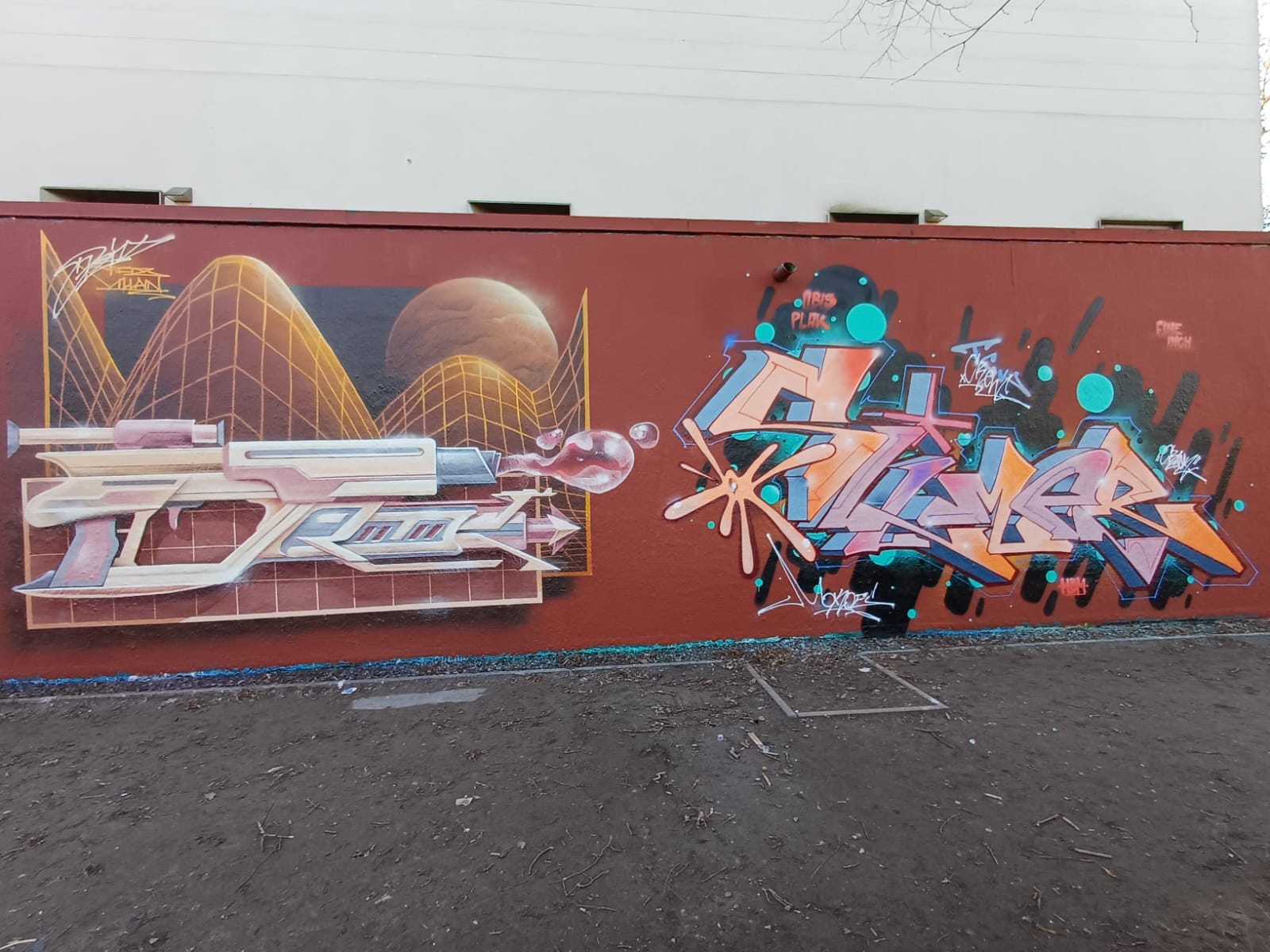 The graffiti on the far left is from INKA ONE and the artwork on the far right was made by ONUR