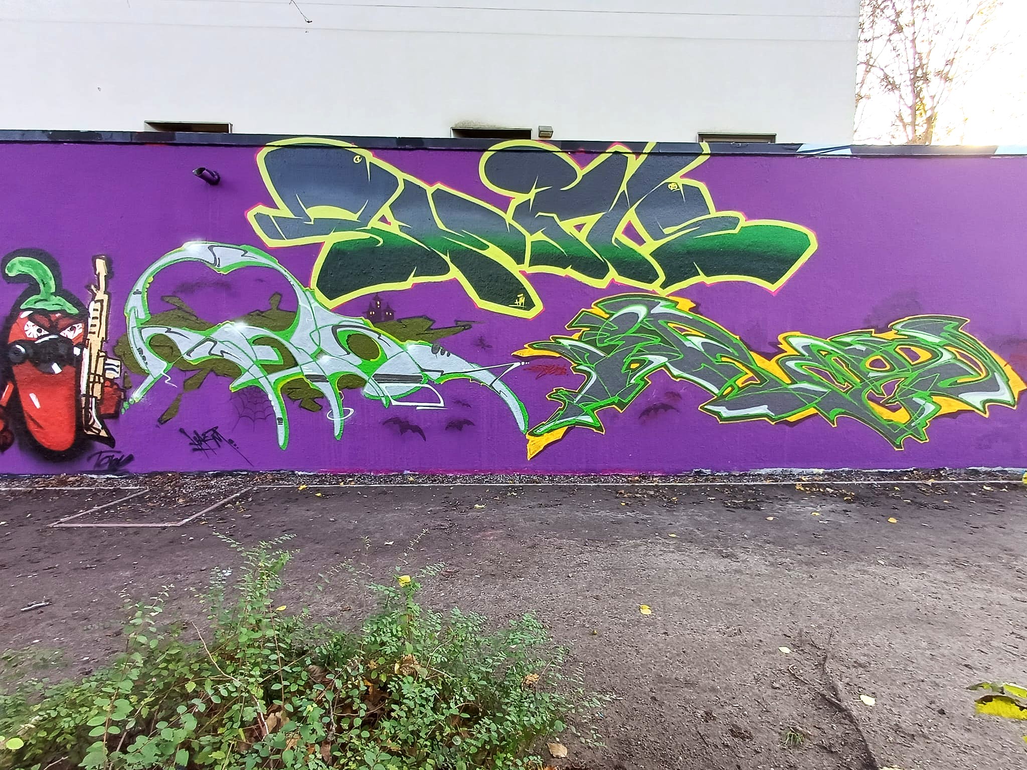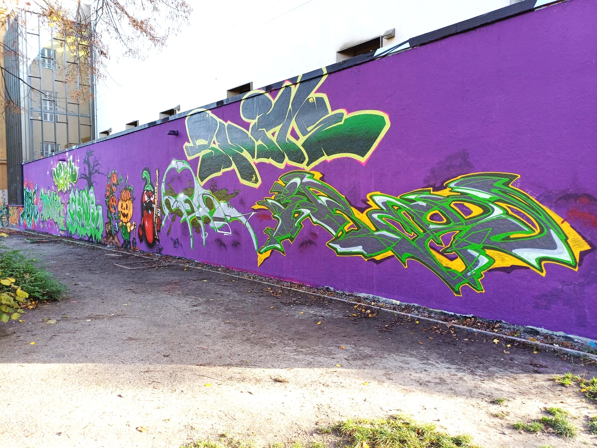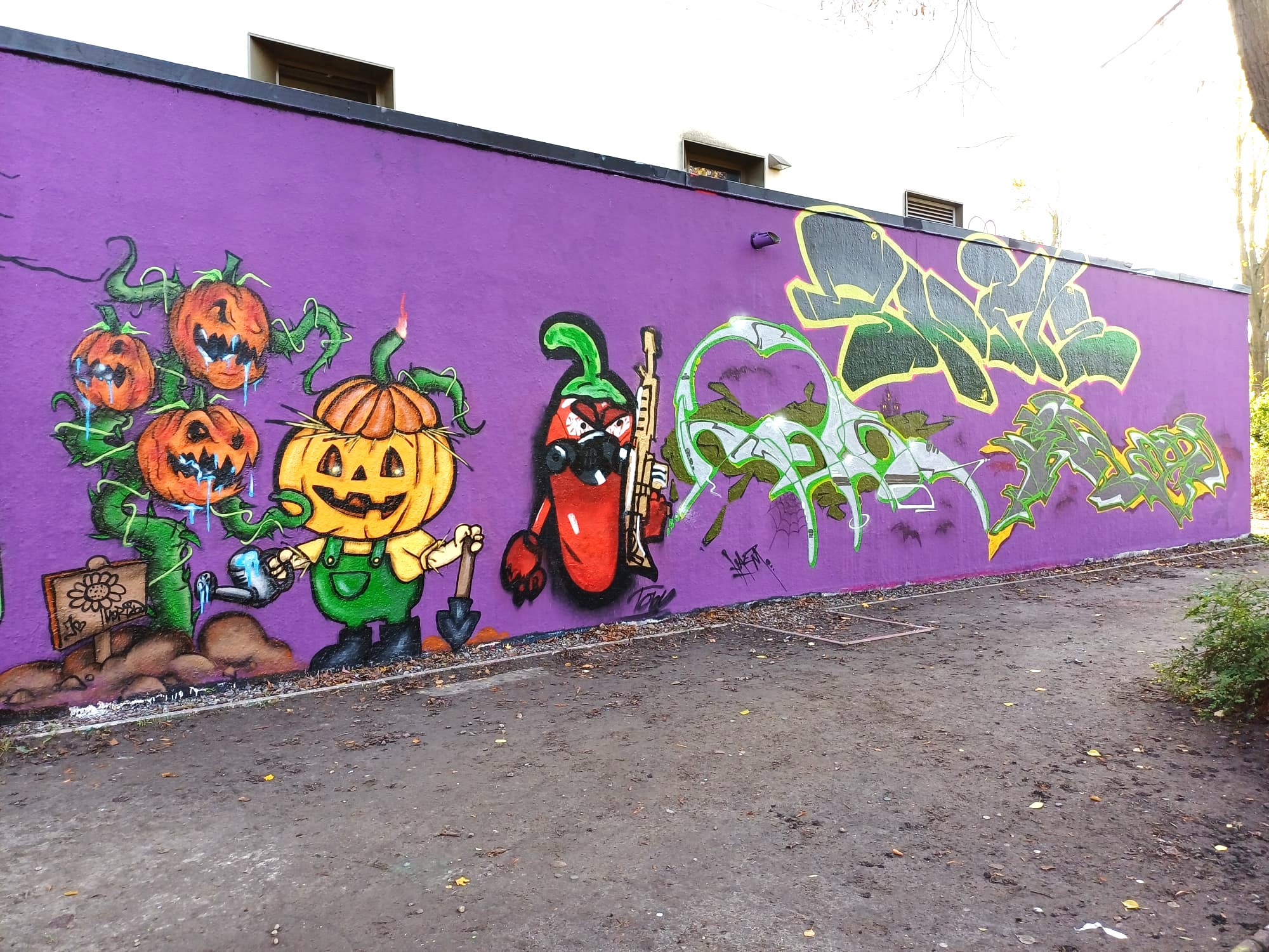 This great Halloween Wall was created by members of the HM CREW aka HIGH MIGHT and the AJA CREW aka AUFJEDEART. The graffiti and characters from left to right were made by HIM, WIEBKE, MEKO, SKIR, MORID, JEY, TOWY, HAEM, SMILE and FEZAR