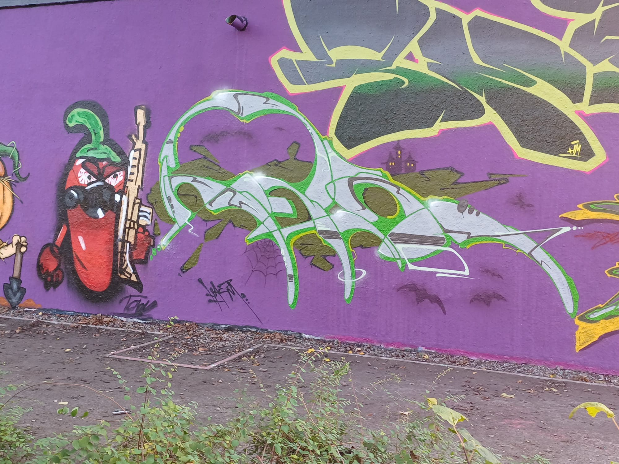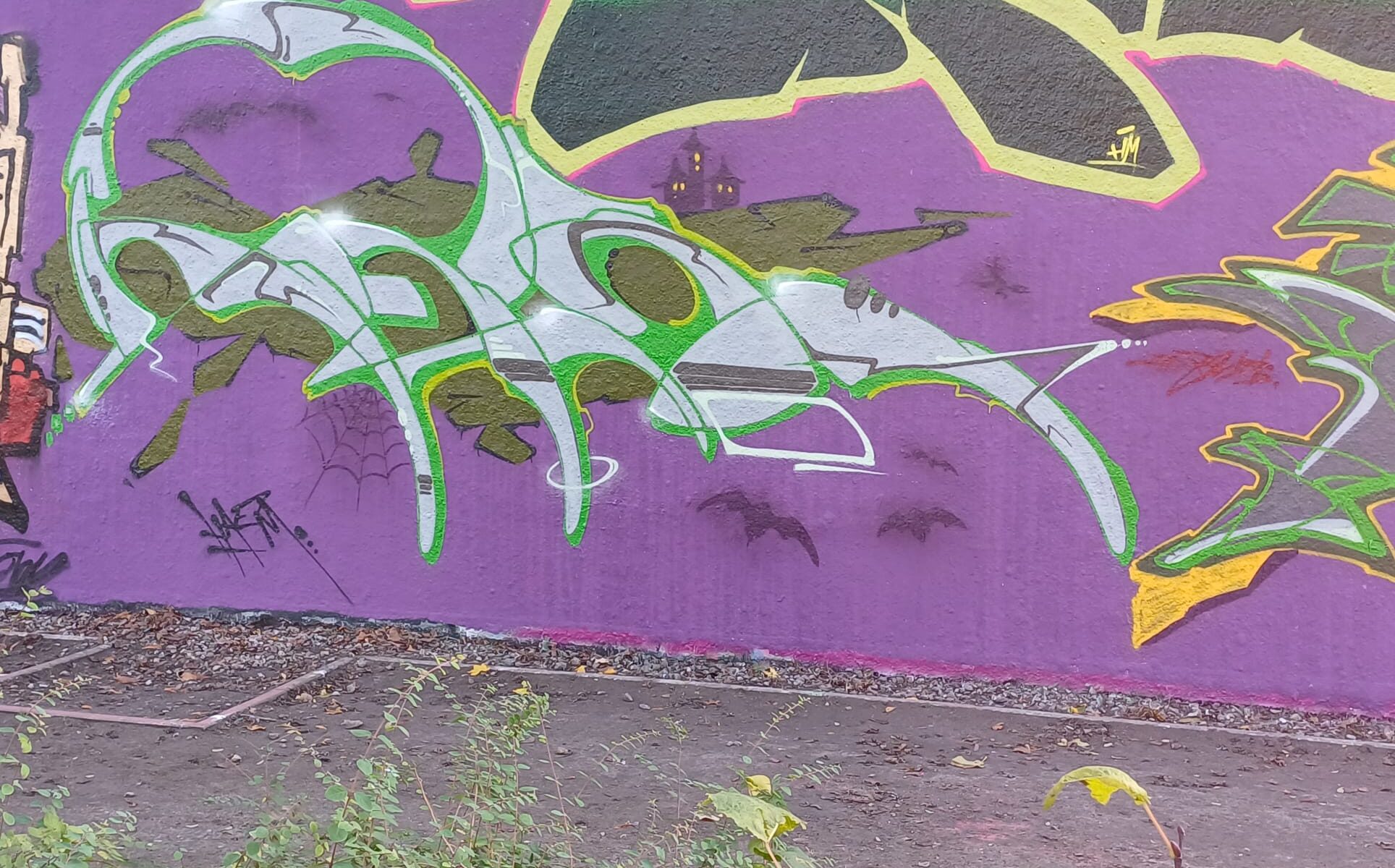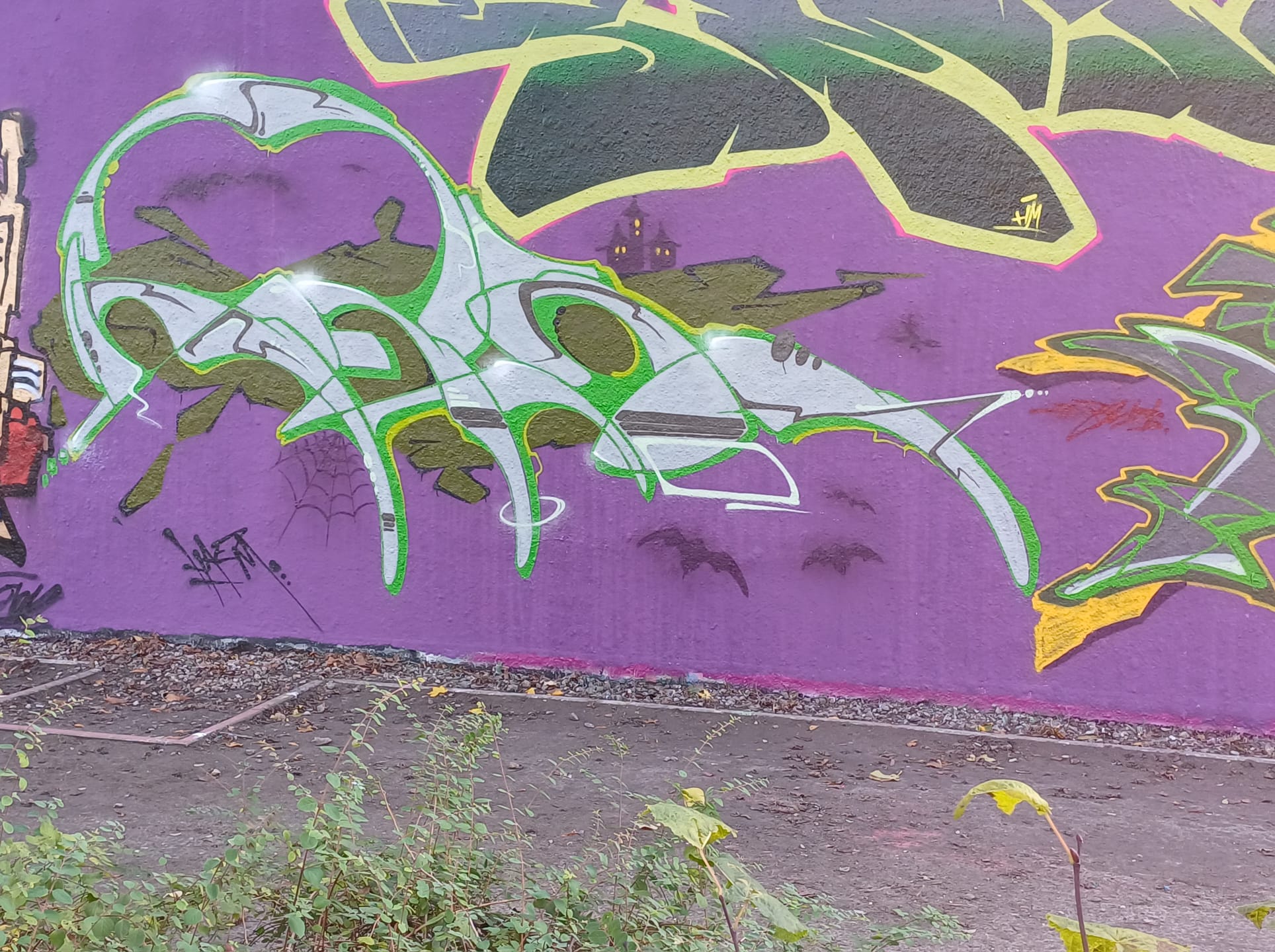 This great Halloween Wall was created by members of the HM CREW aka HIGH MIGHT and the AJA CREW aka AUFJEDEART. The graffiti and characters from left to right were made by HIM, WIEBKE, MEKO, SKIR, MORID, JEY, TOWY, HAEM, SMILE and FEZAR