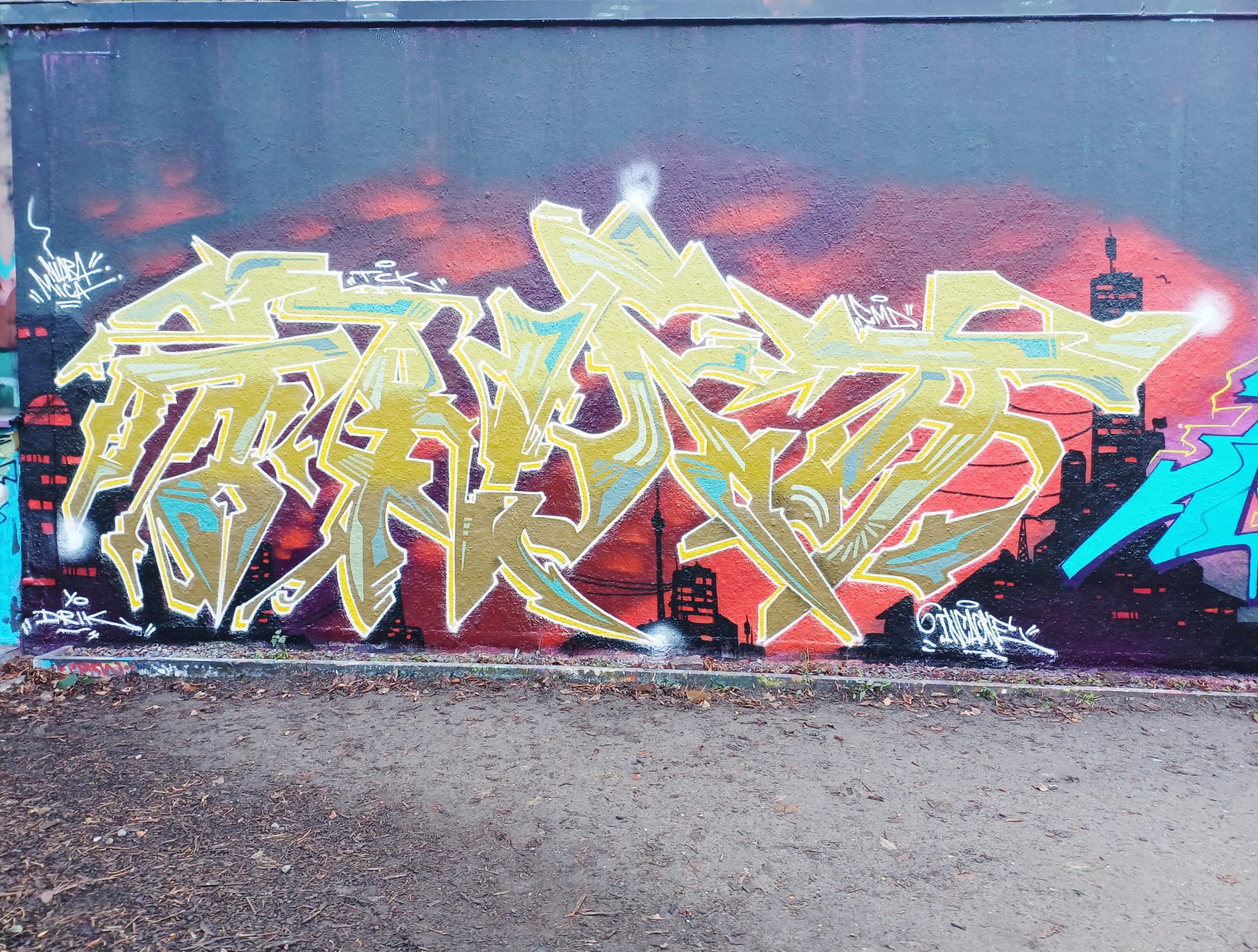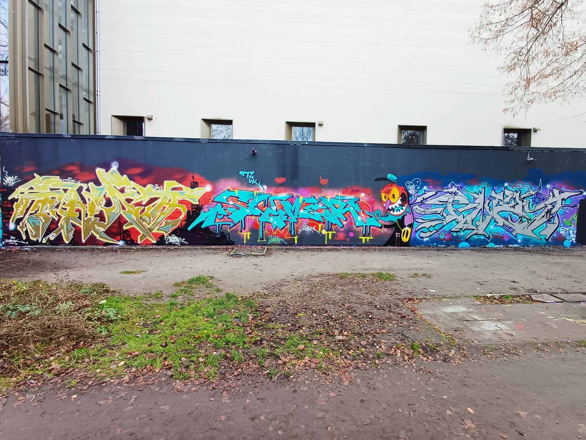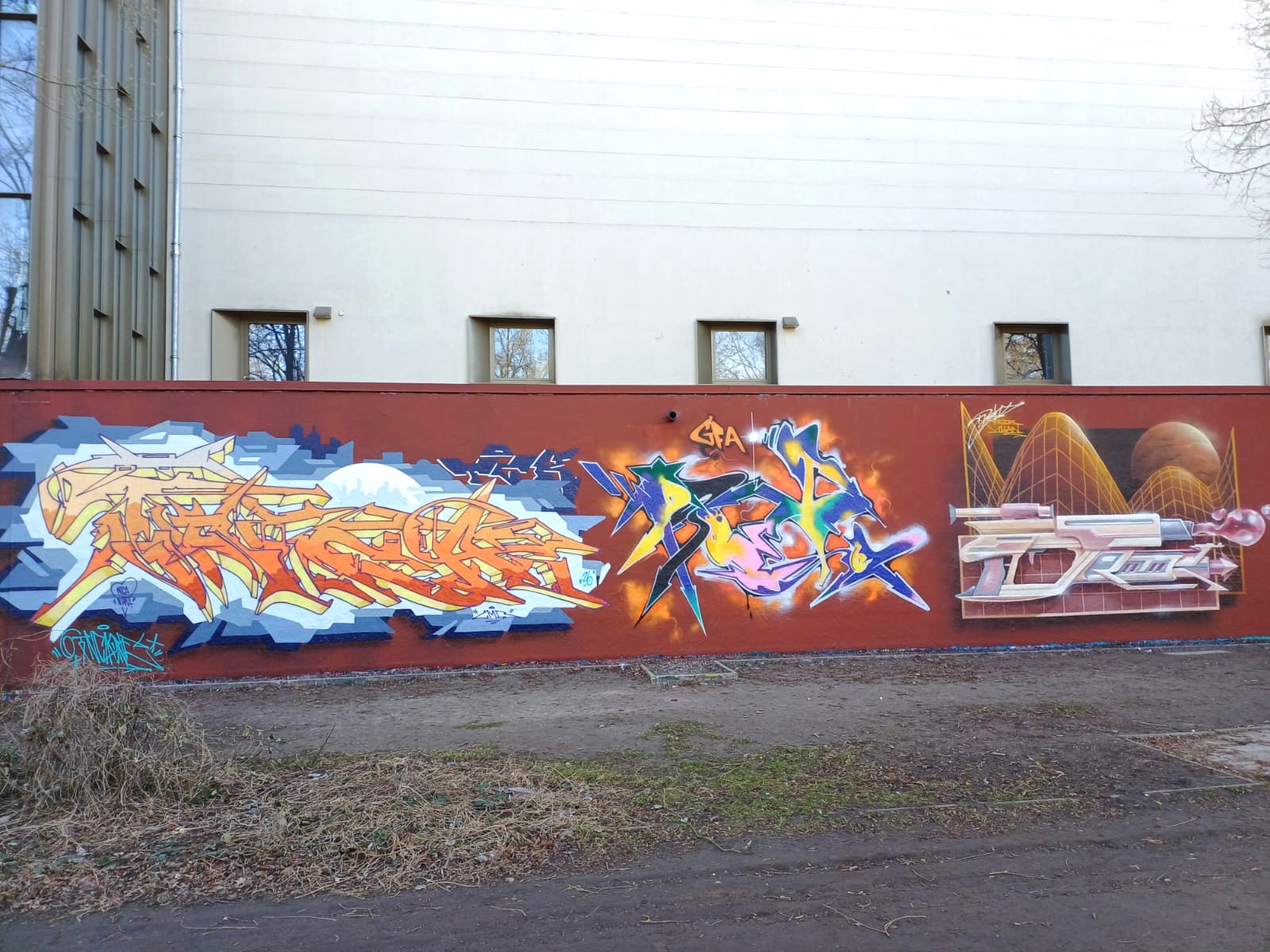 The graffiti on the right is from DEJOE, the character in the middle was made by CORS ONE and the graffiti on the right is from INKA ONE.